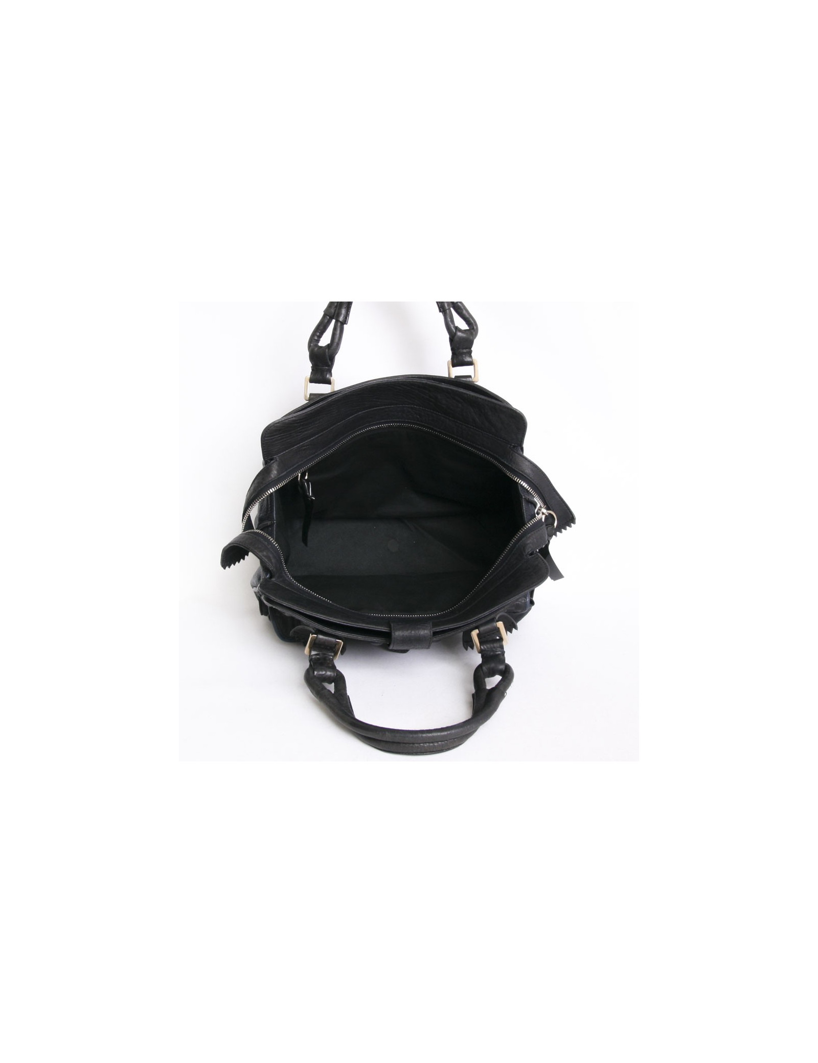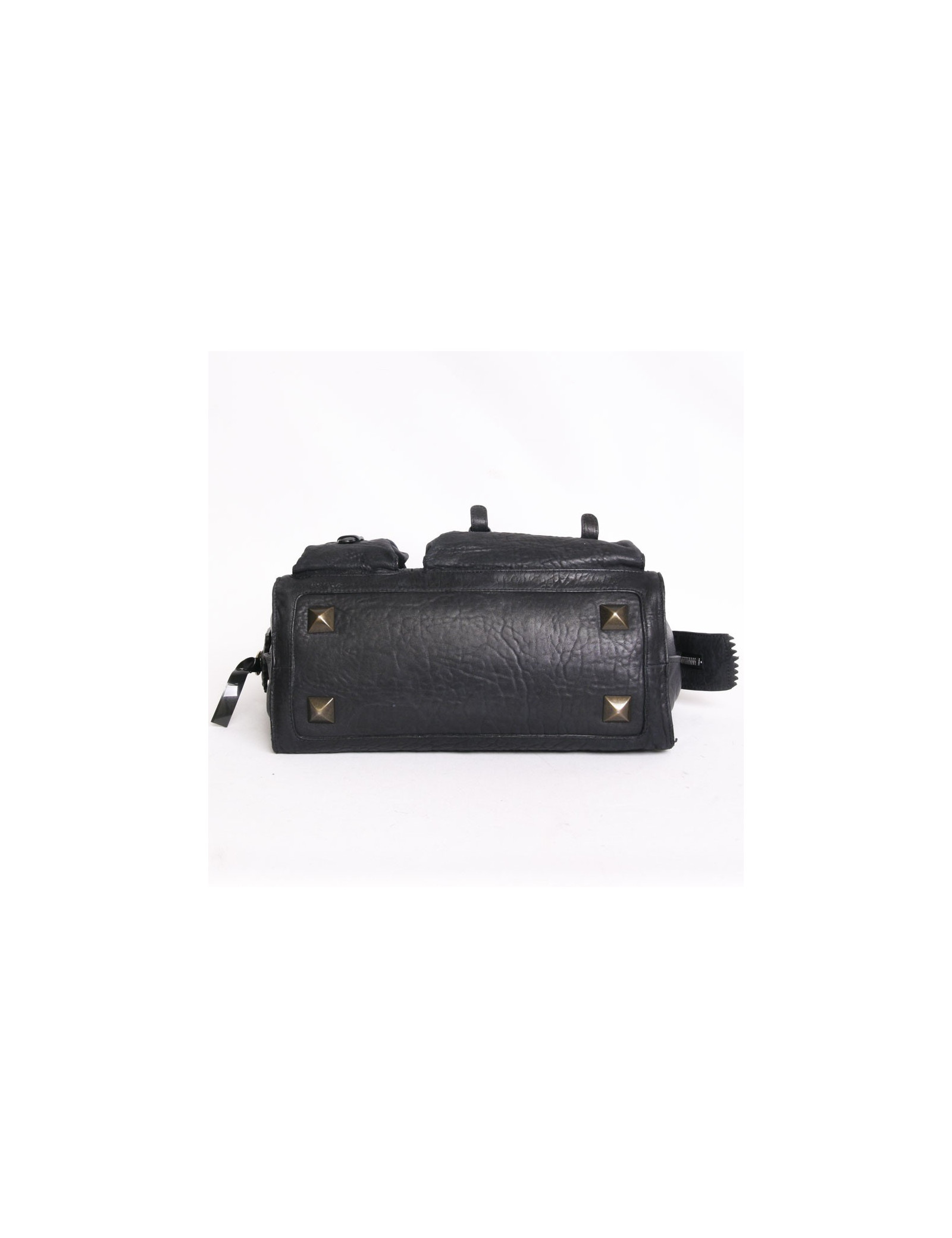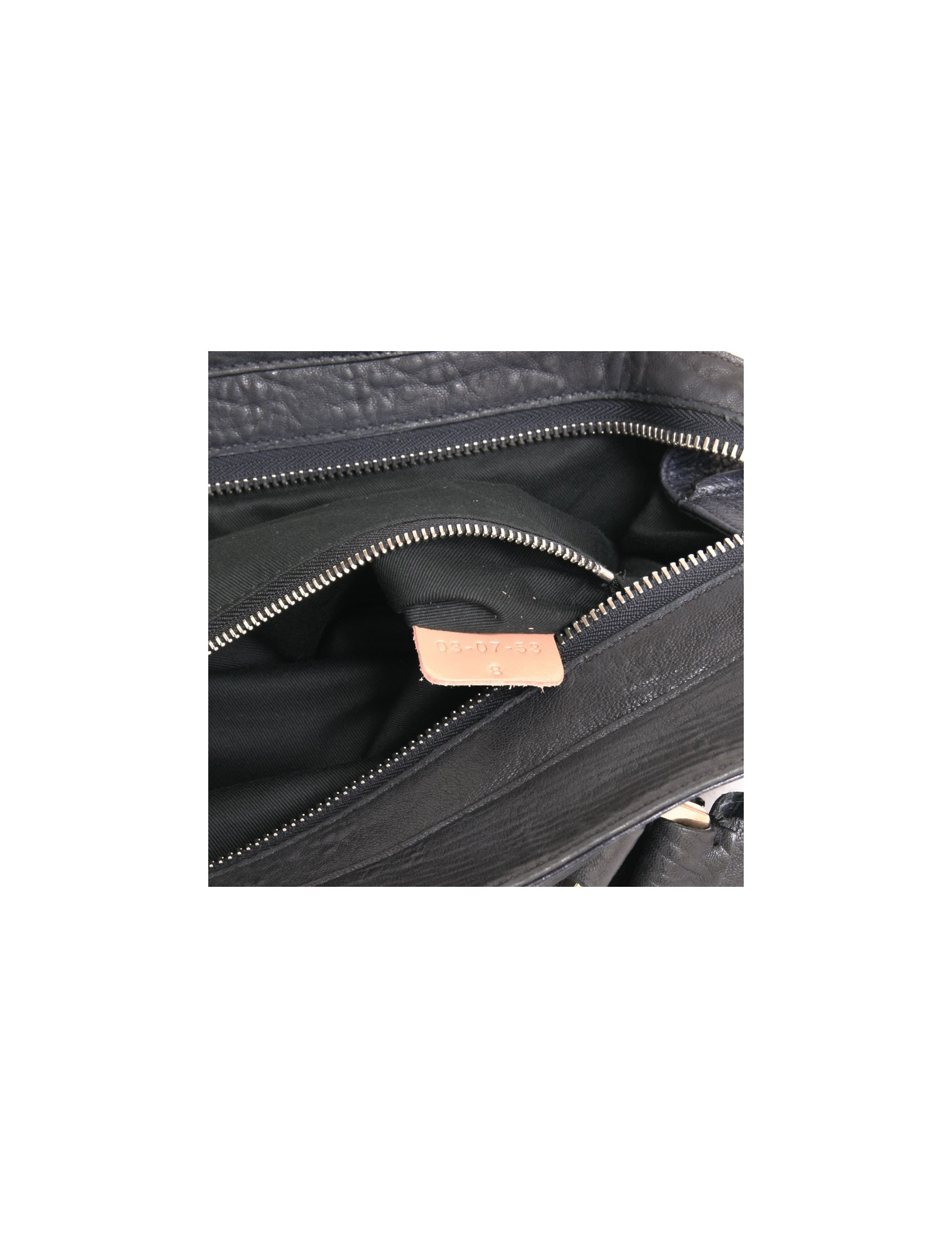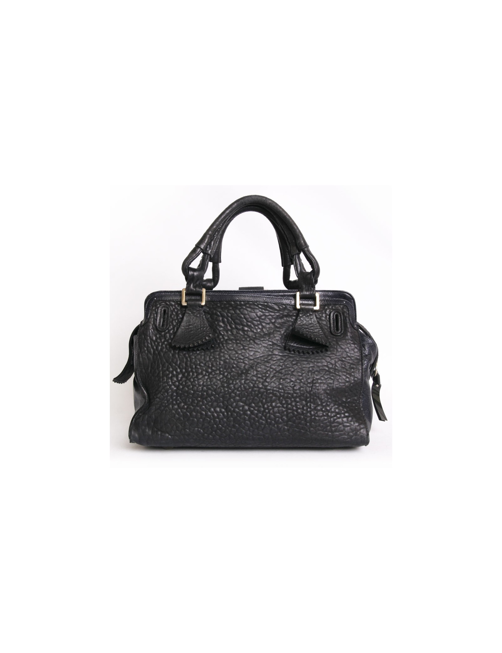 Sac Chloé, modèle Elvire, en cuir éléphant noir et bleu encre . Il y a 3 compartiments dont 2 à l'extérieur et un zippé. Devant il y a 2 poches et 2 fentes.Il y a en décoration des clous en cuir bleu encre. Il se porte également à l'épaule. l'intérieur est en toile noir avec un poche zippée.