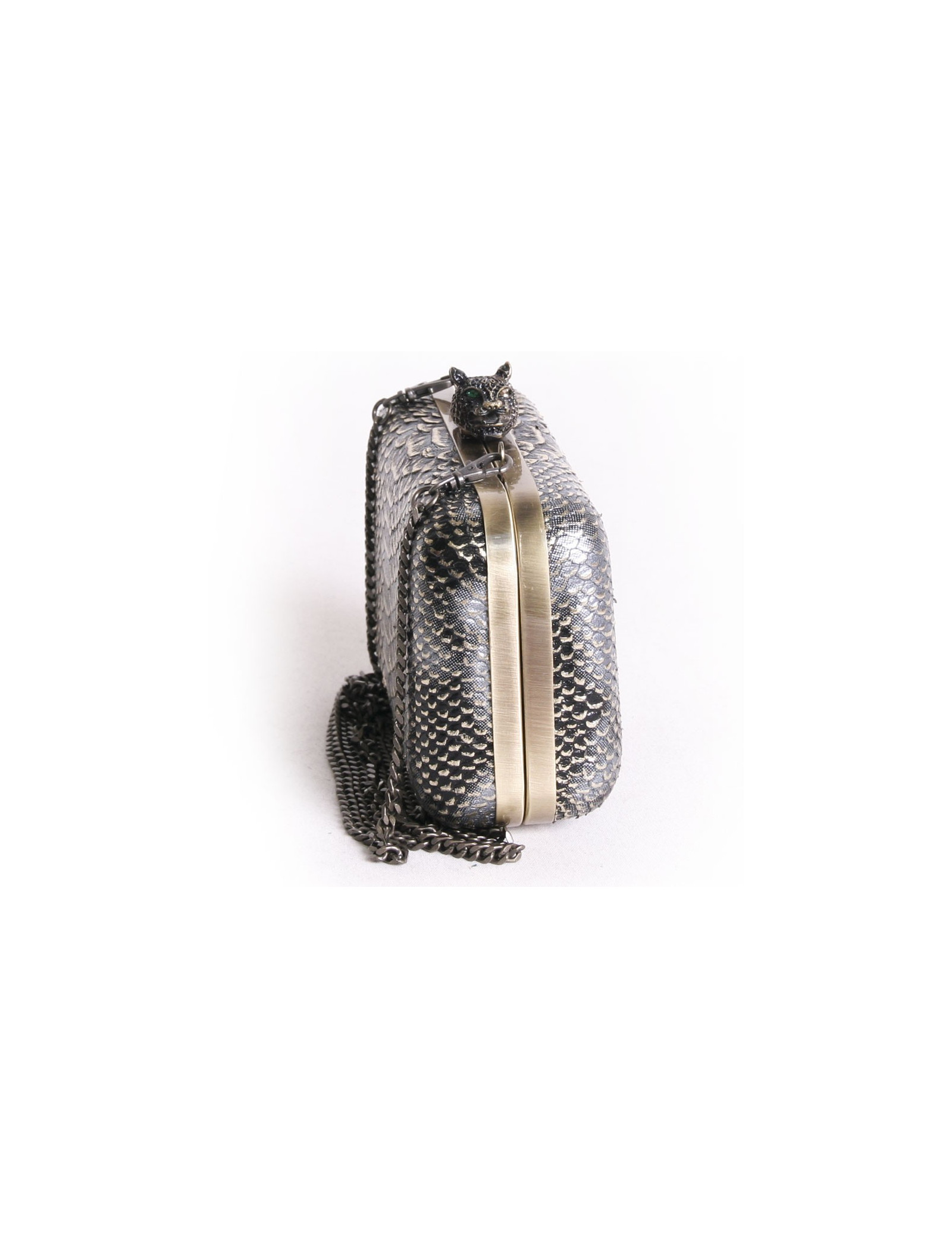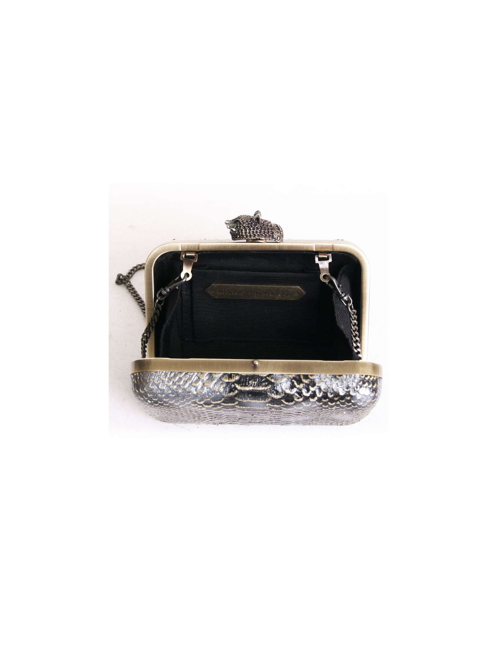 Sac pochette House of Harlow 1960, en cuir façon serpent noir et doré. Très chic ! La bijouterie est de couleur cuivrée. La bandoulière chaîne est amovible. Il n'a jamais été porté. Le fermoir représente une tête de tigre.