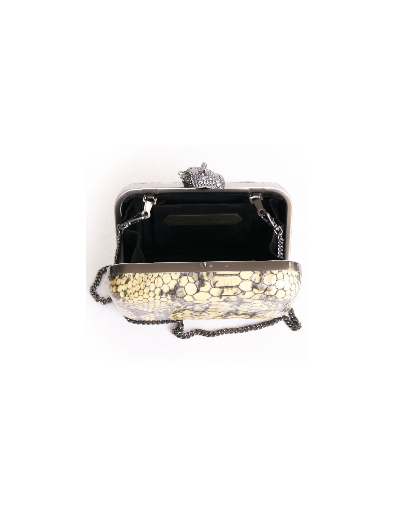 Pochette House of Harlow 1960, façon serpent verni à dominante jaune et noire. Bijouterie cuivrée et chaîne ruthénium amovible permettant de porter croisé la pochette . Jamais portée. Le fermoir représente une tête de tigre avec des yeux vert émeraude en cristal. La chaine peut être retirée de la pochette et la transformer en minaudière.