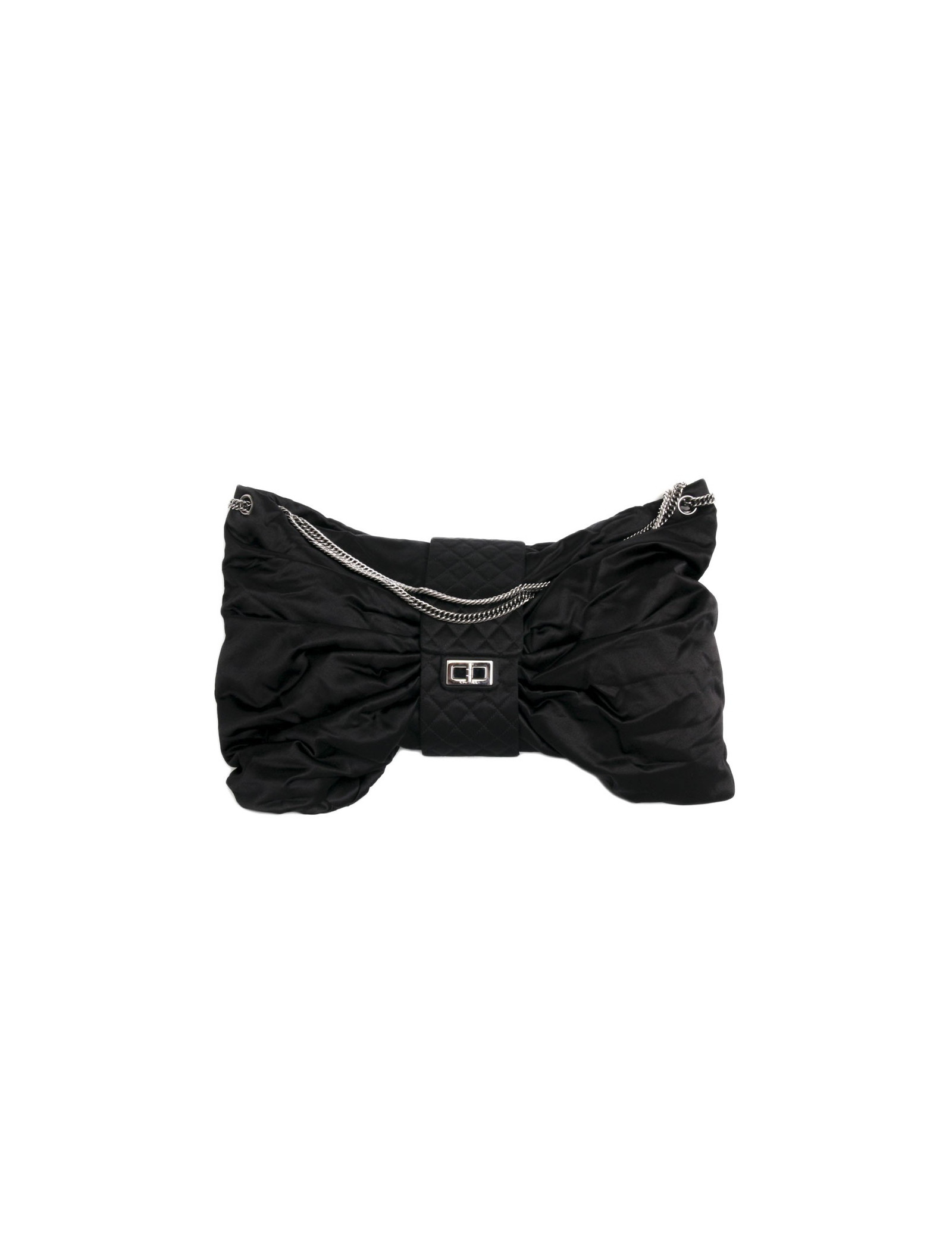 Ce joli sac CHANEL est en satin duchesse noir. Il est drapé en soie, en forme de noeud. Il est Elégant et maniable, idéal en soirée. Il a un fermoir 2.55 siglé CHANEL, relié à une large bande de satin matelassé. Il se porte à l'épaule ou en crossover. La bijouterie est en métal argent palladié. L'intérieur est en satin gris avec une poche zippée. Il est en parfait état , très légère usure sur le bas gauche.