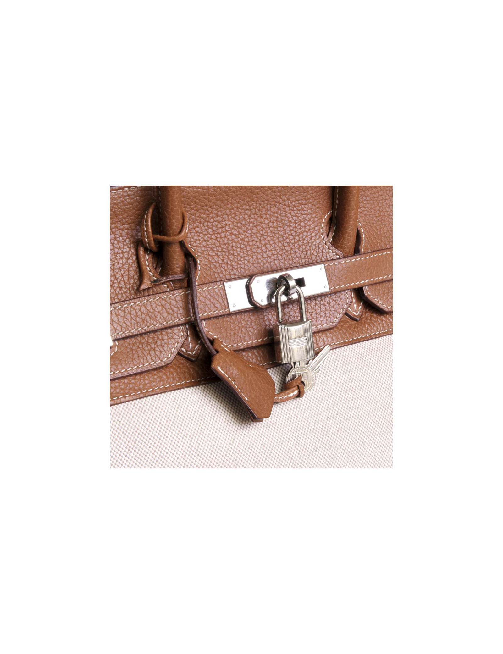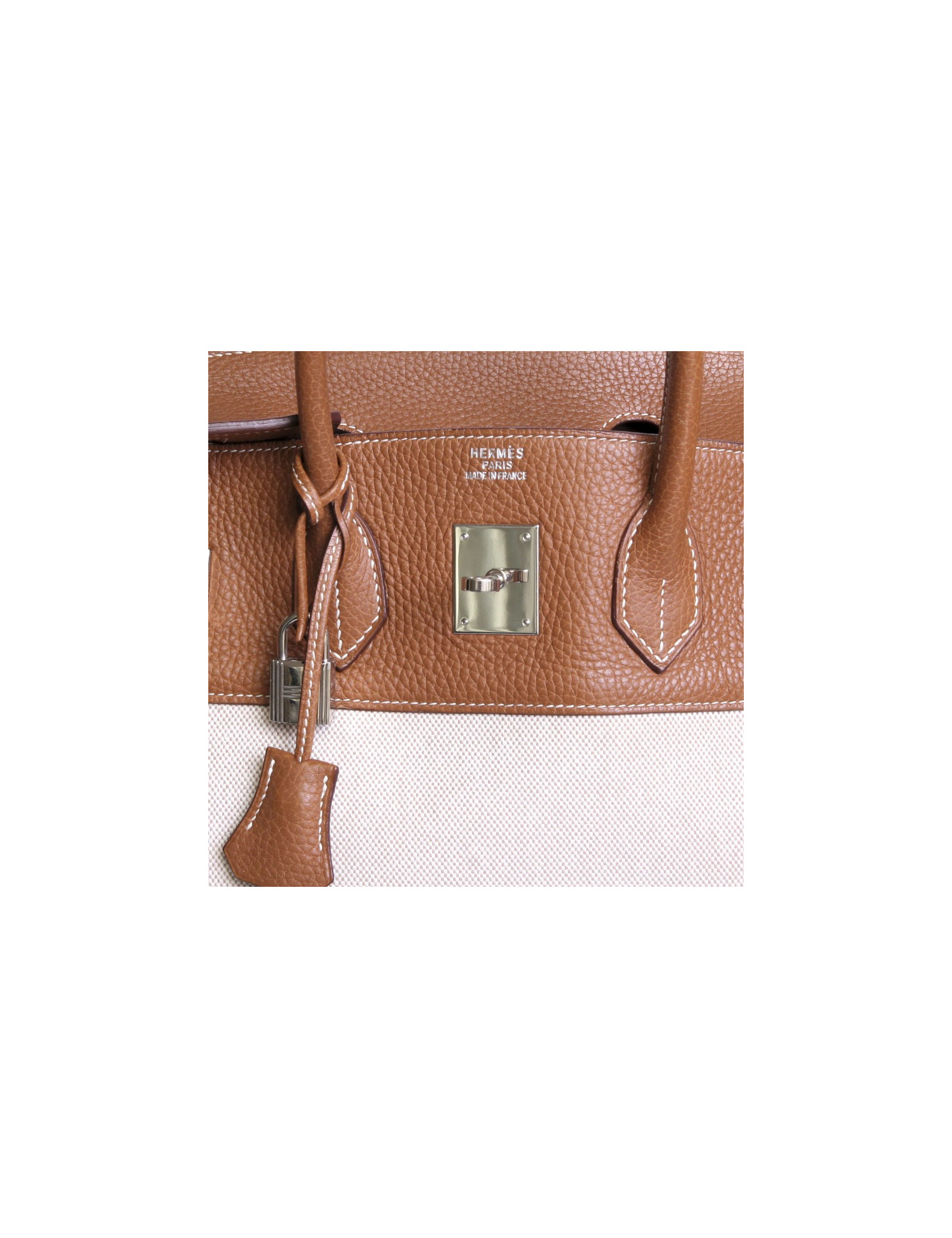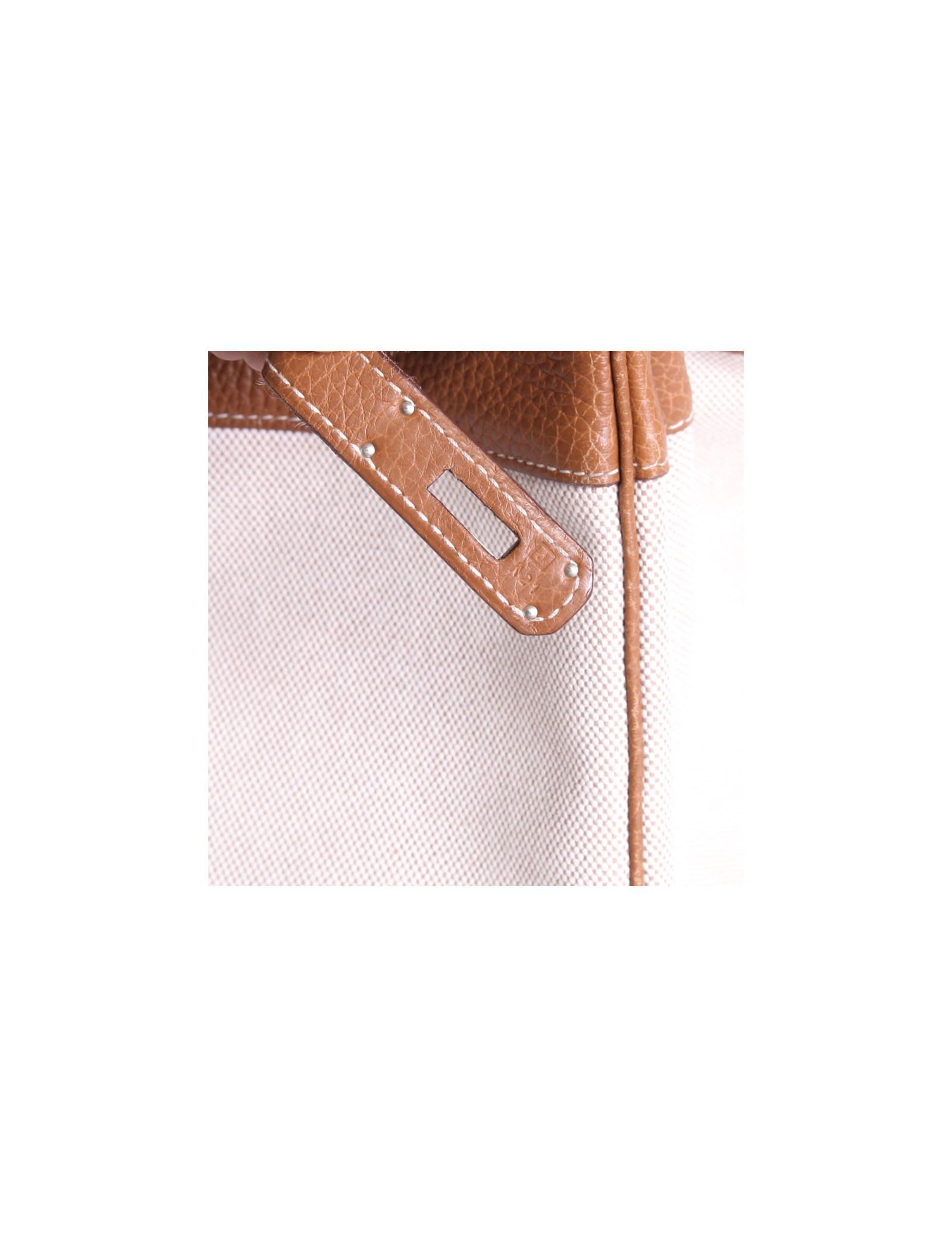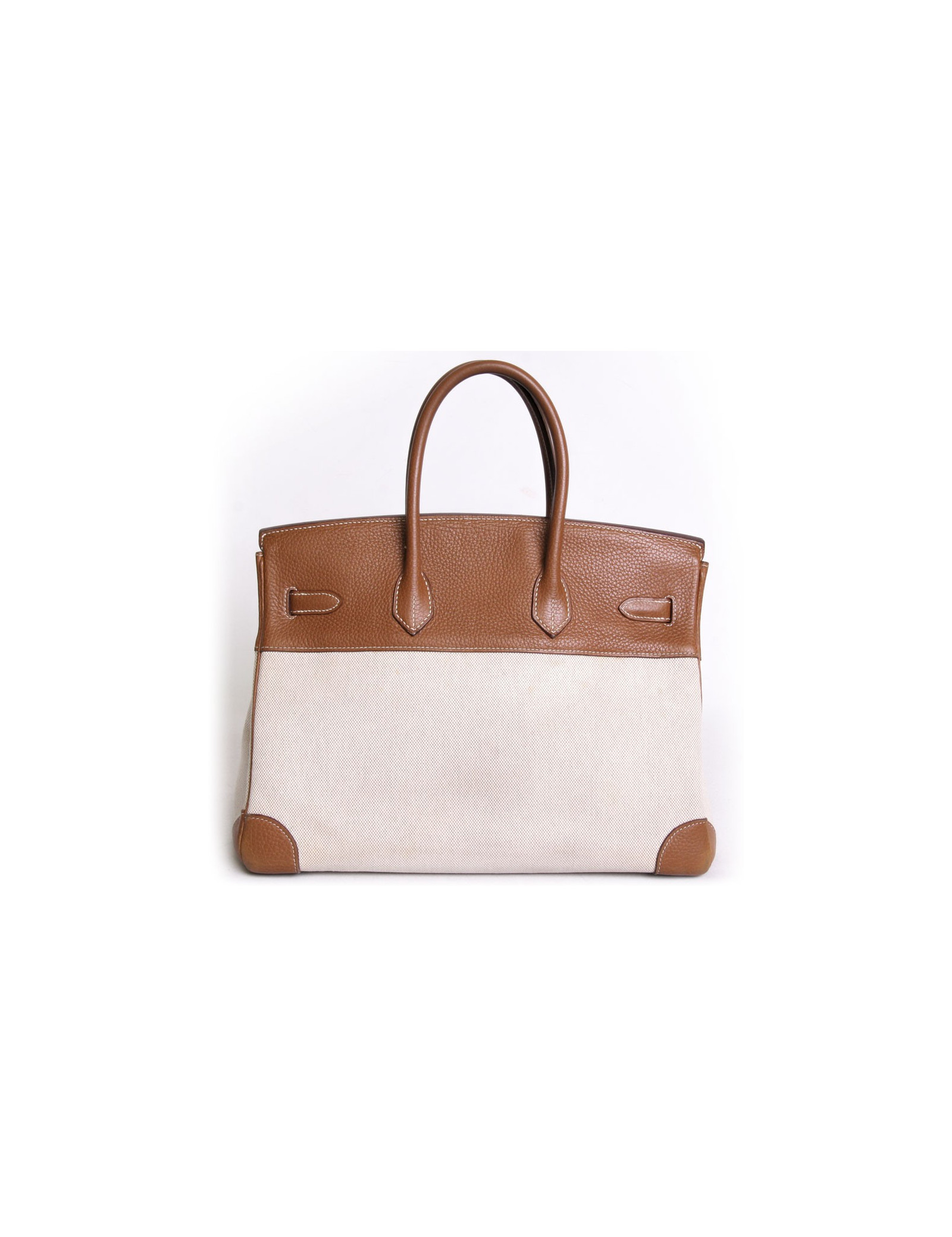 Birkin 35 en toile couleur naturelle et cuir togo gold.