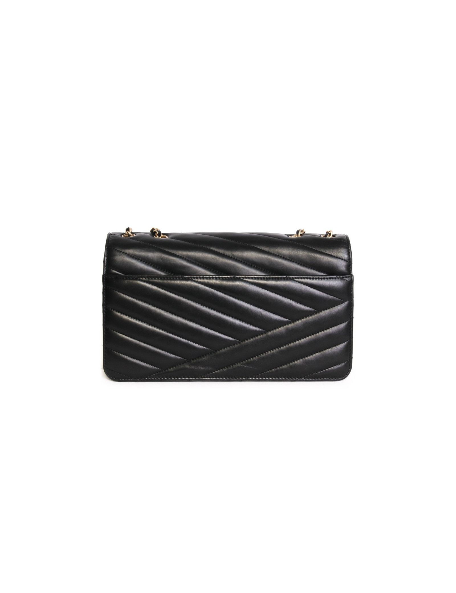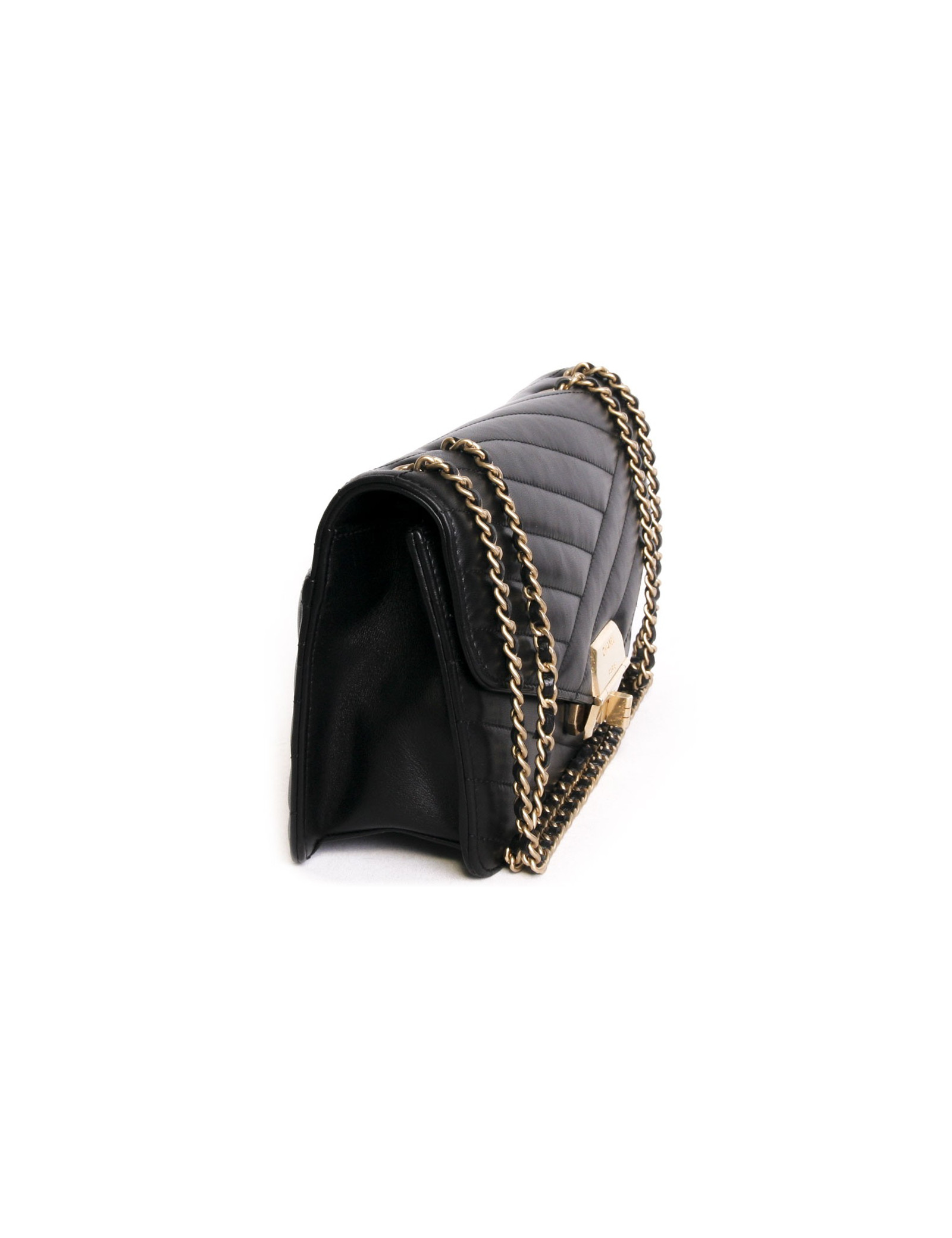 Se porte à l'épaule ou en crossover grâce à un chaîne ajustable de 110 cm. Le sac comporte un poche extérieure et l'intérieur en tissu beige comporte trois poches intérieures. La bijouterie est en or vieilli.