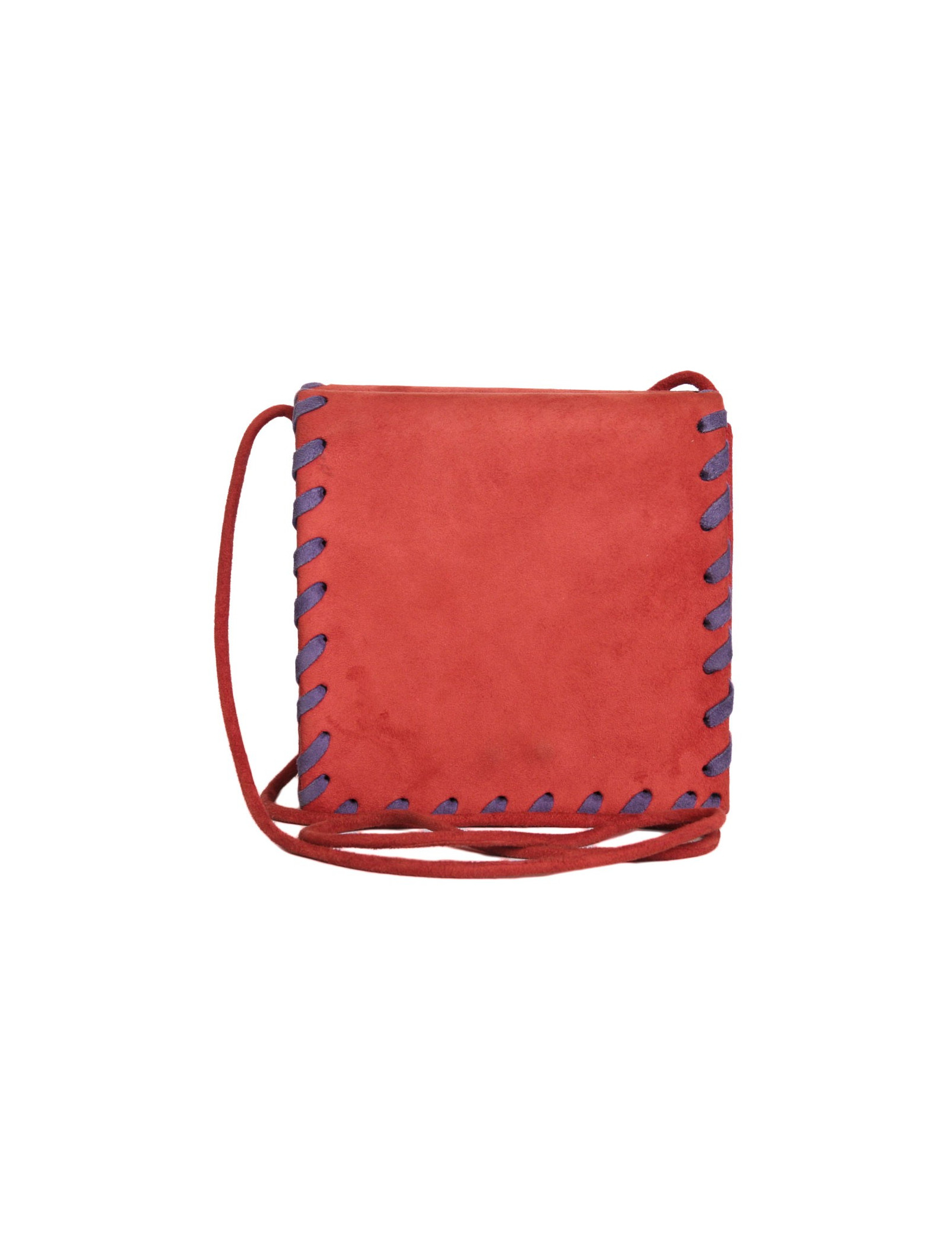 Pochette YVES SAINT LAURENT en veau velours rouge,vintage. Double ouverture. Intérieur en veau velours violet. Poche intérieur. Fermeture par bouton pression doré. Porté épaule ou crossover à l'aide d'une bandoulière rouge de 105 cm.