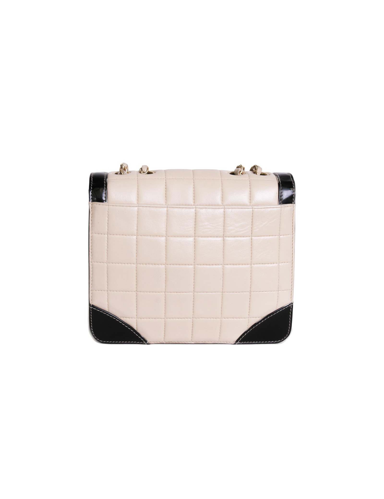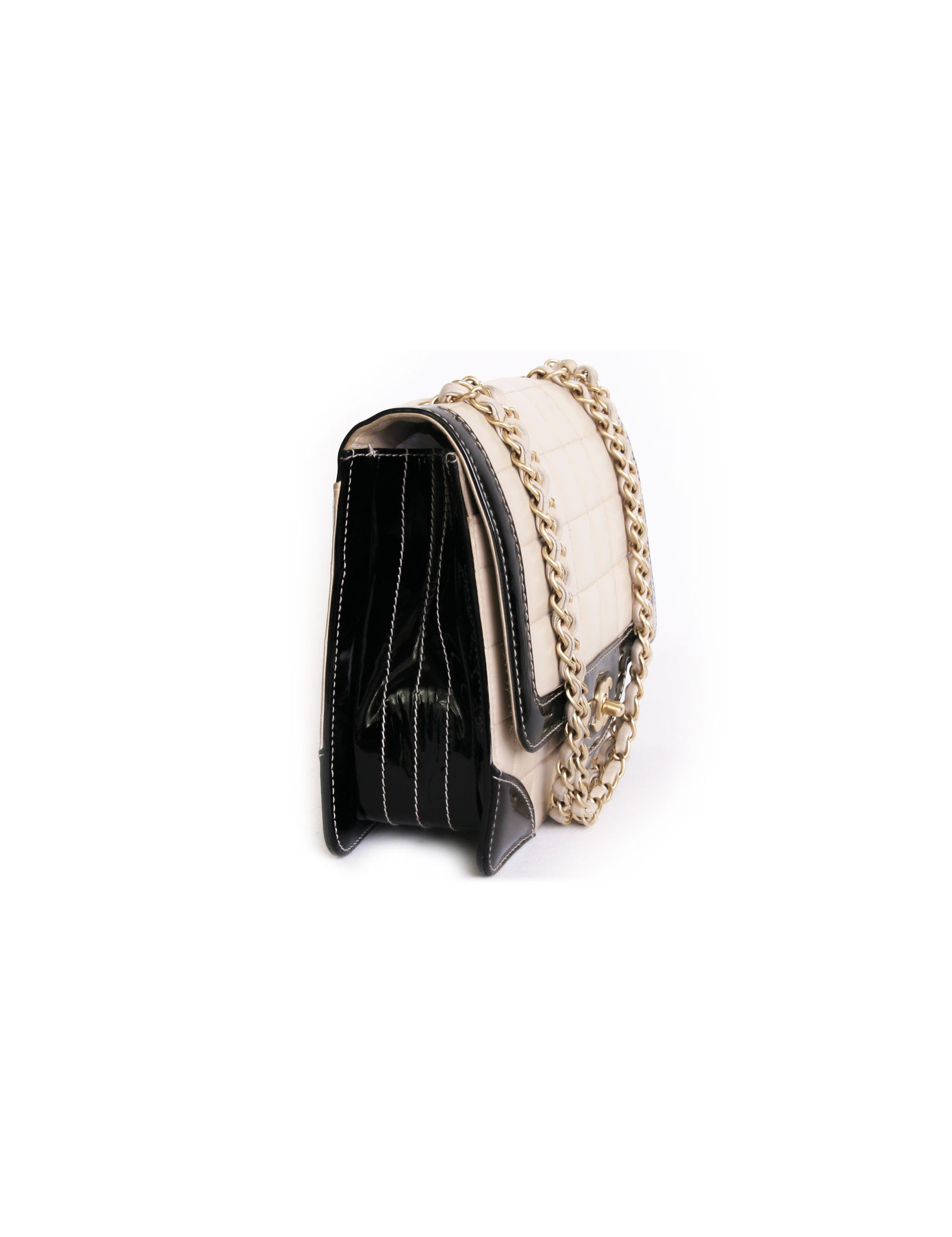 Fermeture "double C" par pivot, contours en cuir noir verni.