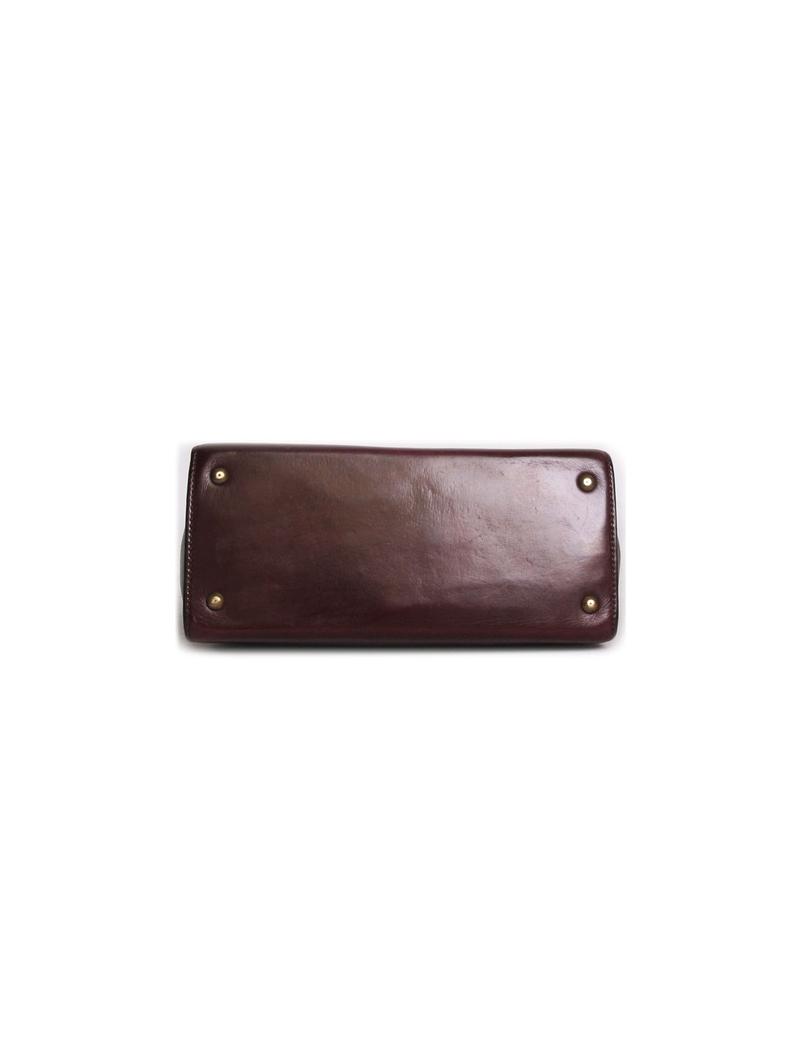La bijouterie est en laiton doré, le sac conserve ses attributs: tirette, clochette, clés, et cadenas. Il se porte à l'épaule grâce à une anse en cuir de 50 cm. Lettre E dans un rond.