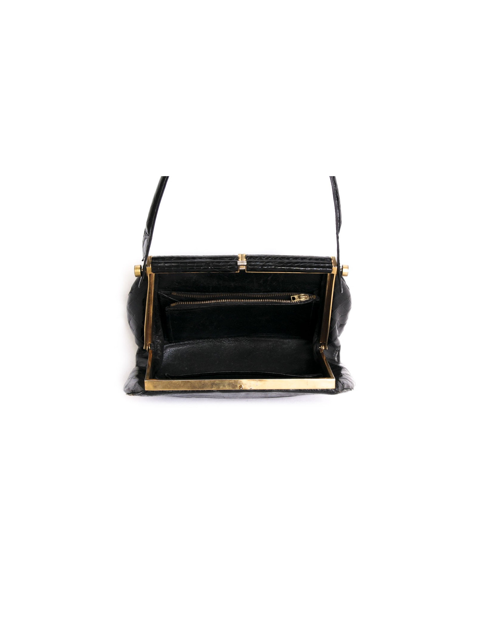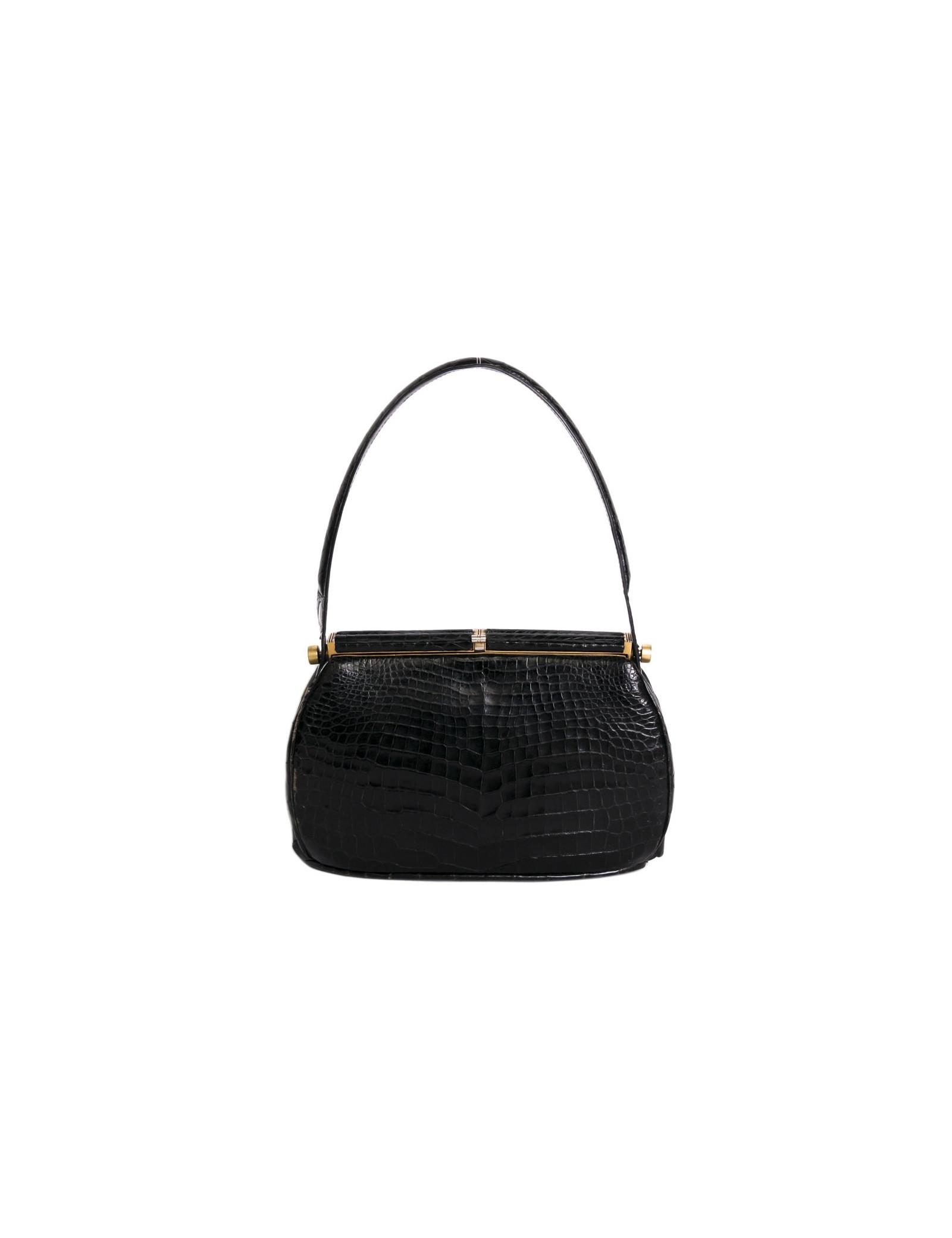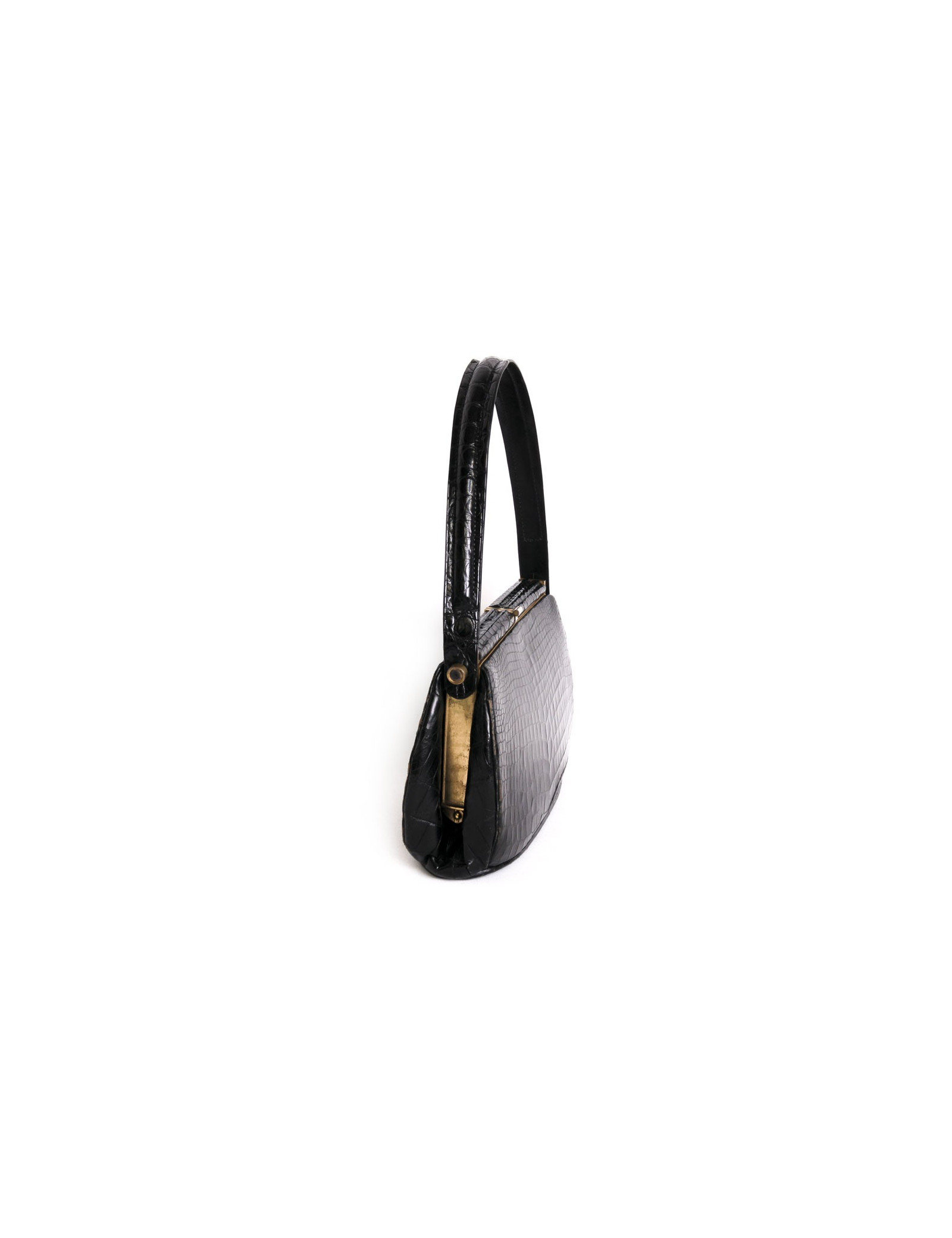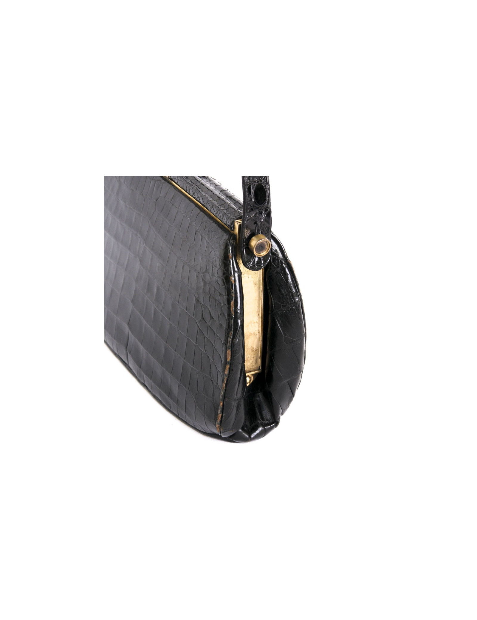Sac des années 40, sans marque en croco noir en très bon état. bijouterie dorée.