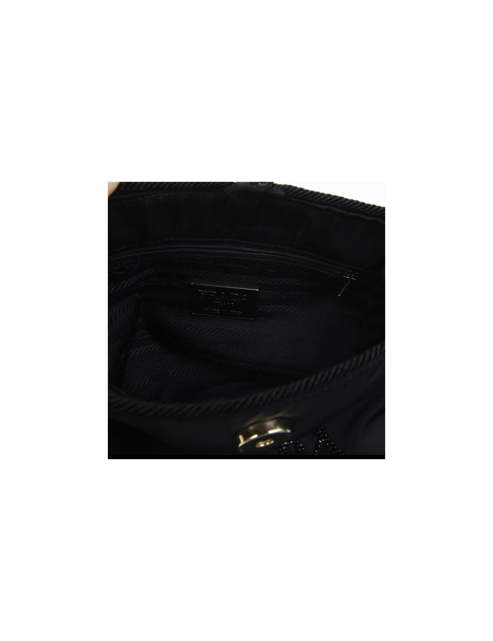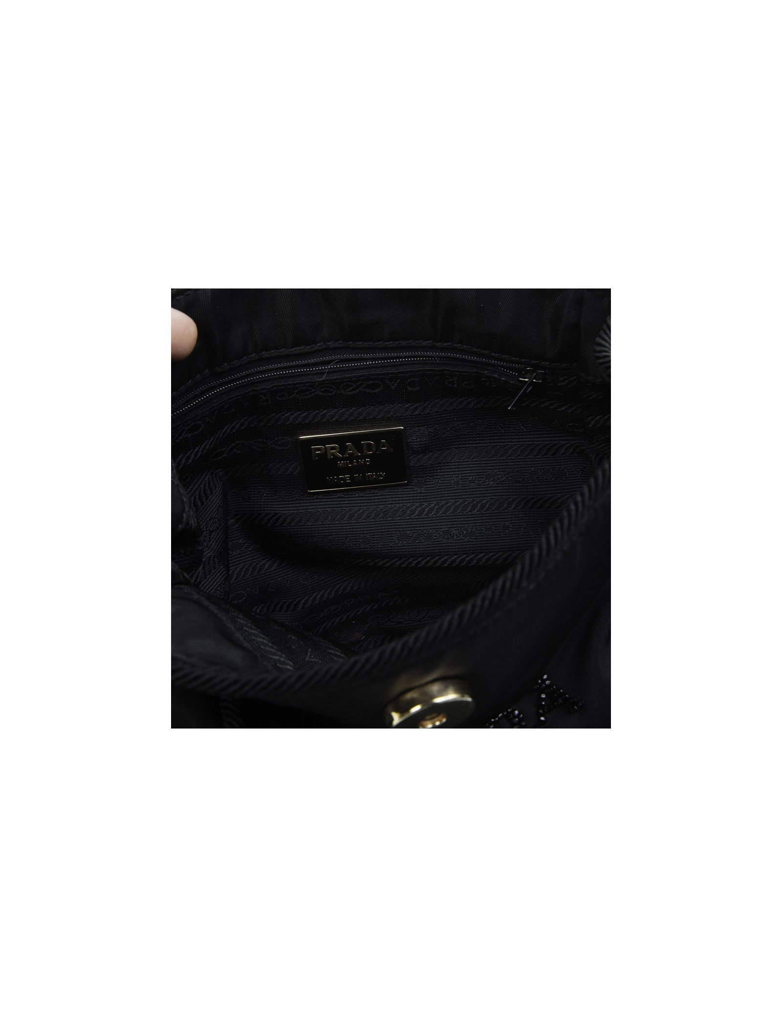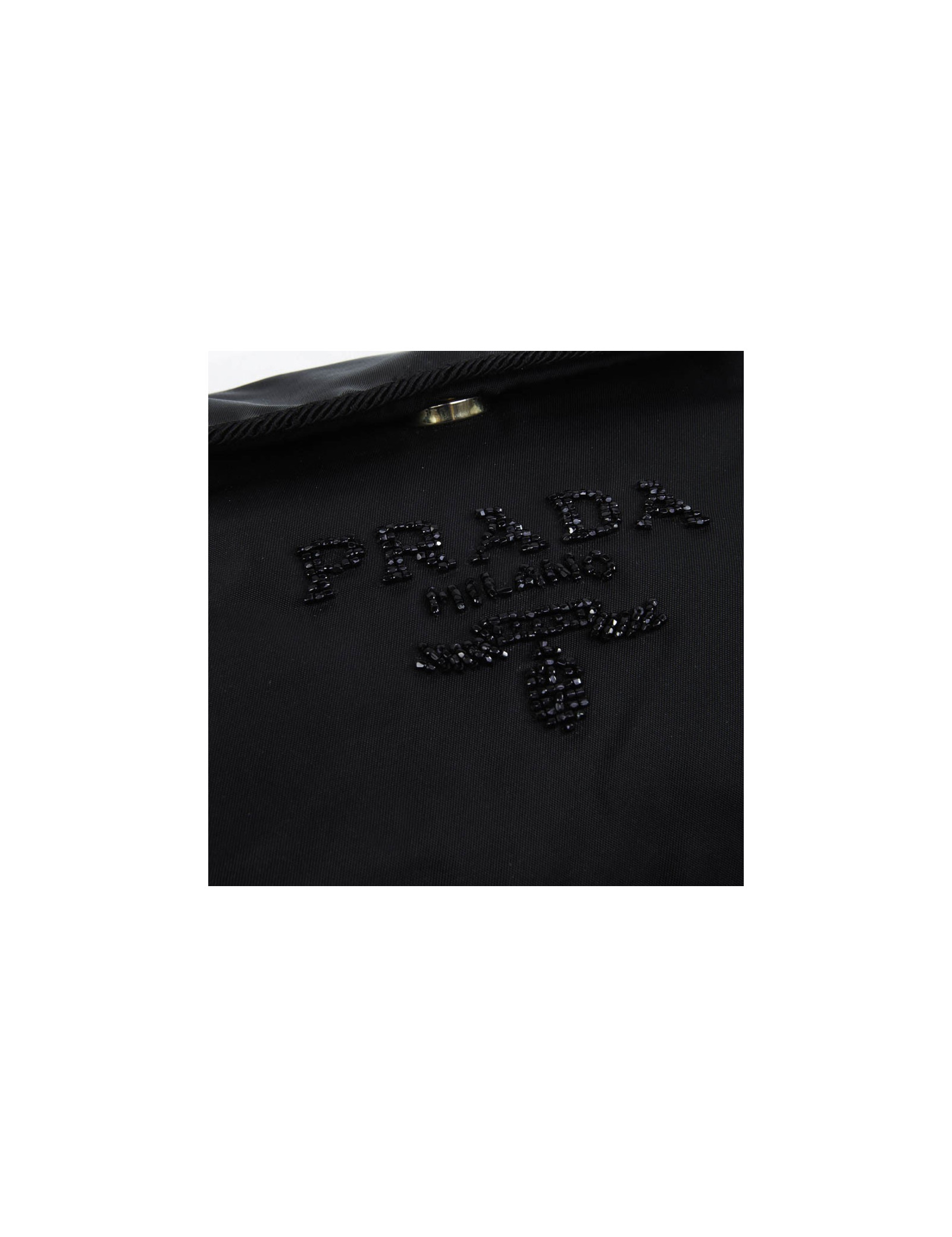 Ravissant sac du soir Prada en toile noire avec des broderies en sequins noirs brillants. Fermeture par bouton pression. L'intérieur est en toile monogram noir avec une petite poche zippée. Il se porte à l'épaule ou en crossover. En très bon état.