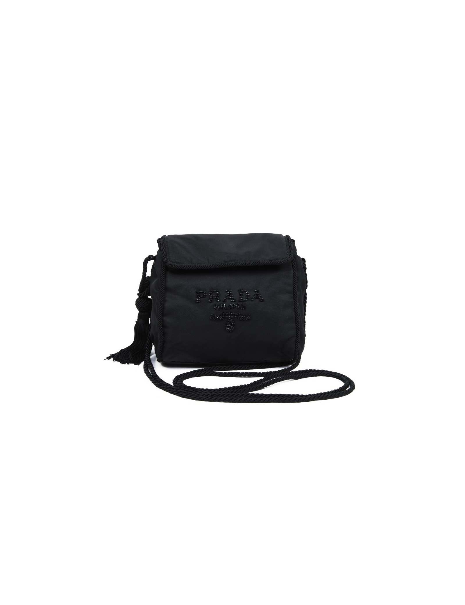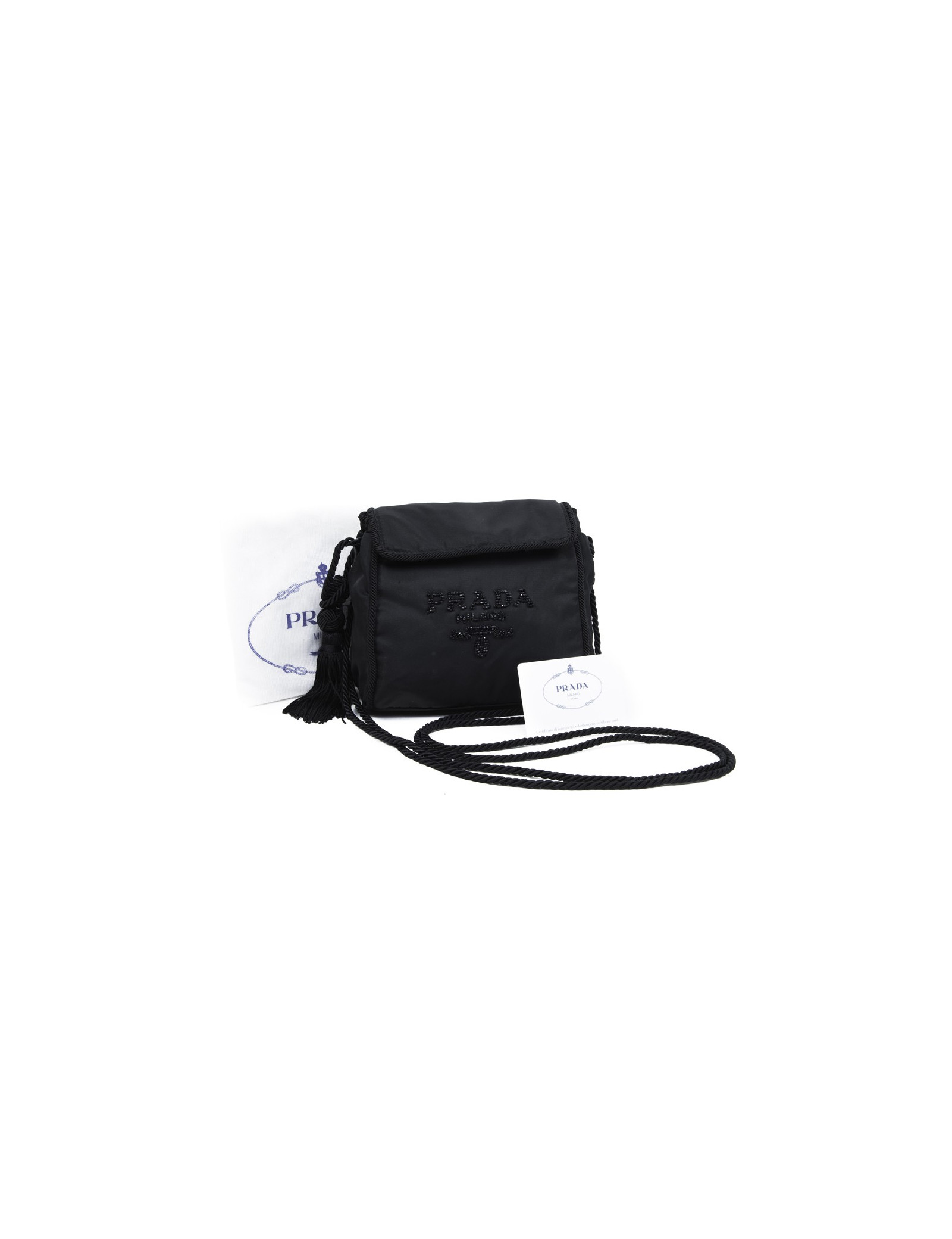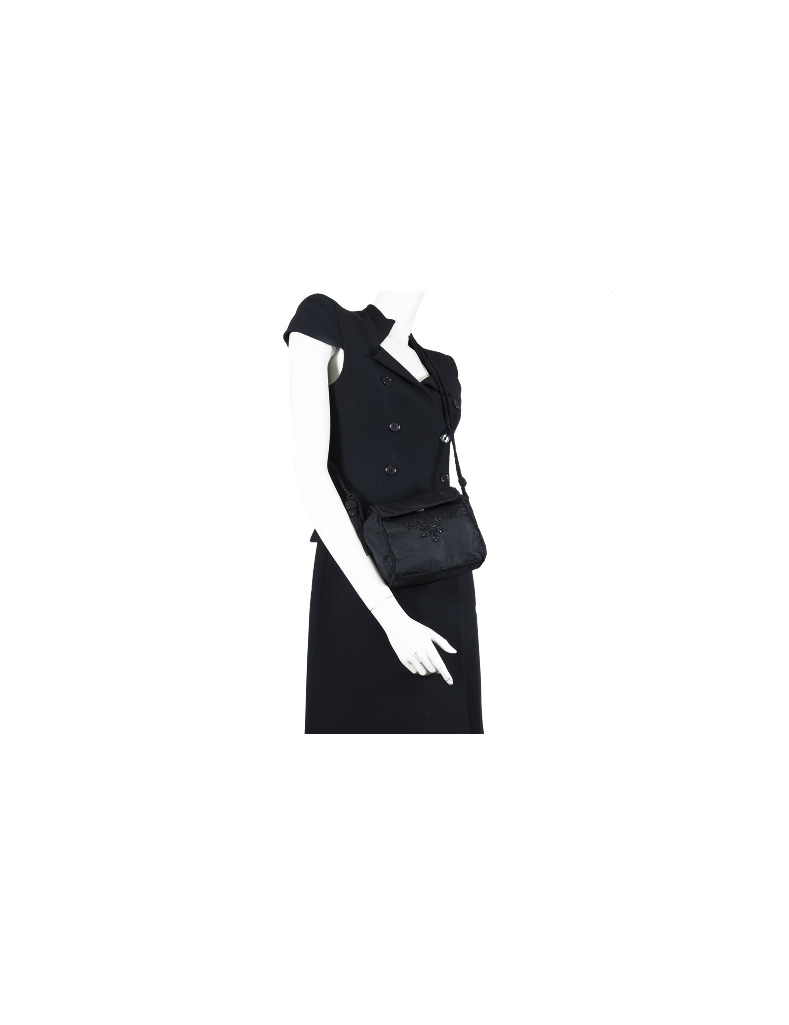 Ravissant sac du soir Prada en toile noire avec des broderies en sequins noirs brillants. Fermeture par bouton pression. L'intérieur est en toile monogram noir avec une petite poche zippée. Il se porte à l'épaule ou en crossover. En très bon état.