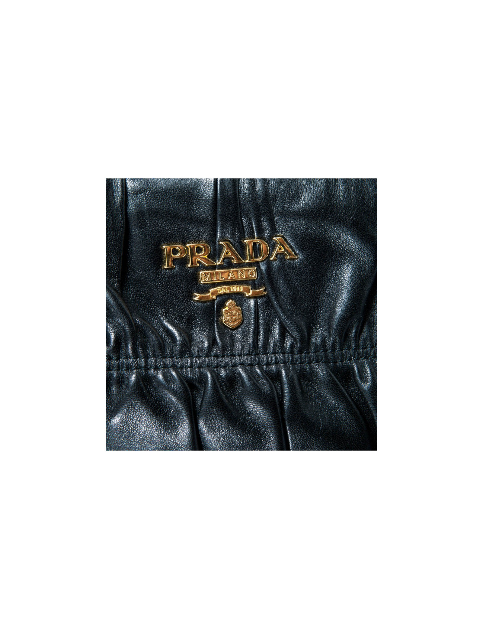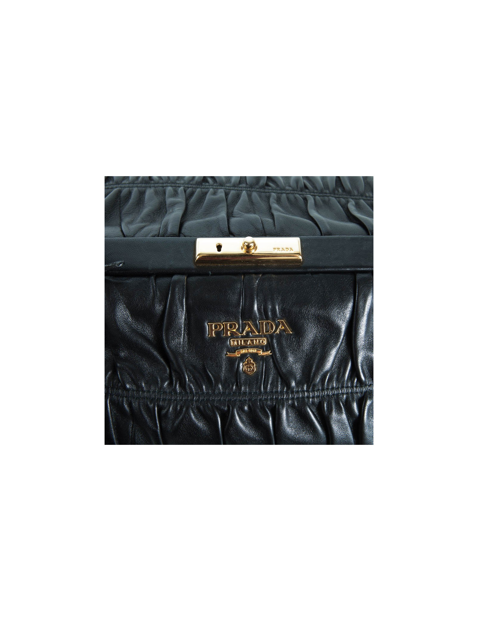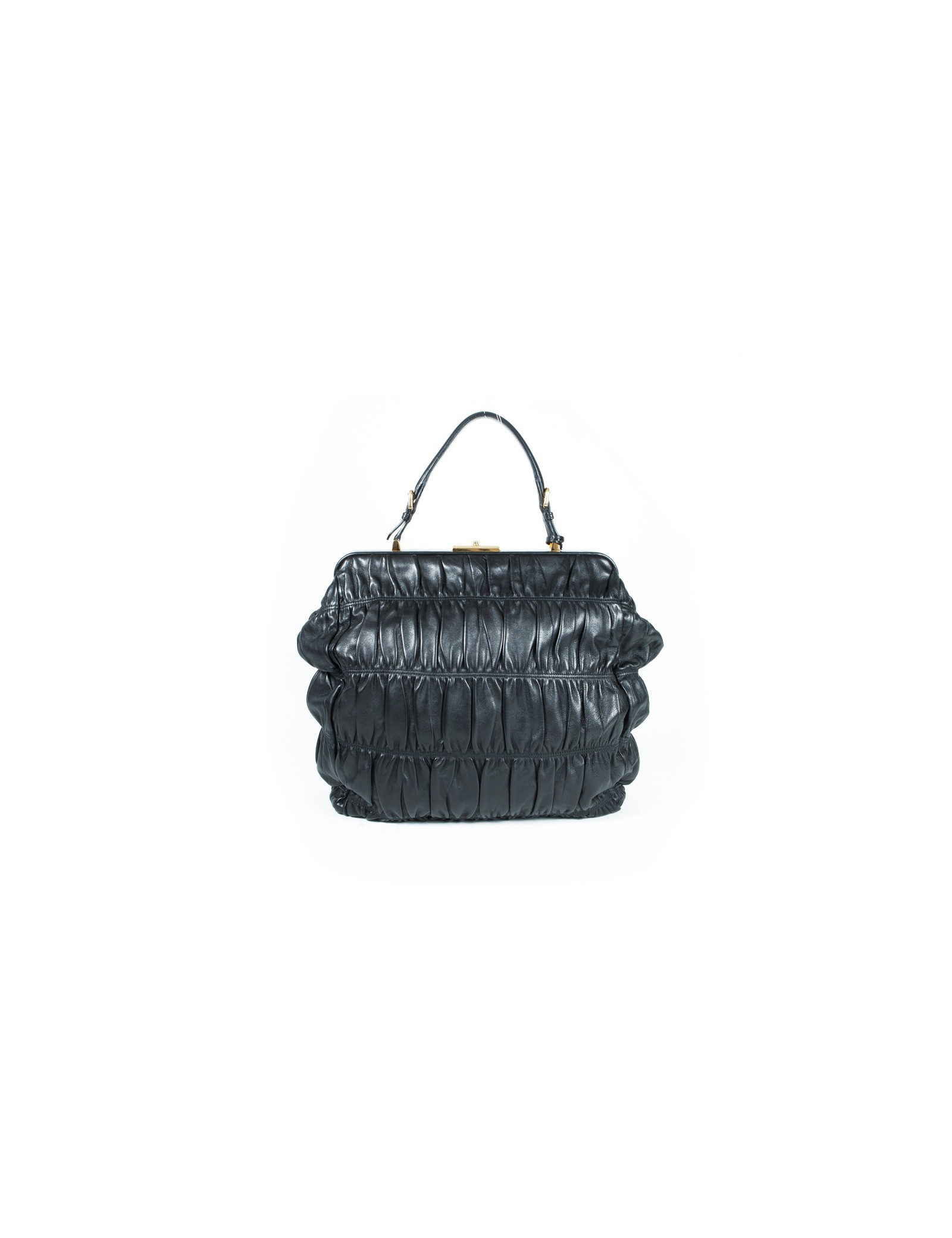 Sac Prada en cuir noir plissé. La bijouterie est en métal doré. Il se ferme à l'aide d'un bouton pression et également à l'aide d'une clef si vous le désirez pour plus de sécurité. L'intérieur est en toile noire monogram avec une grande poche zippée. Il se porte au bras. En très bon état.