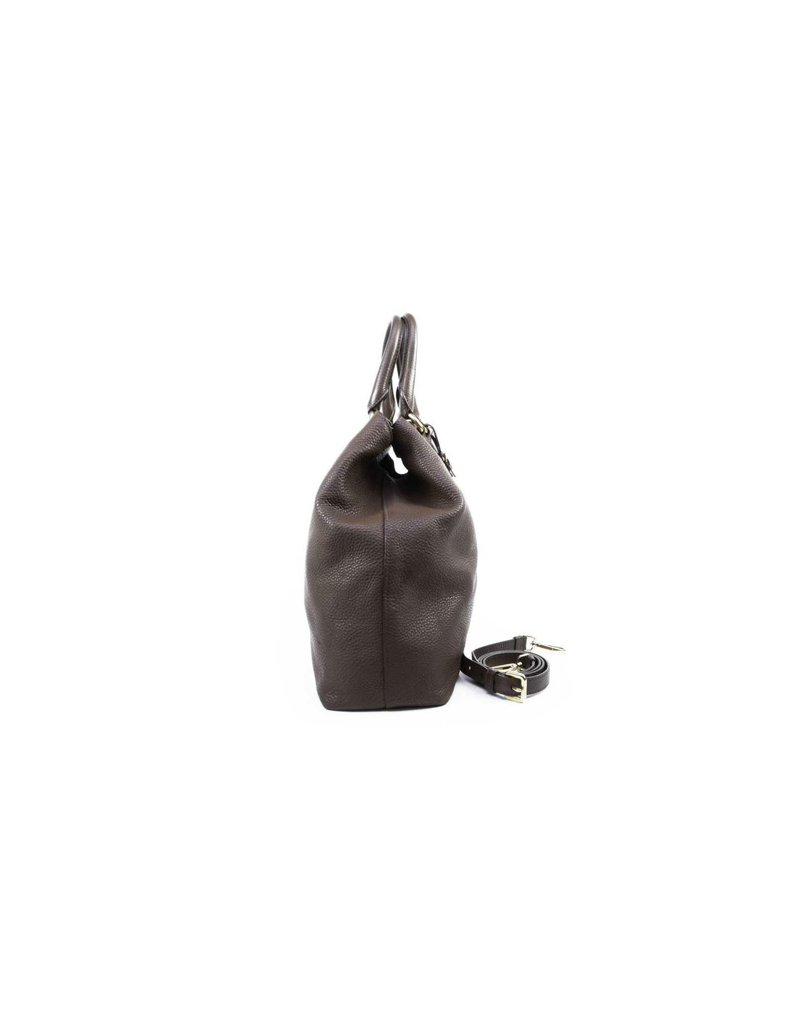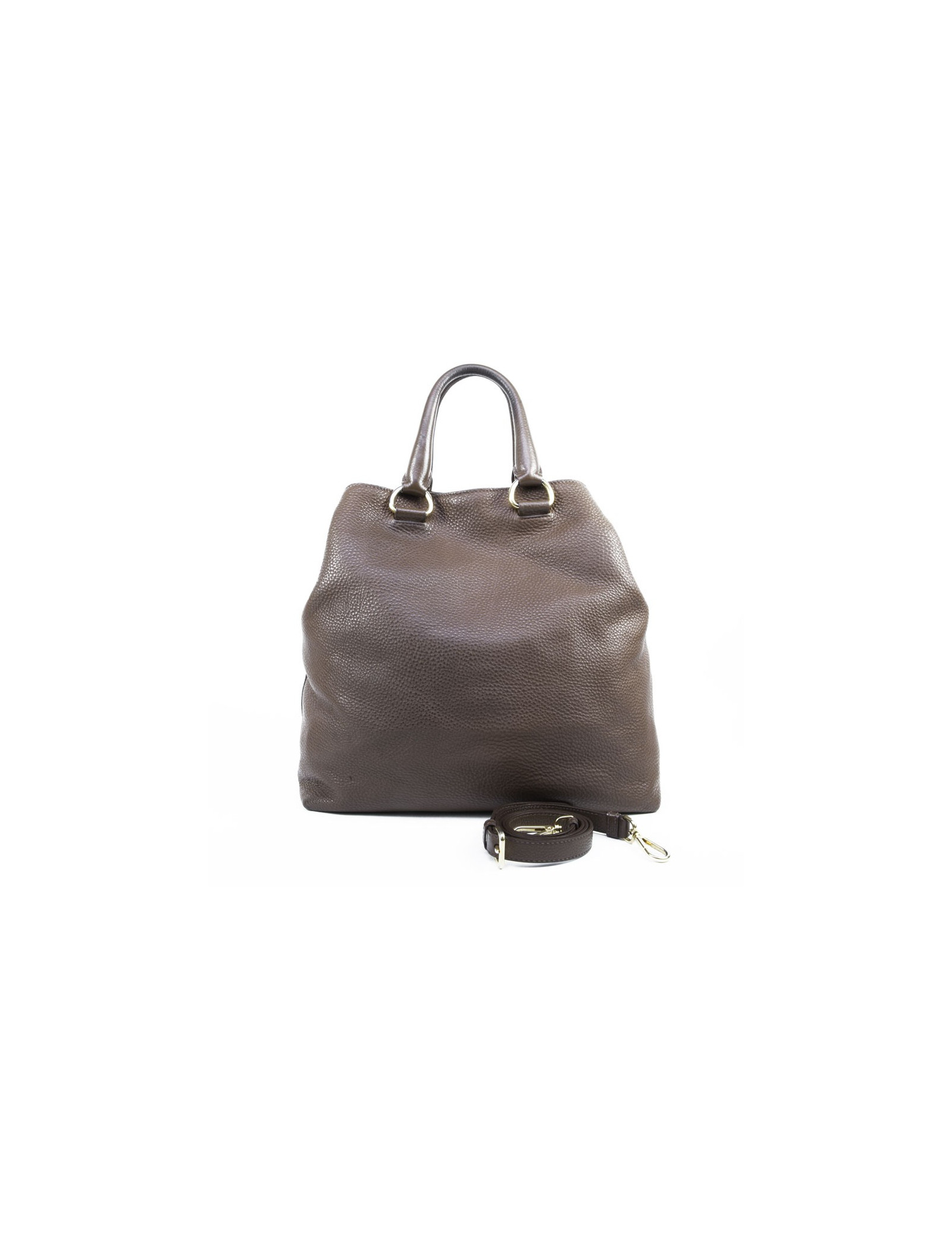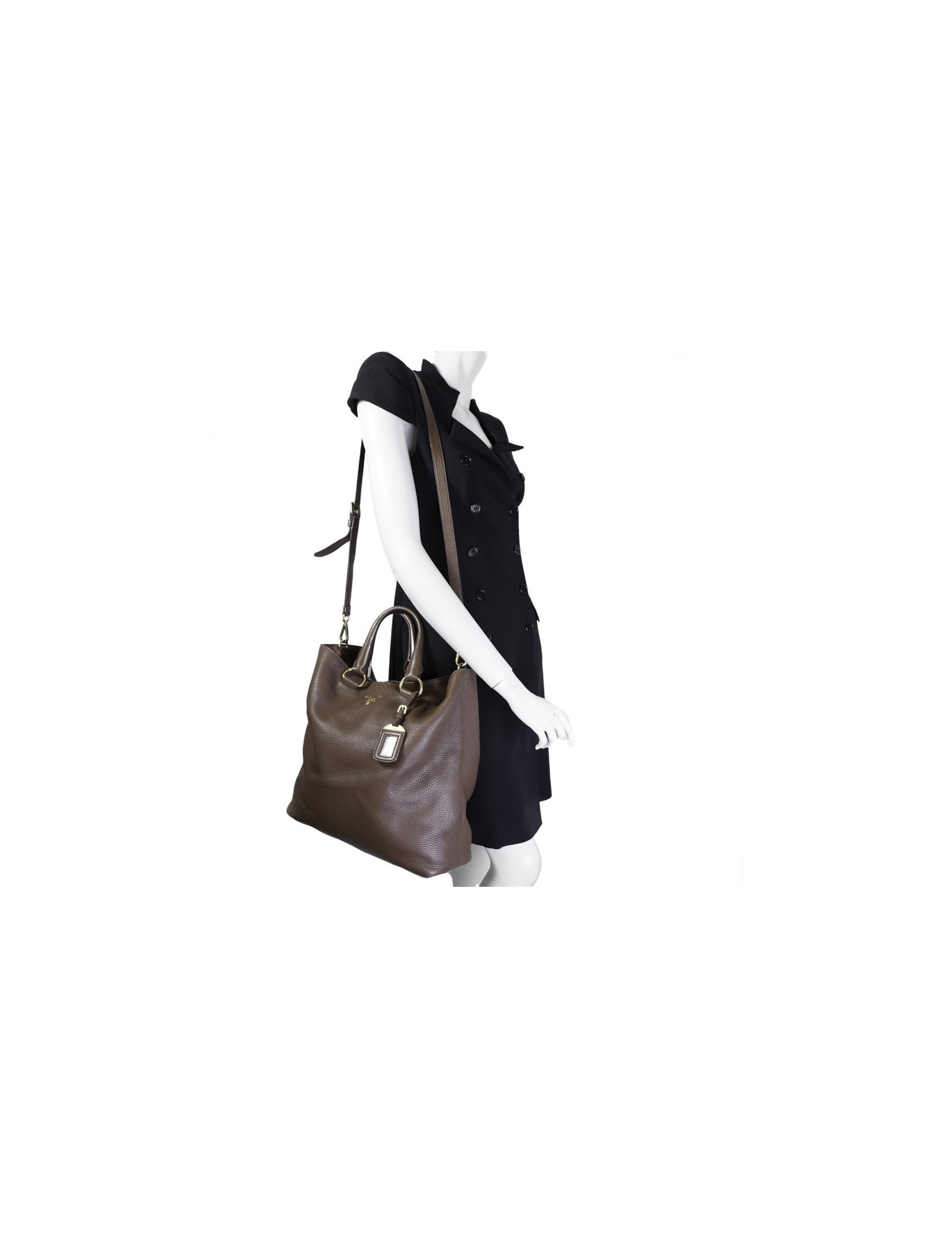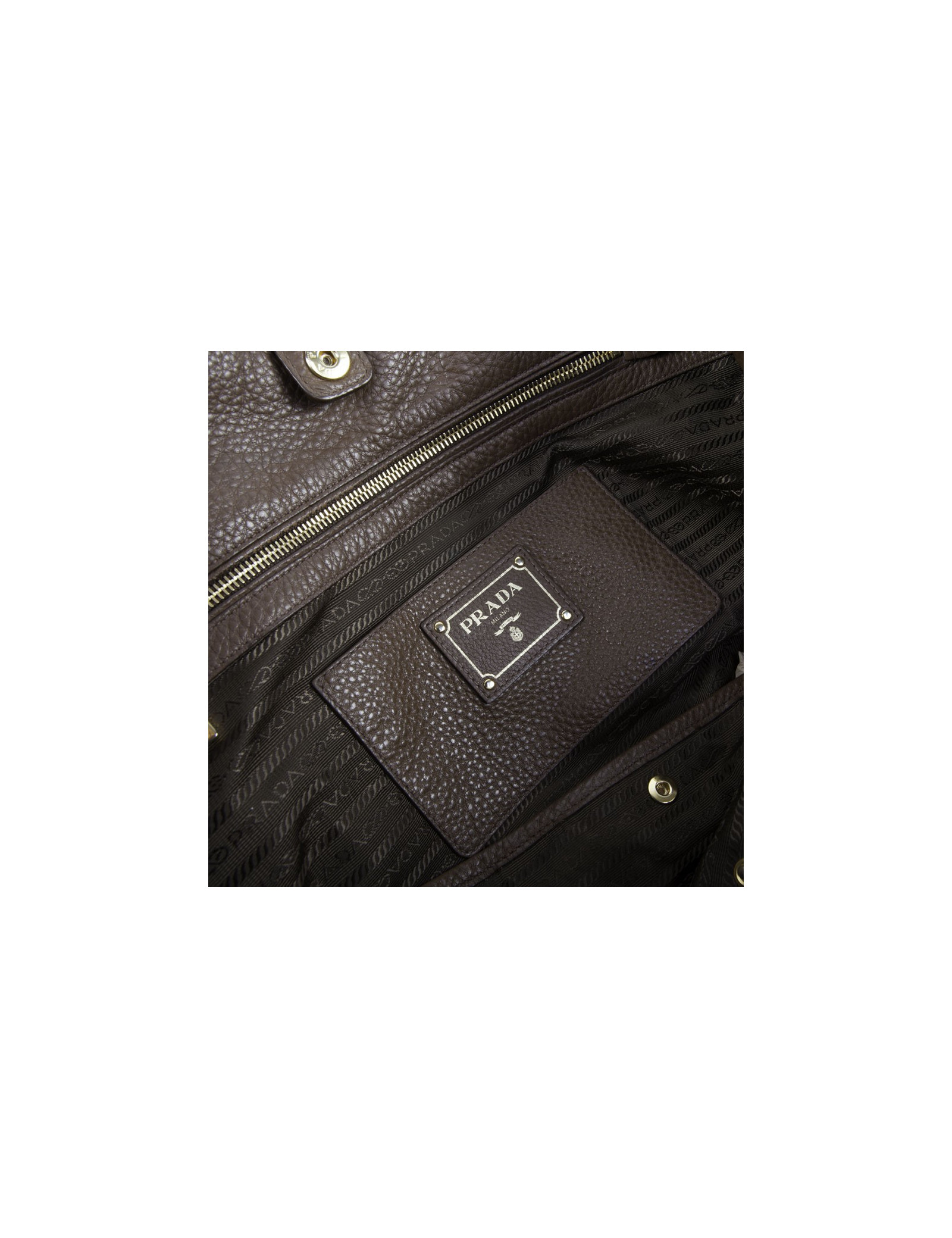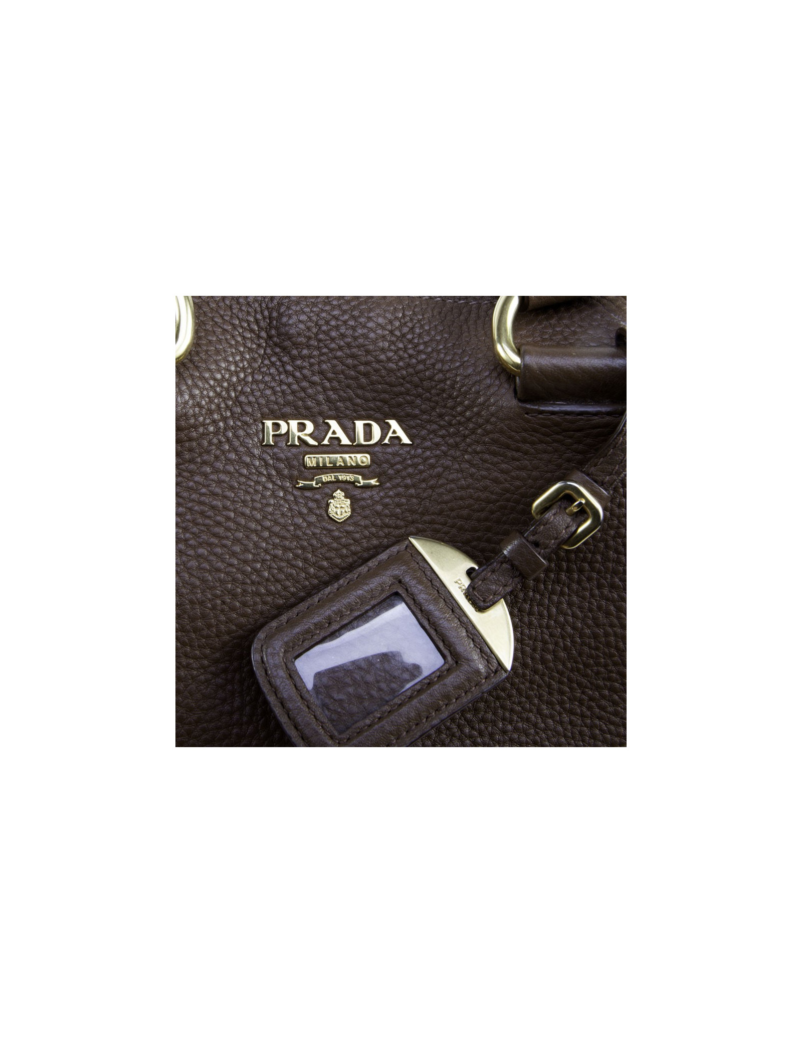 Sac besace Prada en cuir grainé marron. Idéal pour tous les jours. La bijouterie est en laiton doré (micro rayures). Il peut se tenir aussi bien au bras à l'aide des poignées qu'à l'épaule avec une bandoulière amovible et réglable. Fermeture par bouton pression.