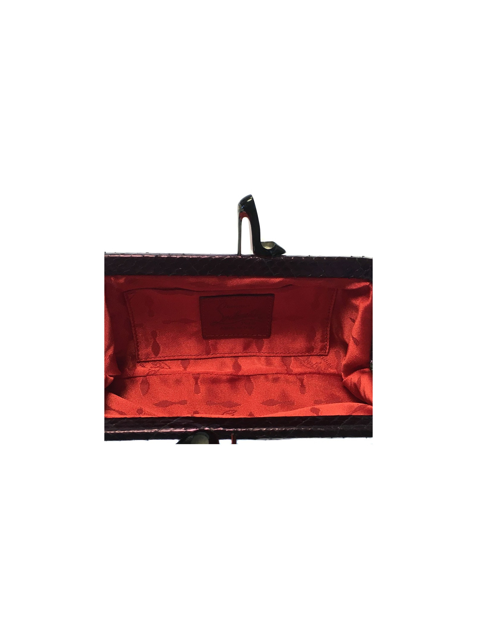 Superbe et original!! mini clutch CHRISTIAN LOUBOUTIN en python prune. Fermoir en forme d'escarpins Louboutin. Une petite poche à l'intérieur permet de ranger carte de crédit etc.... Intérieur en tissu rouge (couleur phare de la marque). En très bon état.