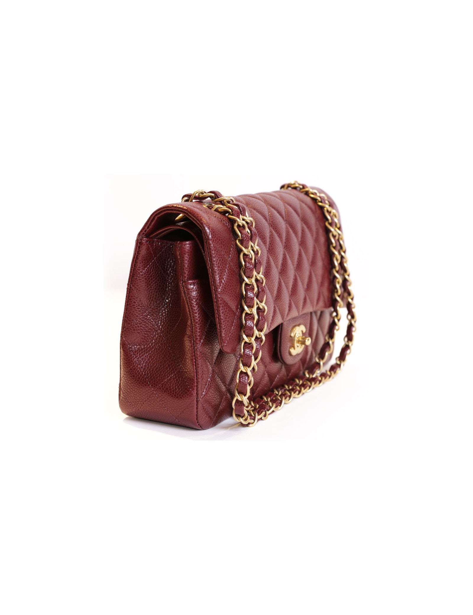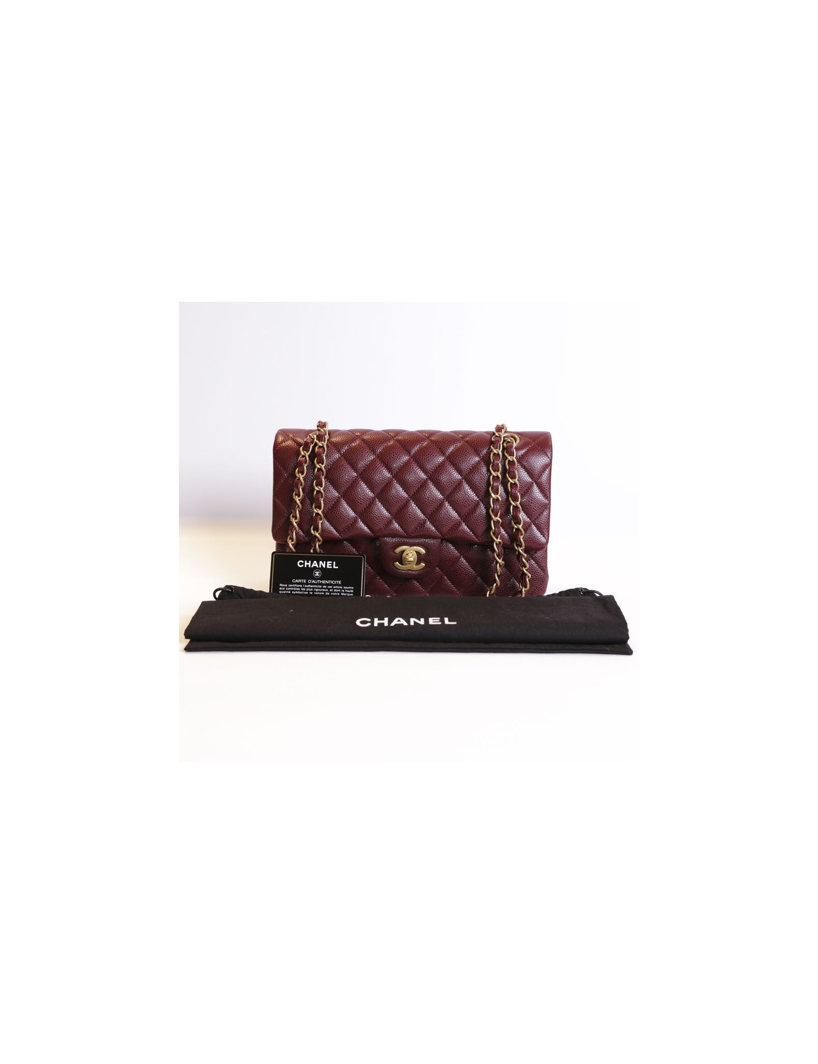 Un classique! Sac Timeless de la Maison Chanel en cuir matelassé caviar bordeaux. La bijouterie est en métal doré mate. Fermoir 'CC'. Double rabat. A l'intérieur, 3 poches plaquées et à l'arrière 1 poche plaquée. Hologramme: 2159.... et sa carte d'authenticité. En excellent état, porté une fois.