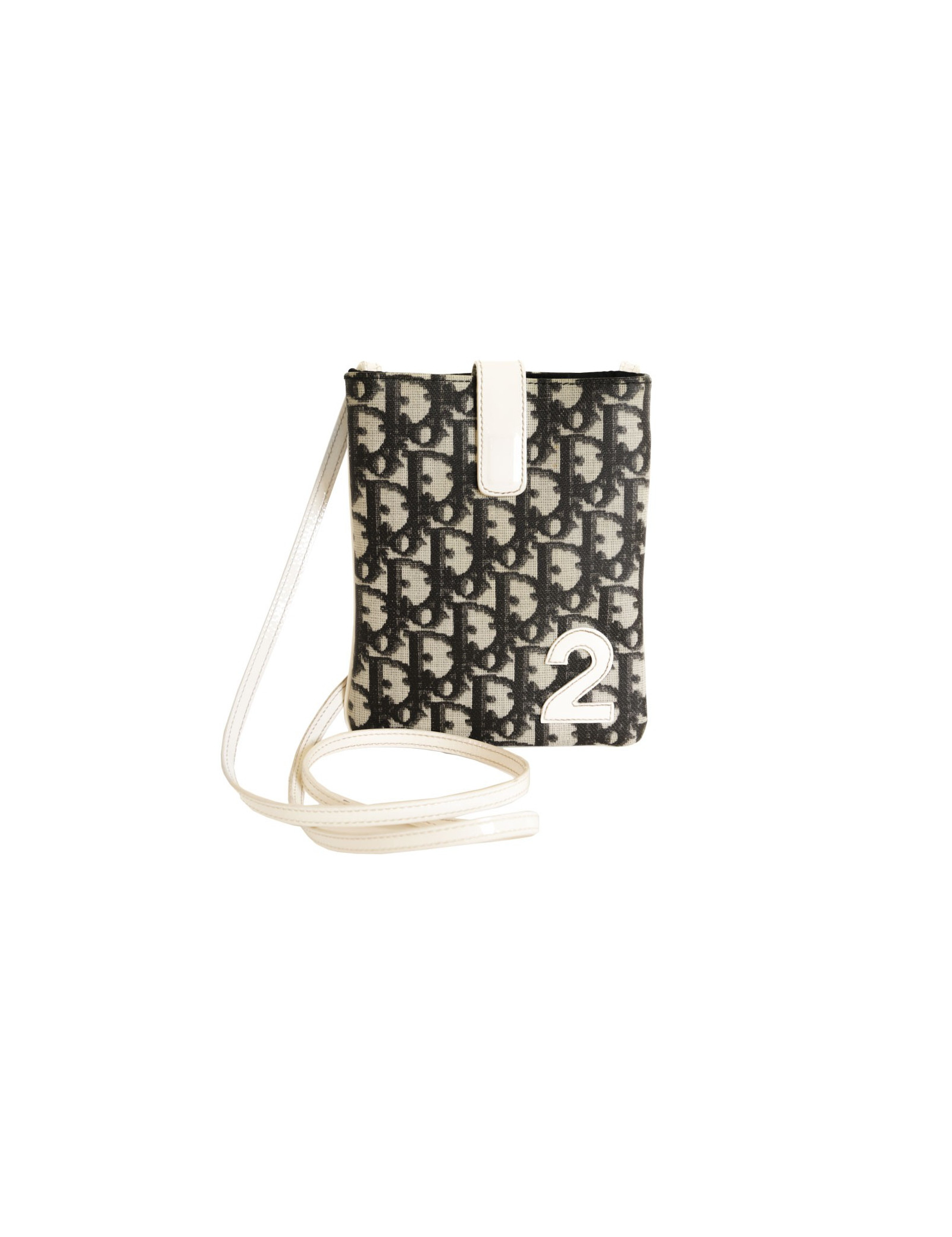 Pochette Dior en toile monogram, vintage. numéro de série BM-0012. La doublure est en tissu noir, avec une poche intérieure. L'anse et le fermoir (se ferme par un aiment) est en cuir verni blanc..