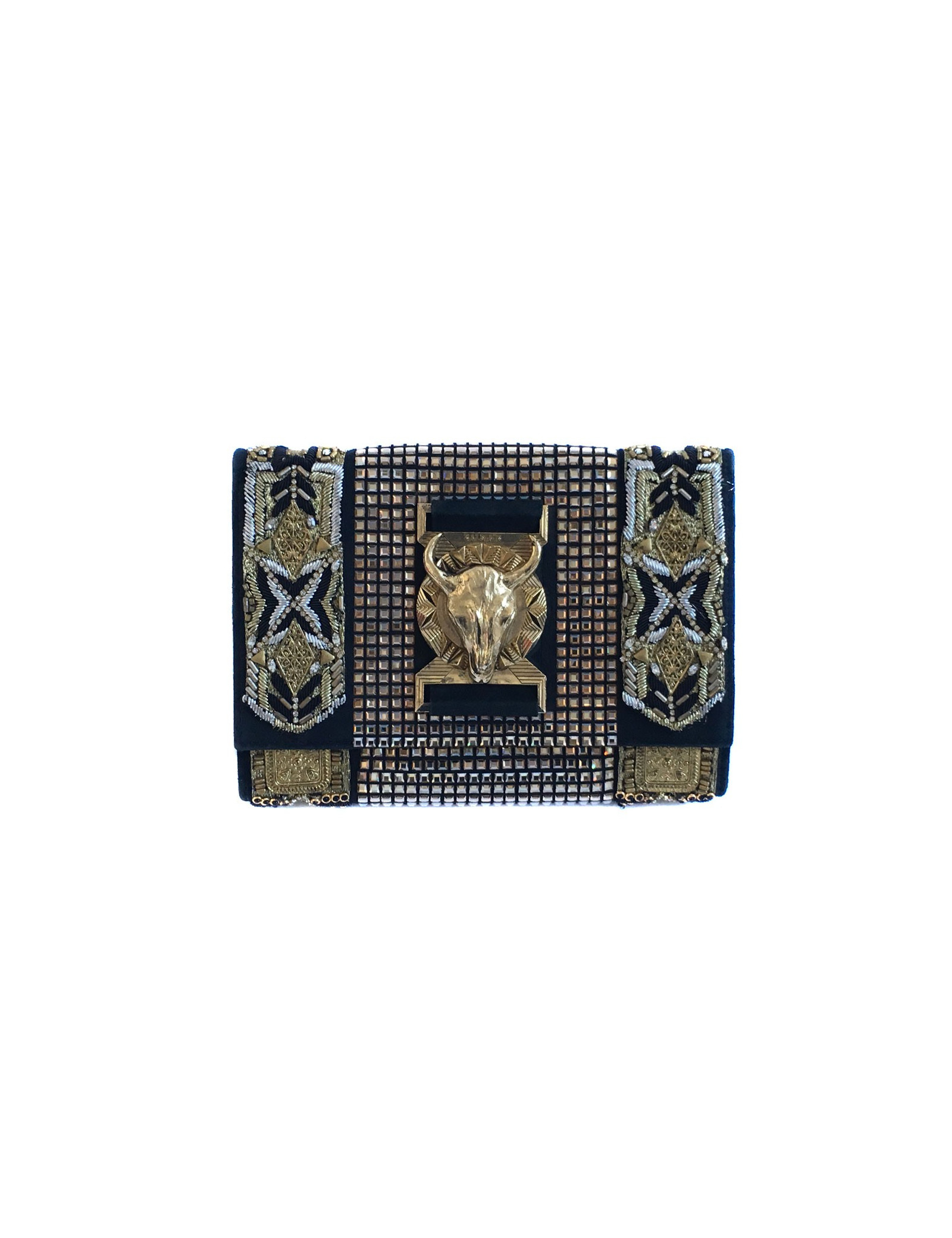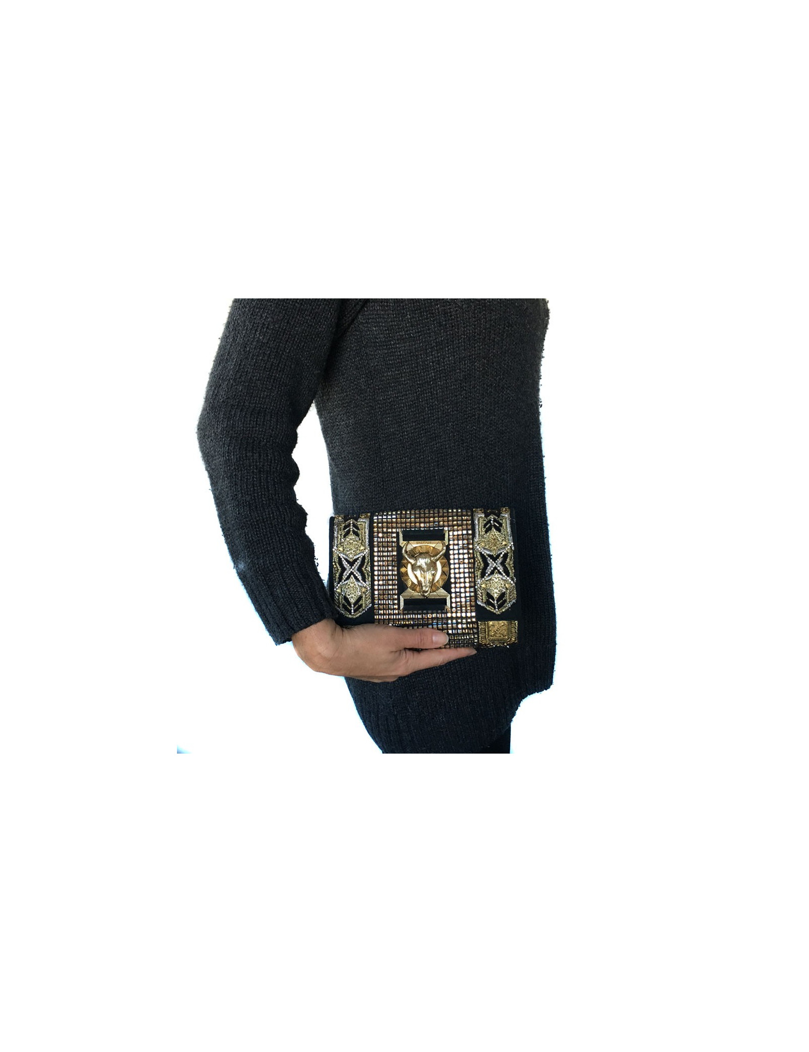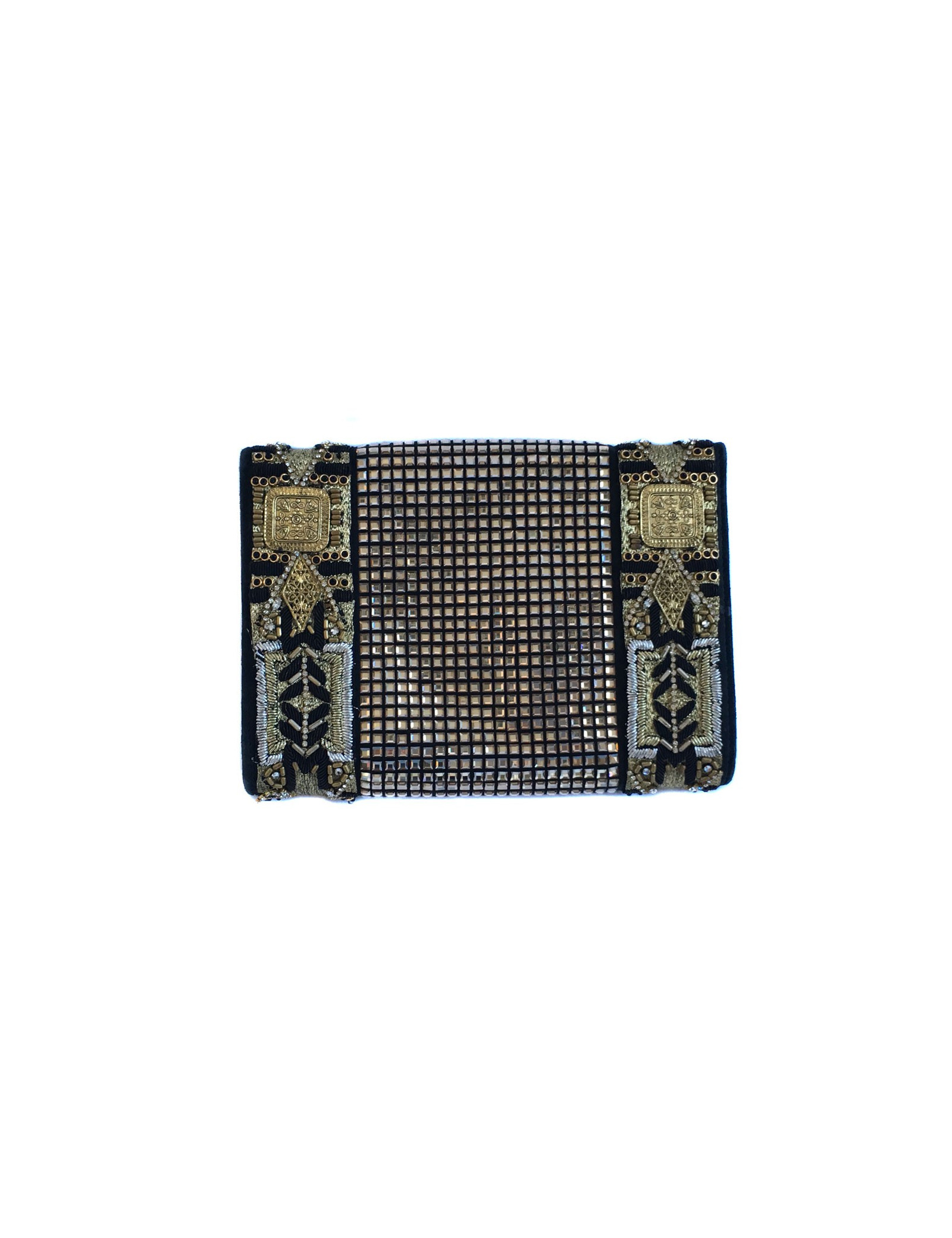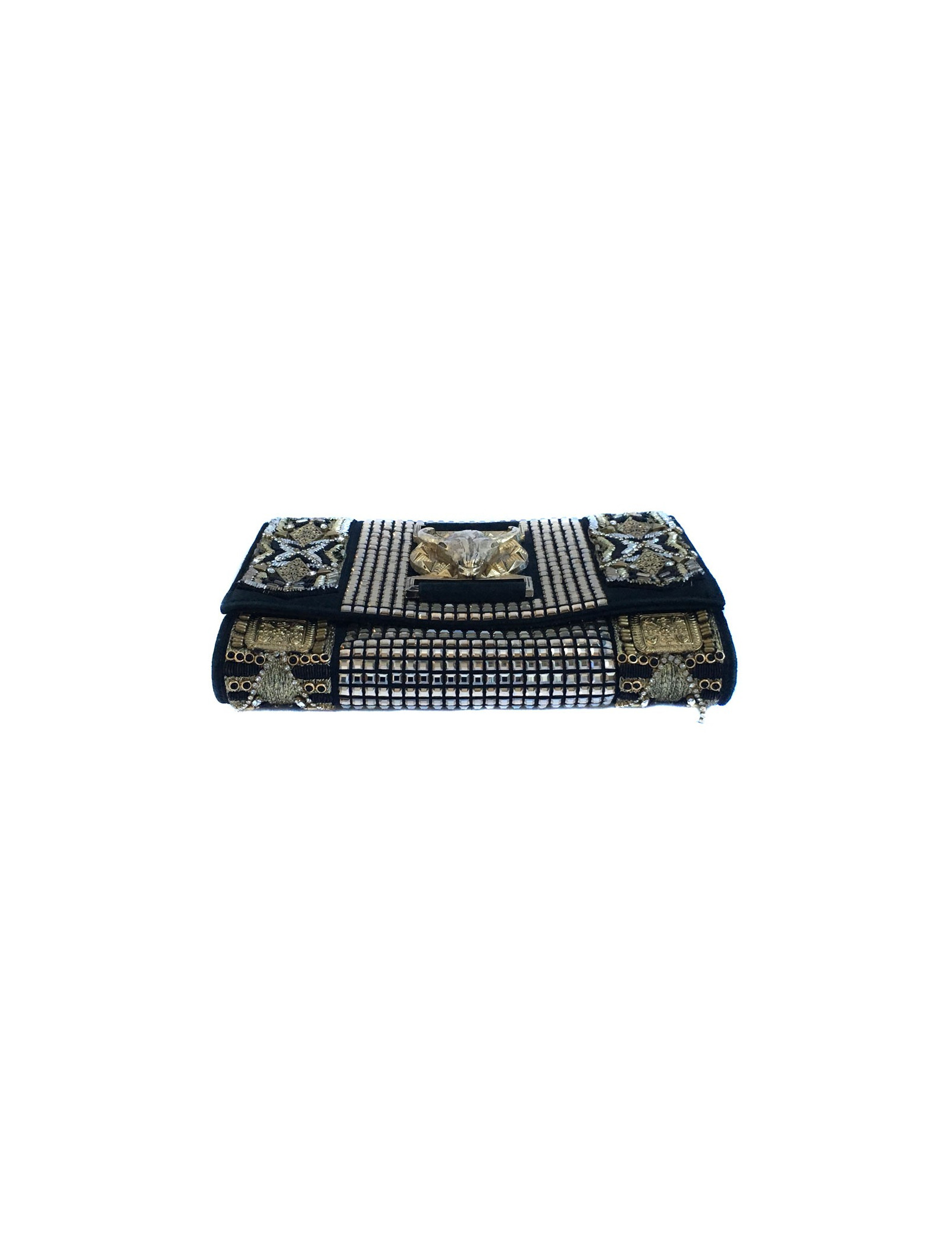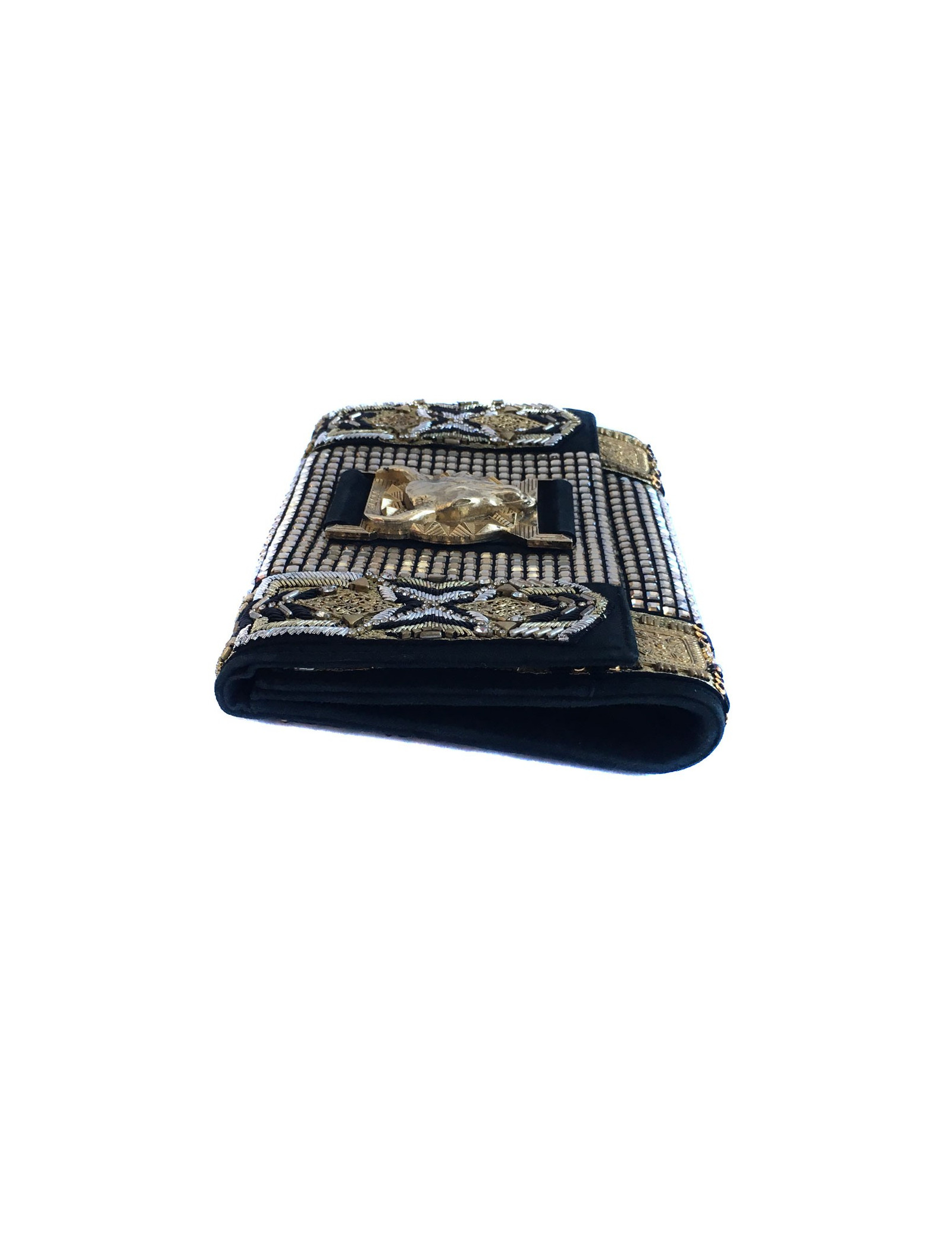 Pochette du soir Balmain entièrement perlée, tressée et cousue de fils d'or, noirs et argentés.