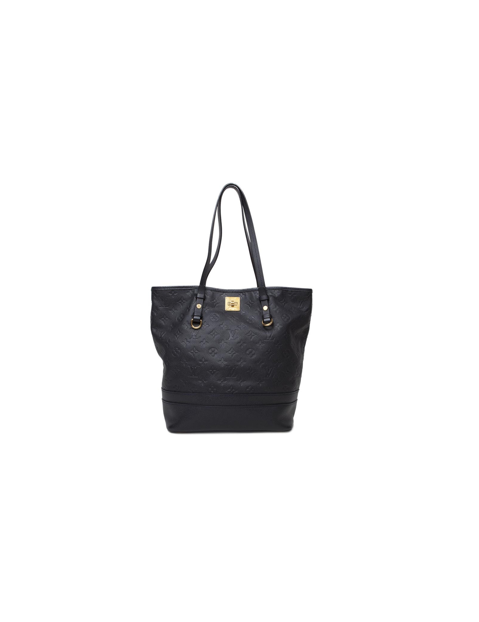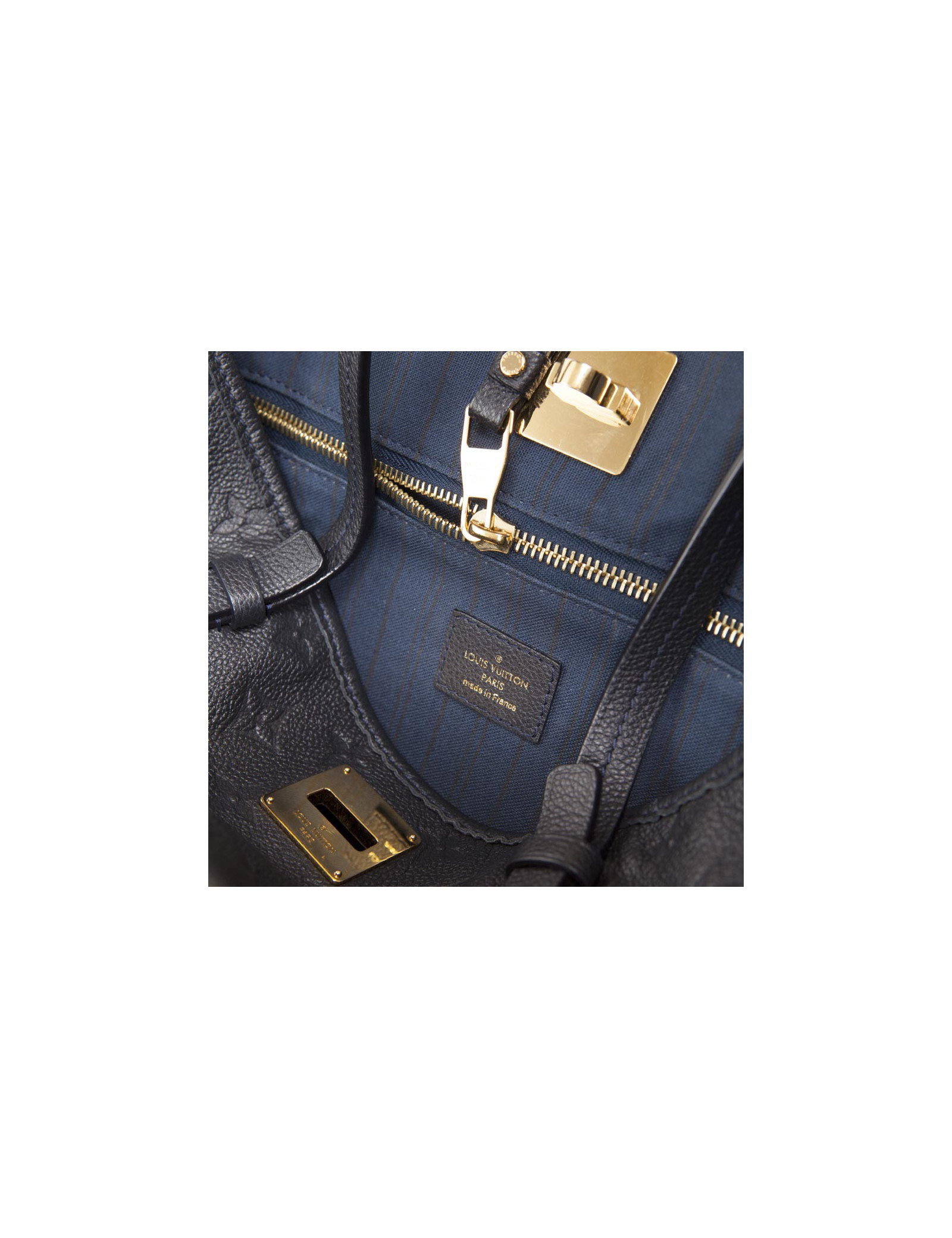 Sac de la Maison Louis Vuitton en cuir embossé grainé monogram bleu. Pièces métalliques dorées. L'intérieur est en textile bleu rayé avec une poche zippée et deux emplacements pour smartphones.