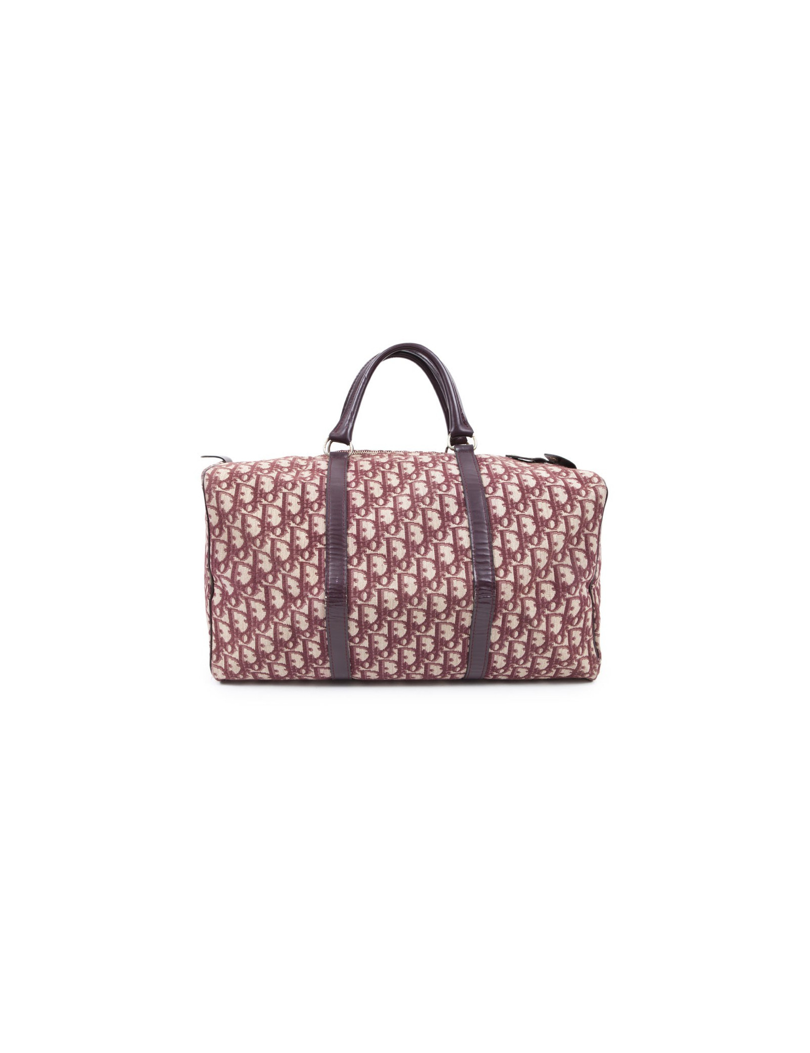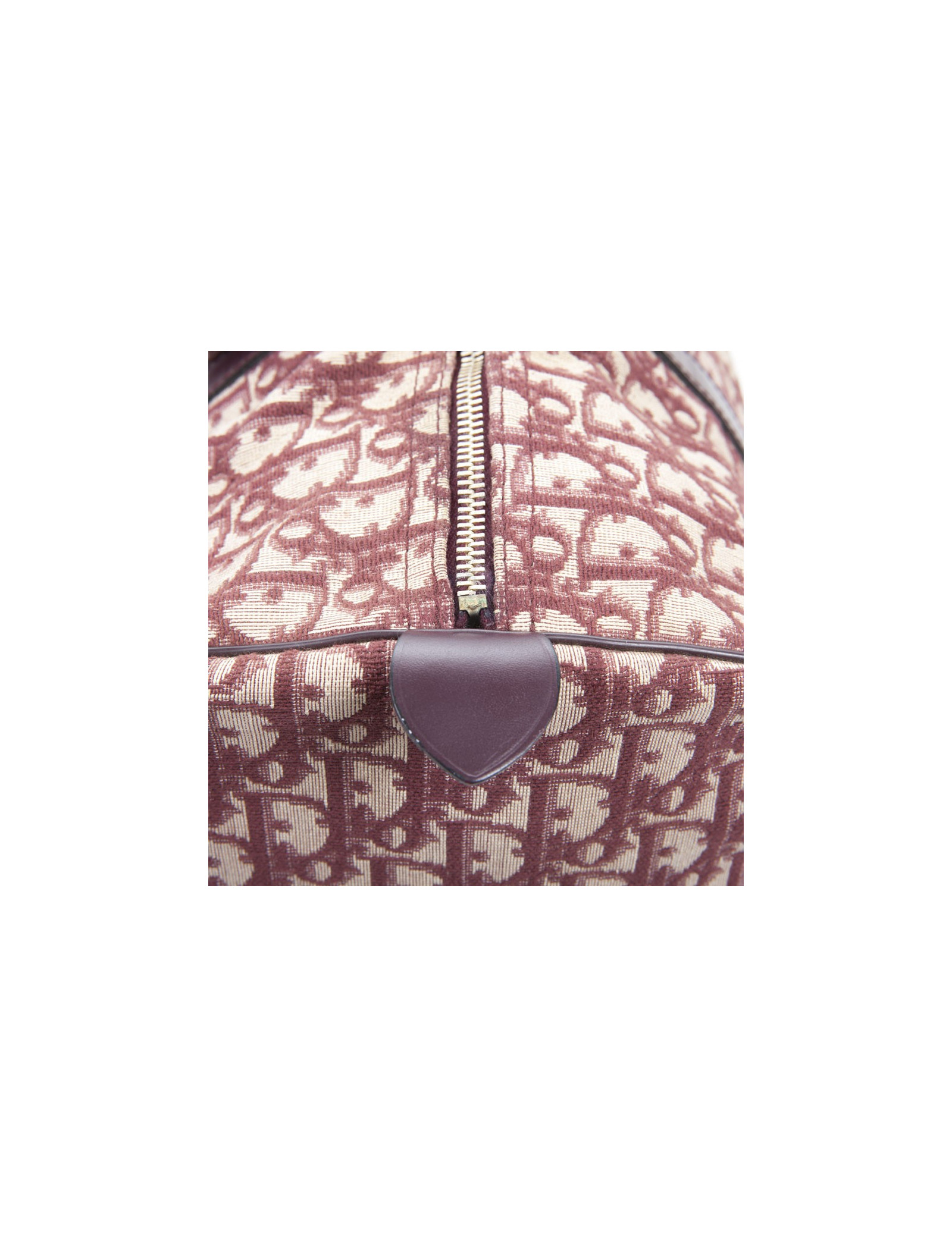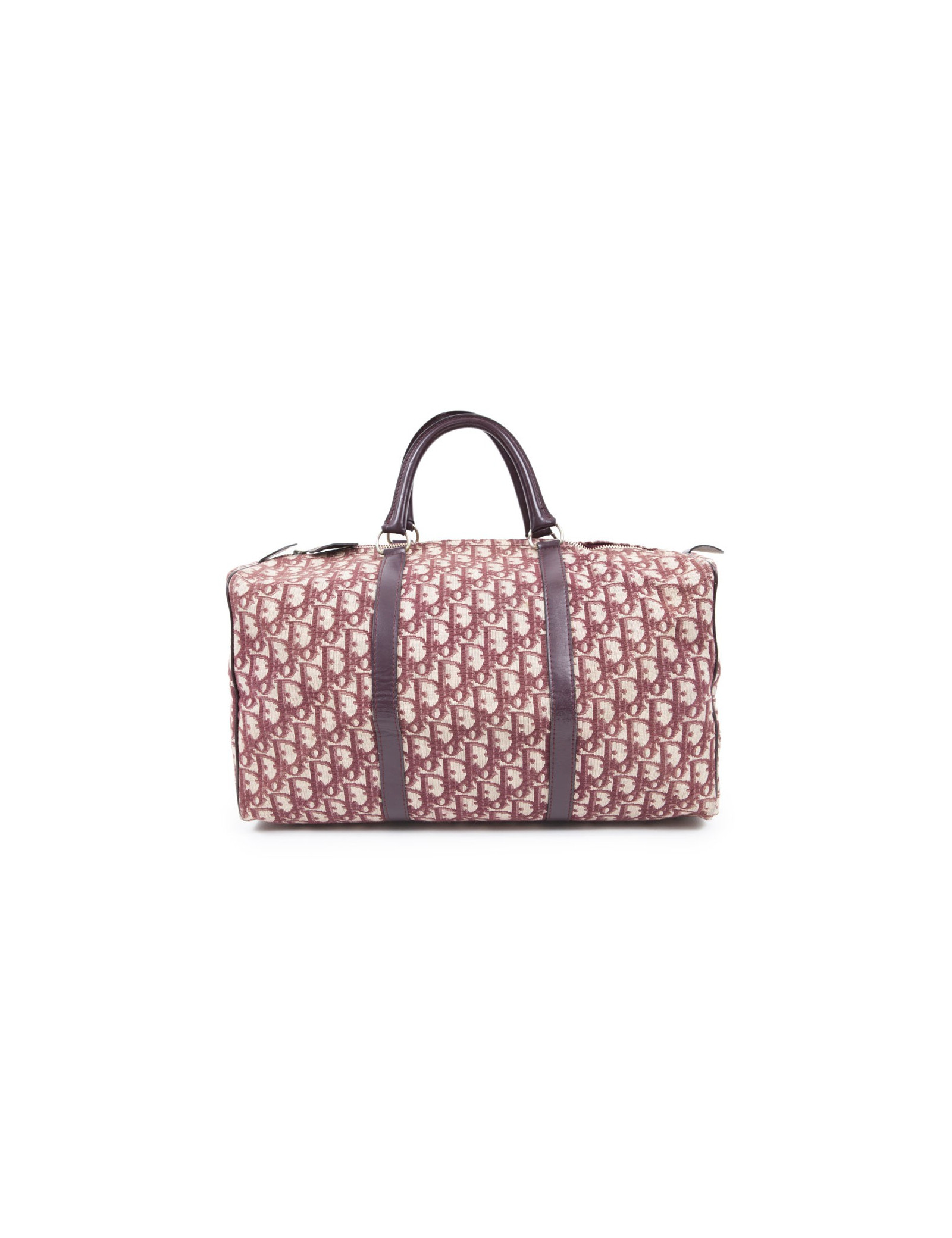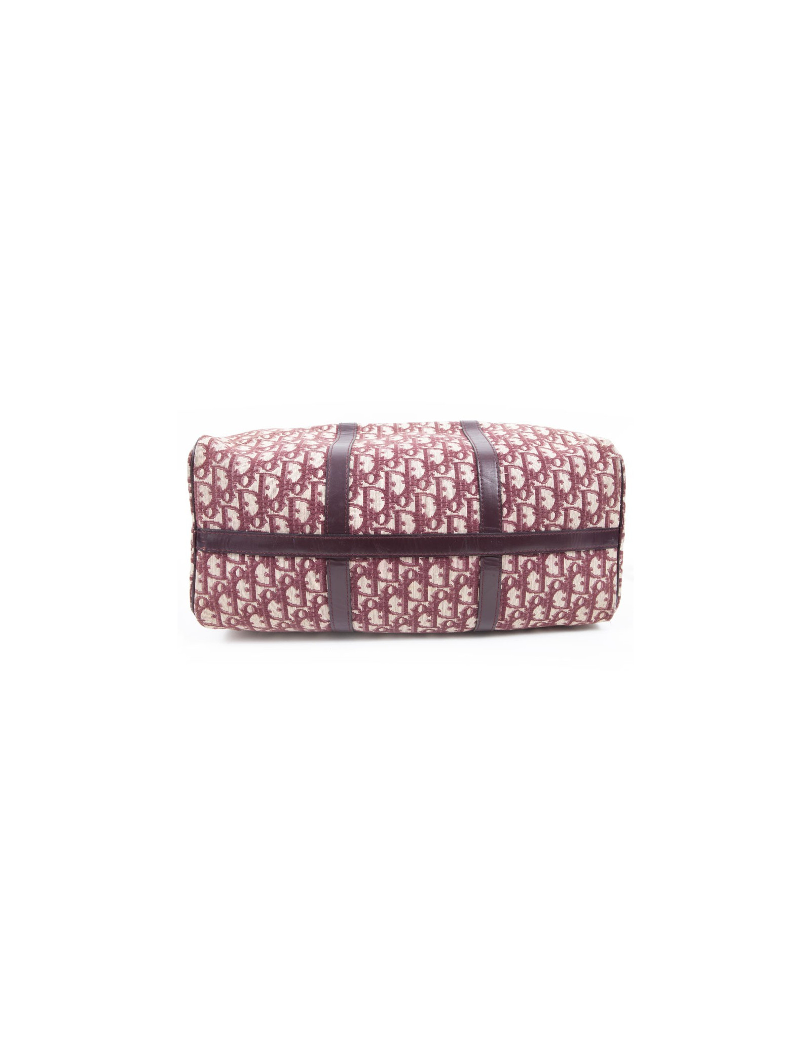 Vintage! Sac Boston de la Maison Christian Dior en toile monogram bordeaux. Fermeture zippée. La bijouterie est en métal doré vieilli. Etat vintage. Usure d'usage, en très bonne conservation.