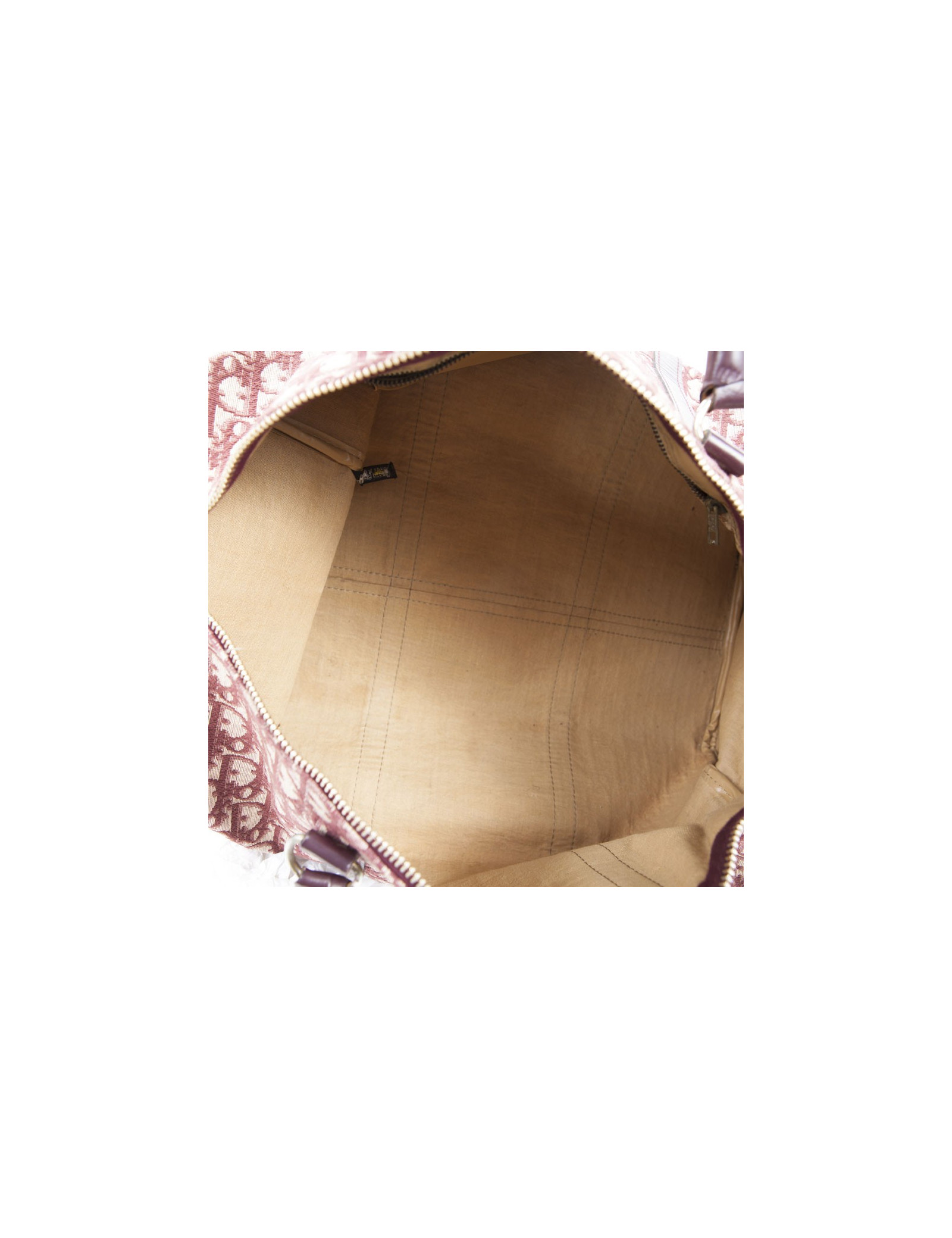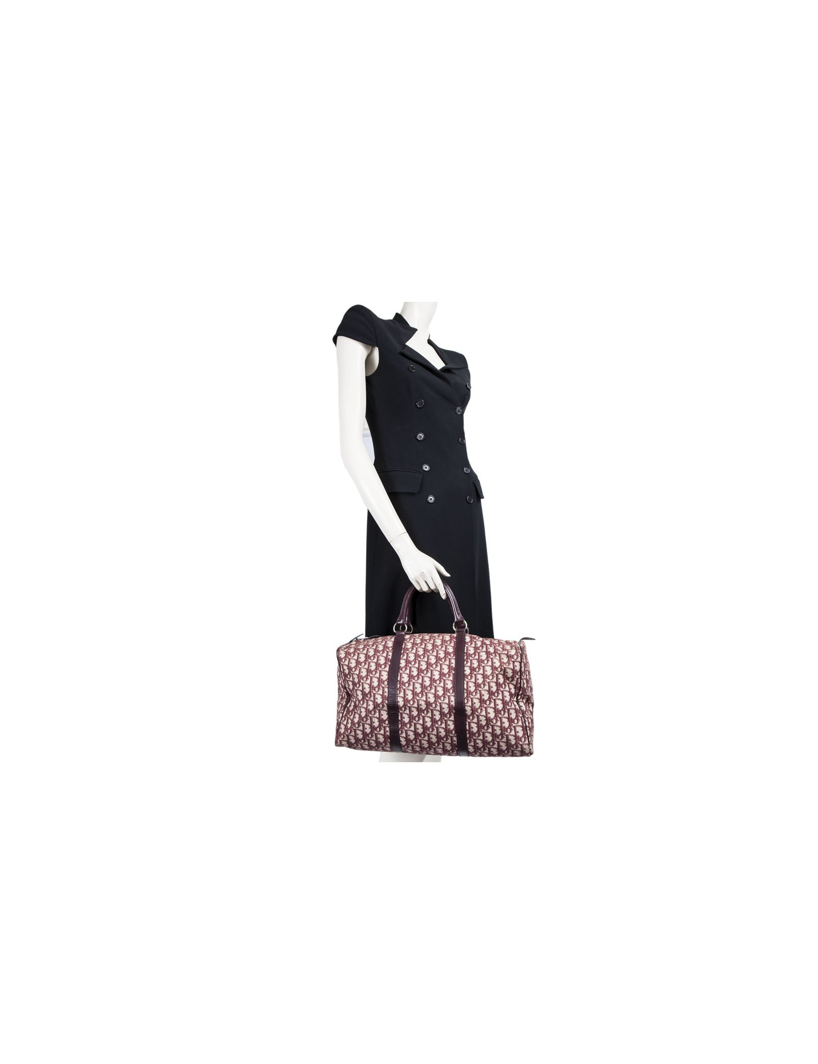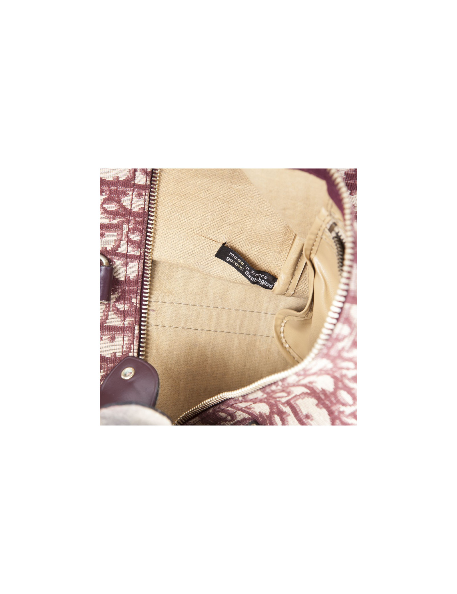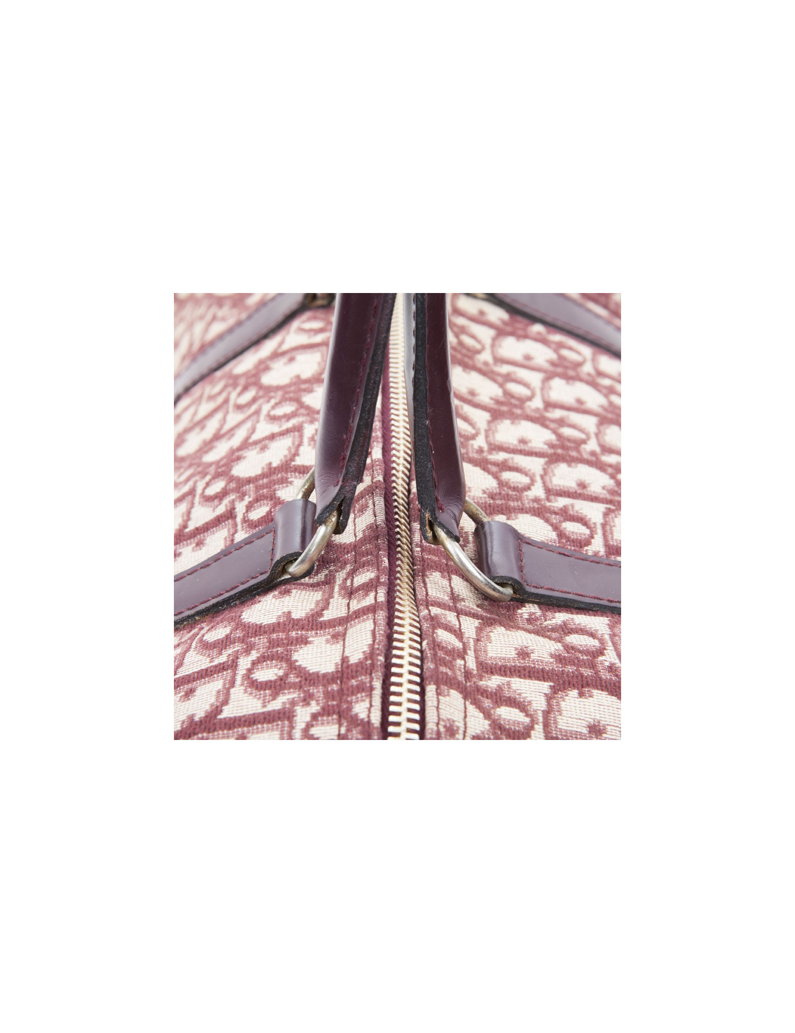 Vintage! Sac Boston de la Maison Christian Dior en toile monogram bordeaux. Fermeture zippée. La bijouterie est en métal doré vieilli. Etat vintage. Usure d'usage, en très bonne conservation.