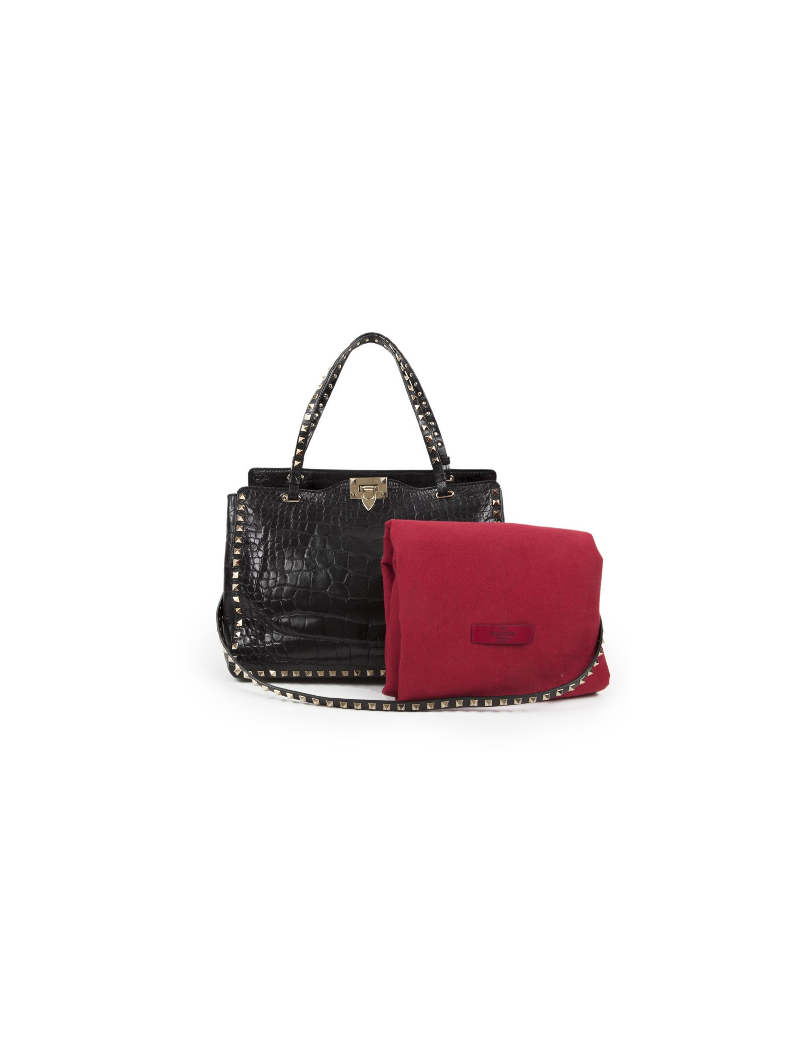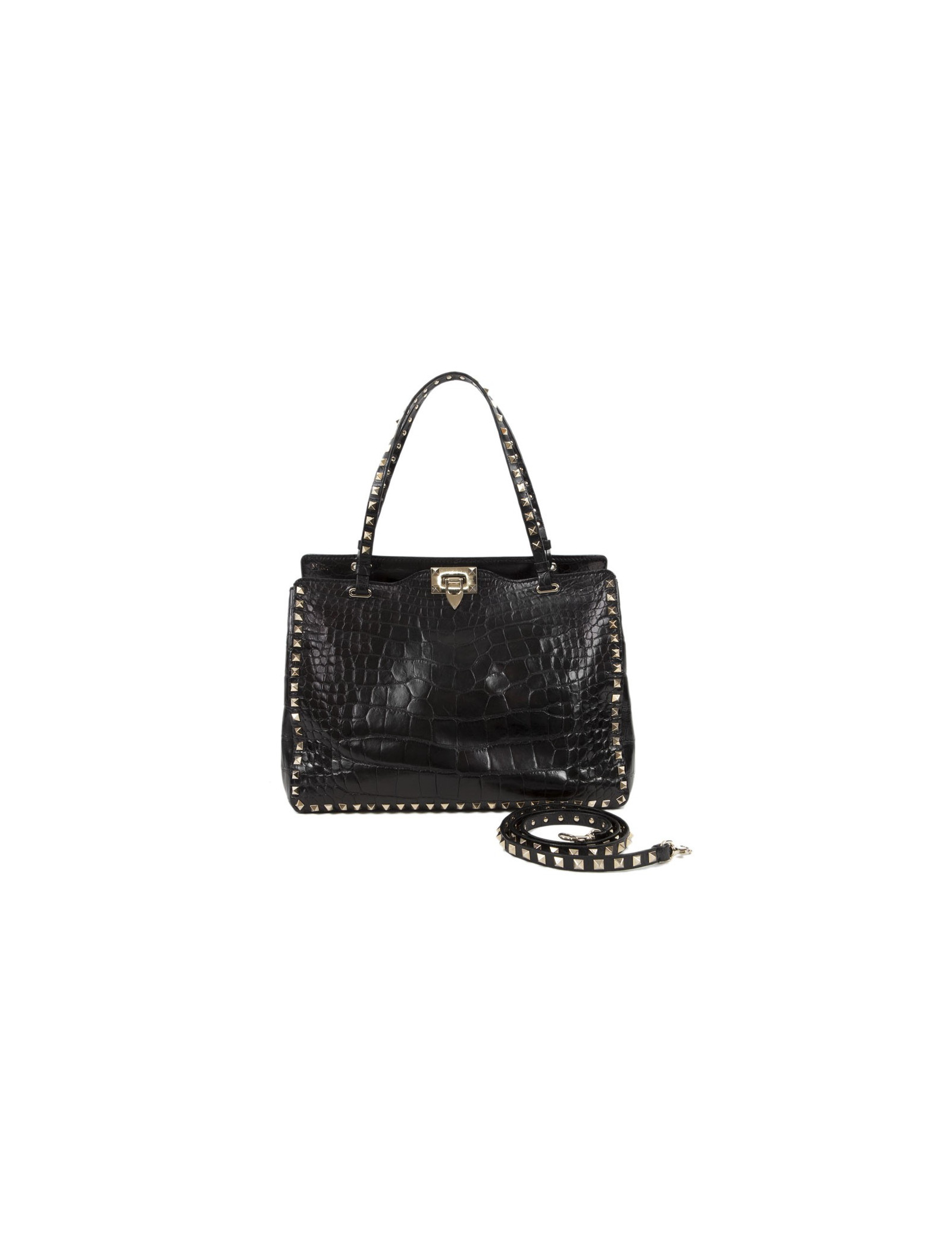 Sac à main trapèze "Rockstud" de la Maison Valentino Garavani en peau exotique crocodile noir semi- mat avec anses et bandoulière. Les finitions à clous sont dorées Rockstud, la fermeture : boucle dorée or pâle, la bandoulière : amovible, la poche intérieure : zippée et patch logo intérieur.