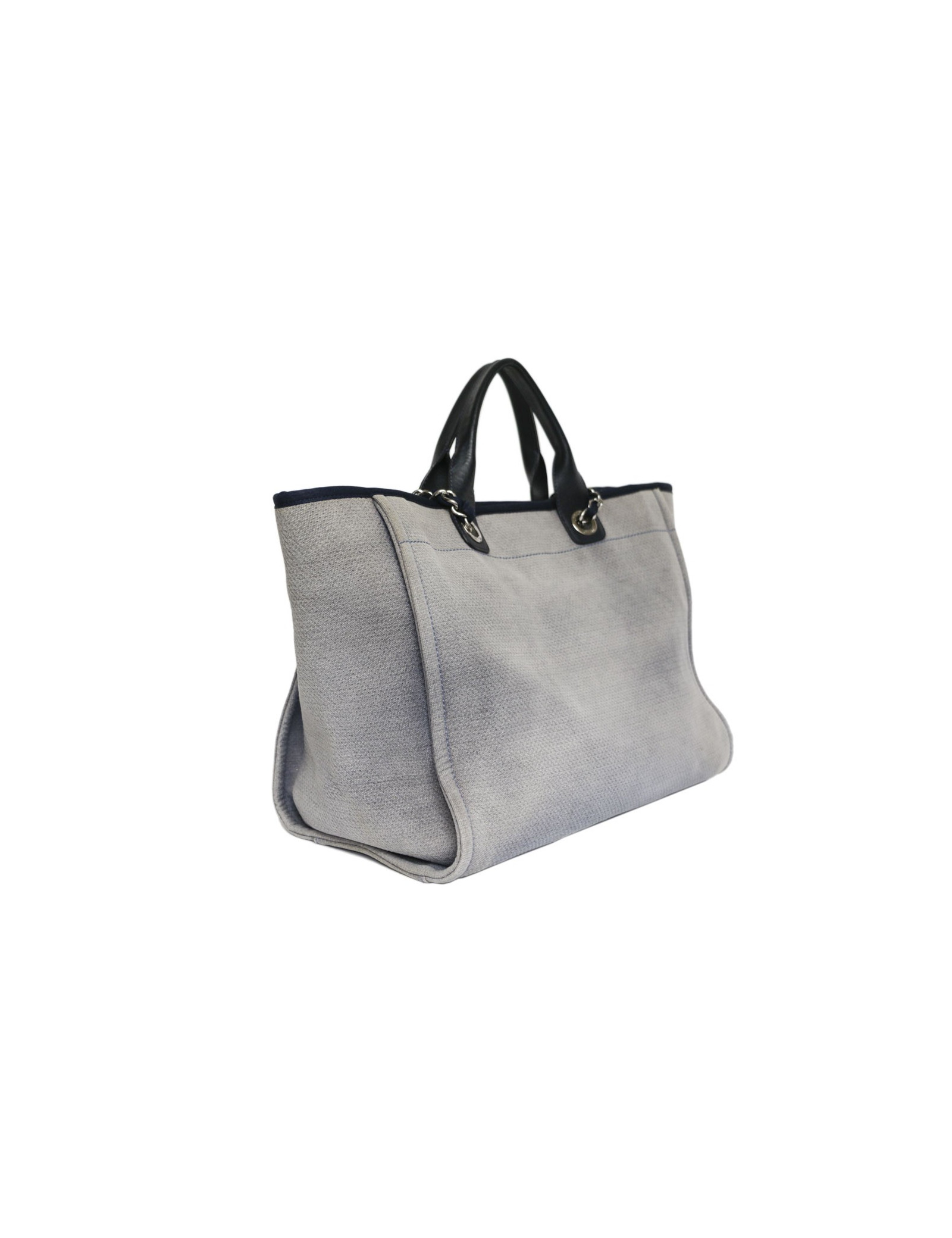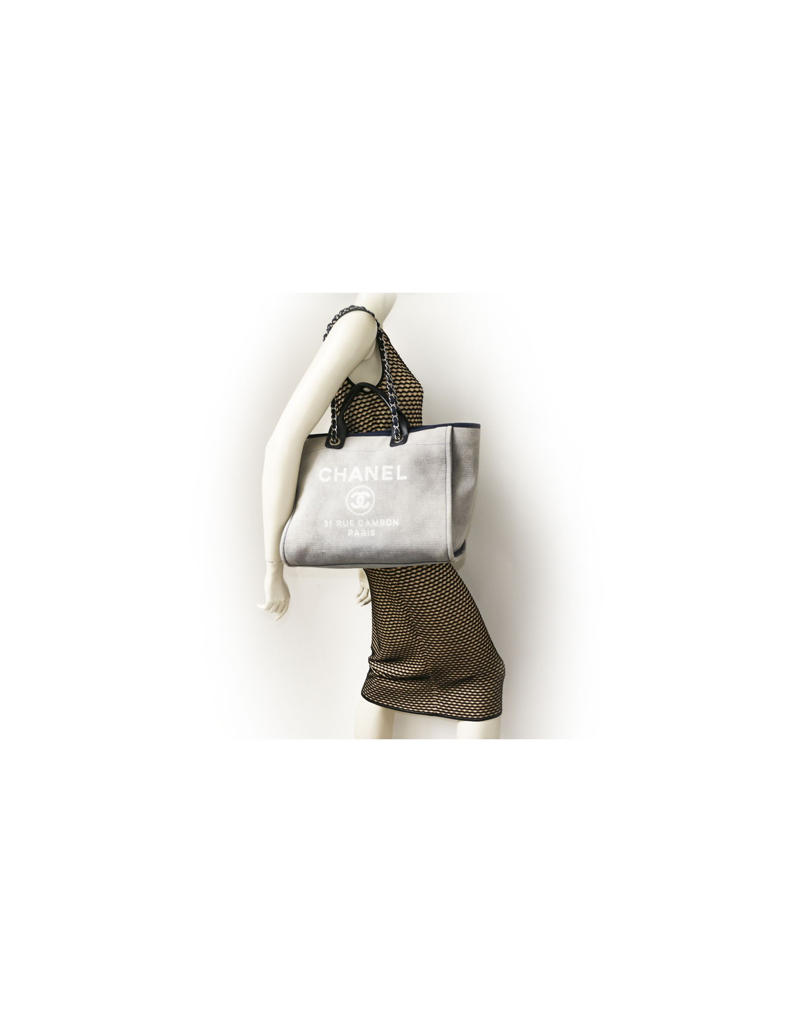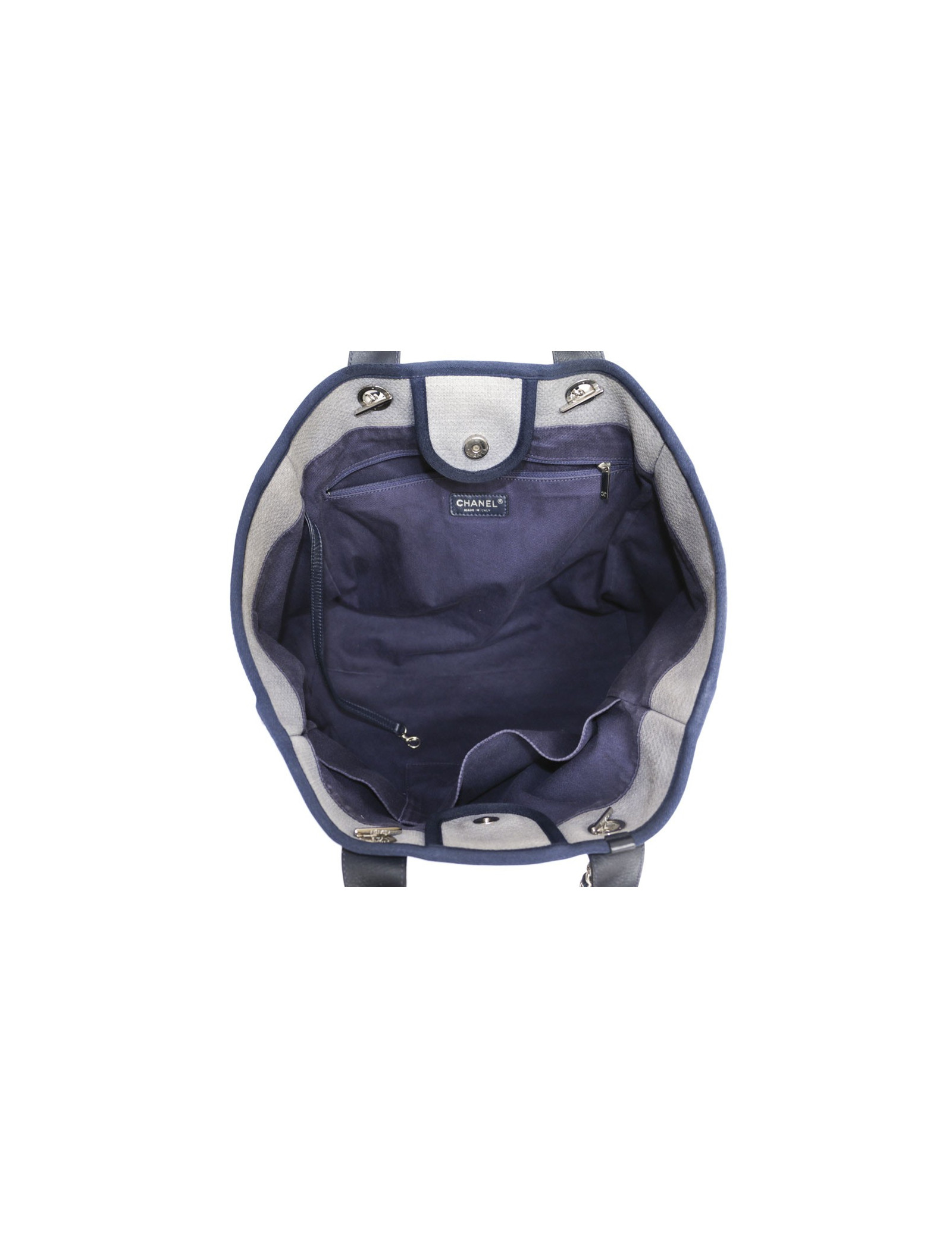 Cabas 'Deauville' en toile de couleurs gris/ bleu de la Maison Chanel. Bijouterie argenté. Fermeture par bouton pression. L'intérieur est en toile bleu marine avec 3 poches dont 1 zippée. Hologramme: 1702... pas de carte d'authenticité. Il se porte à l'épaule à l'aide d'une bandoulière et à la main avec 2 anses en cuir. En très bon état (ce sac a été nettoyé chez Germaine Lesèche).