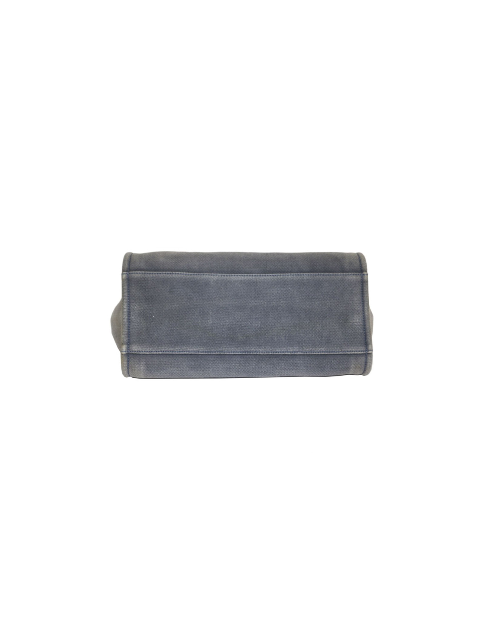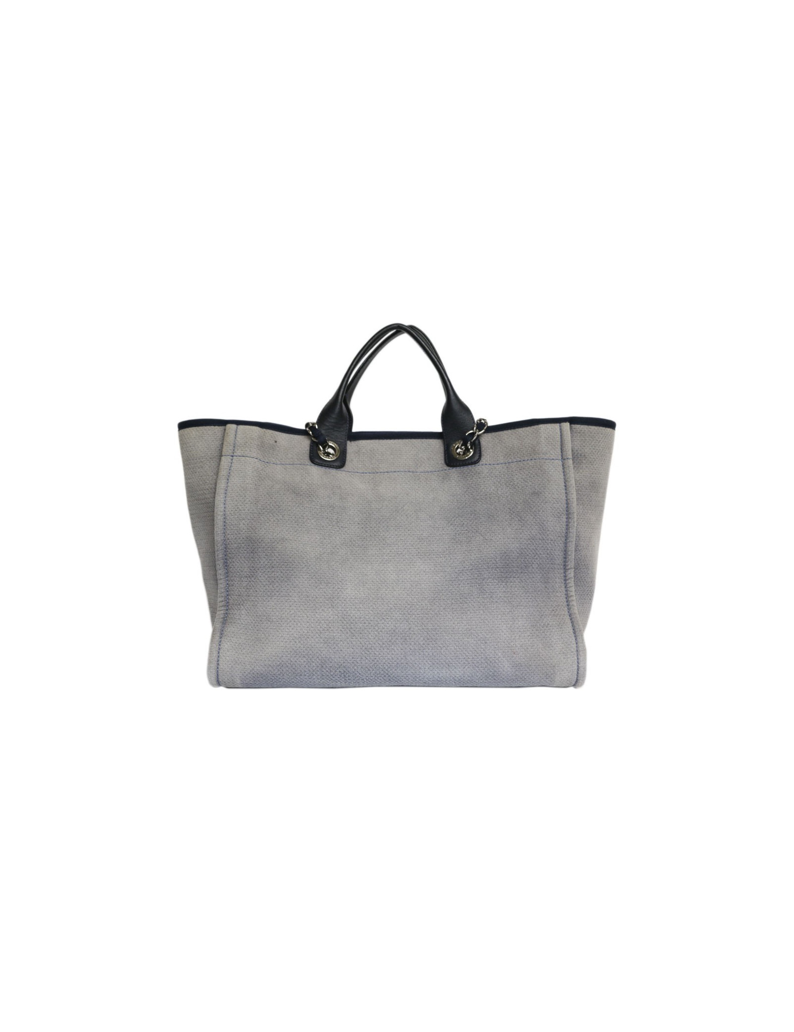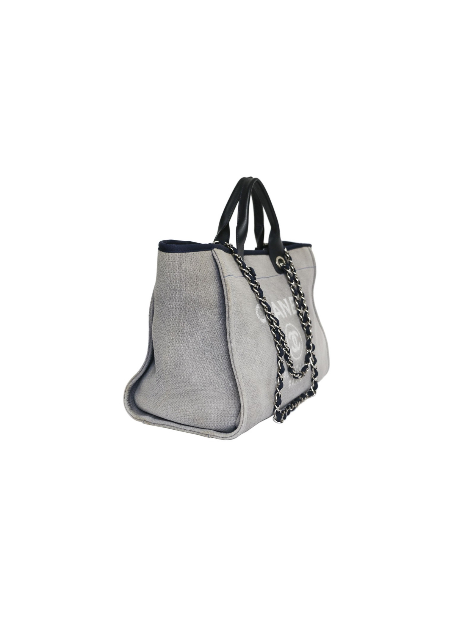 Cabas 'Deauville' en toile de couleurs gris/ bleu de la Maison Chanel. Bijouterie argenté. Fermeture par bouton pression. L'intérieur est en toile bleu marine avec 3 poches dont 1 zippée. Hologramme: 1702... pas de carte d'authenticité. Il se porte à l'épaule à l'aide d'une bandoulière et à la main avec 2 anses en cuir. En très bon état (ce sac a été nettoyé chez Germaine Lesèche).