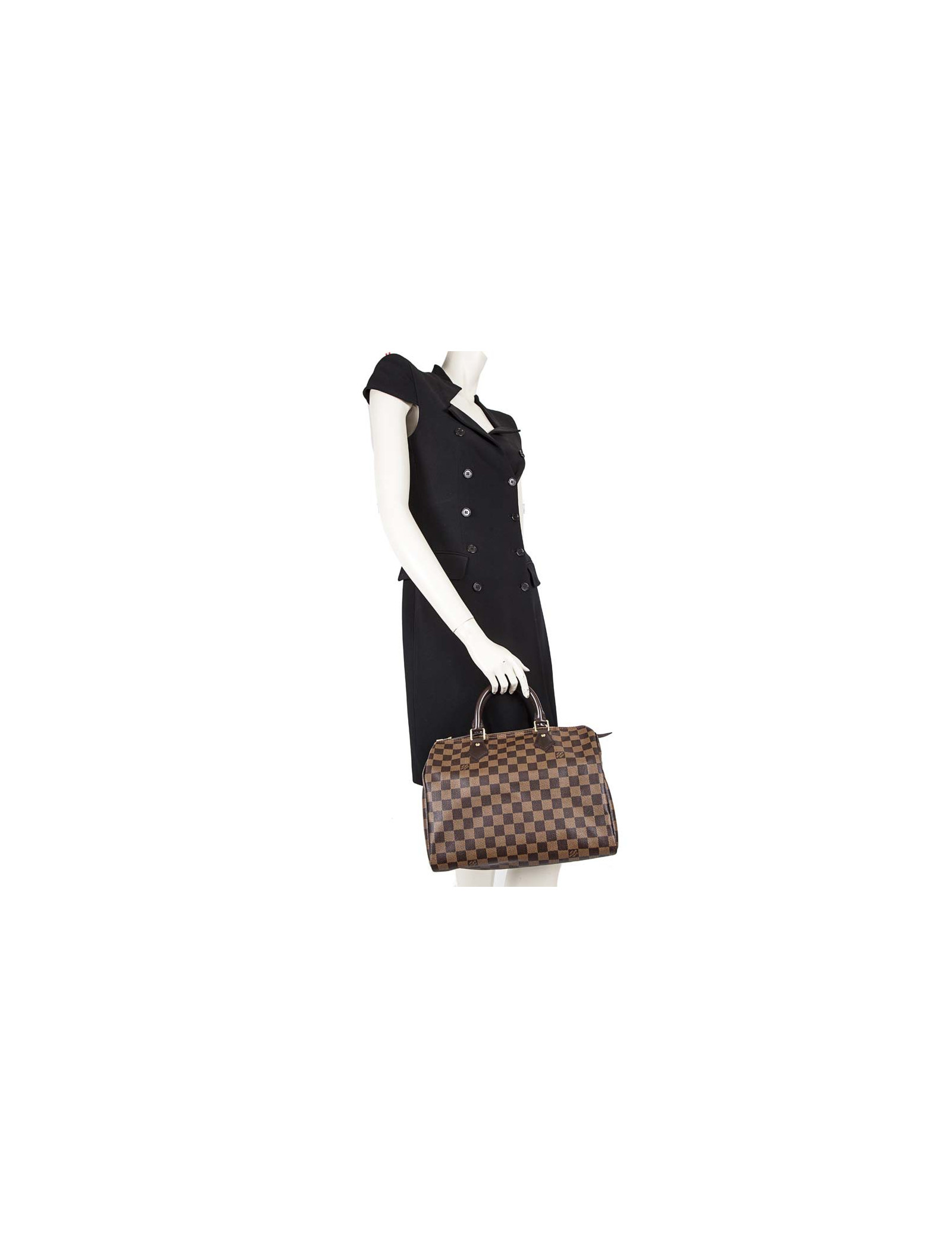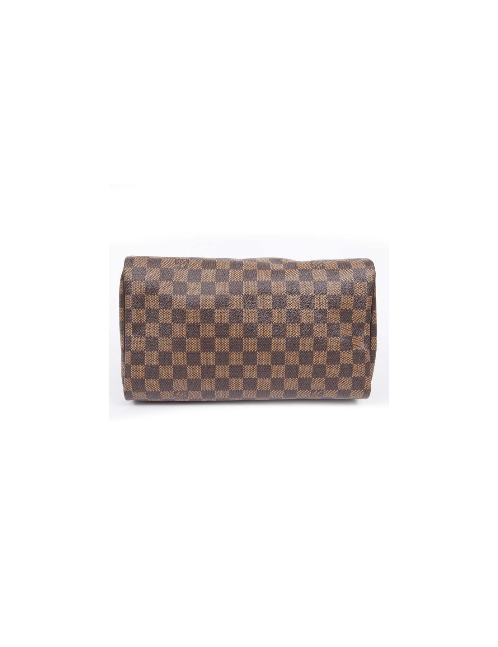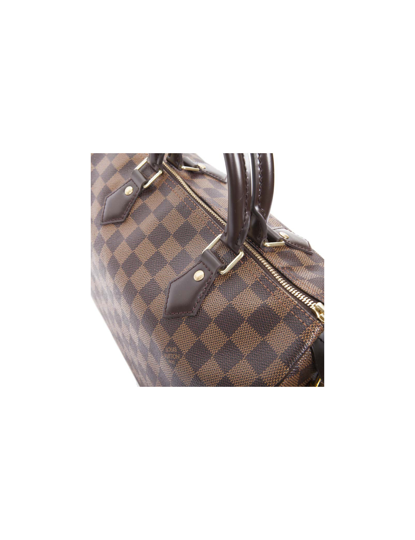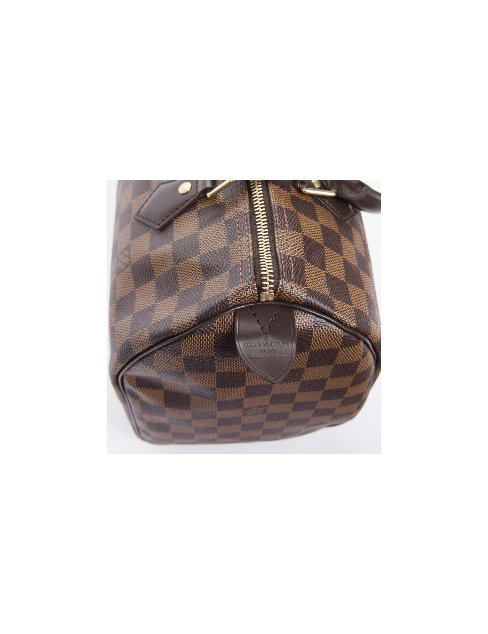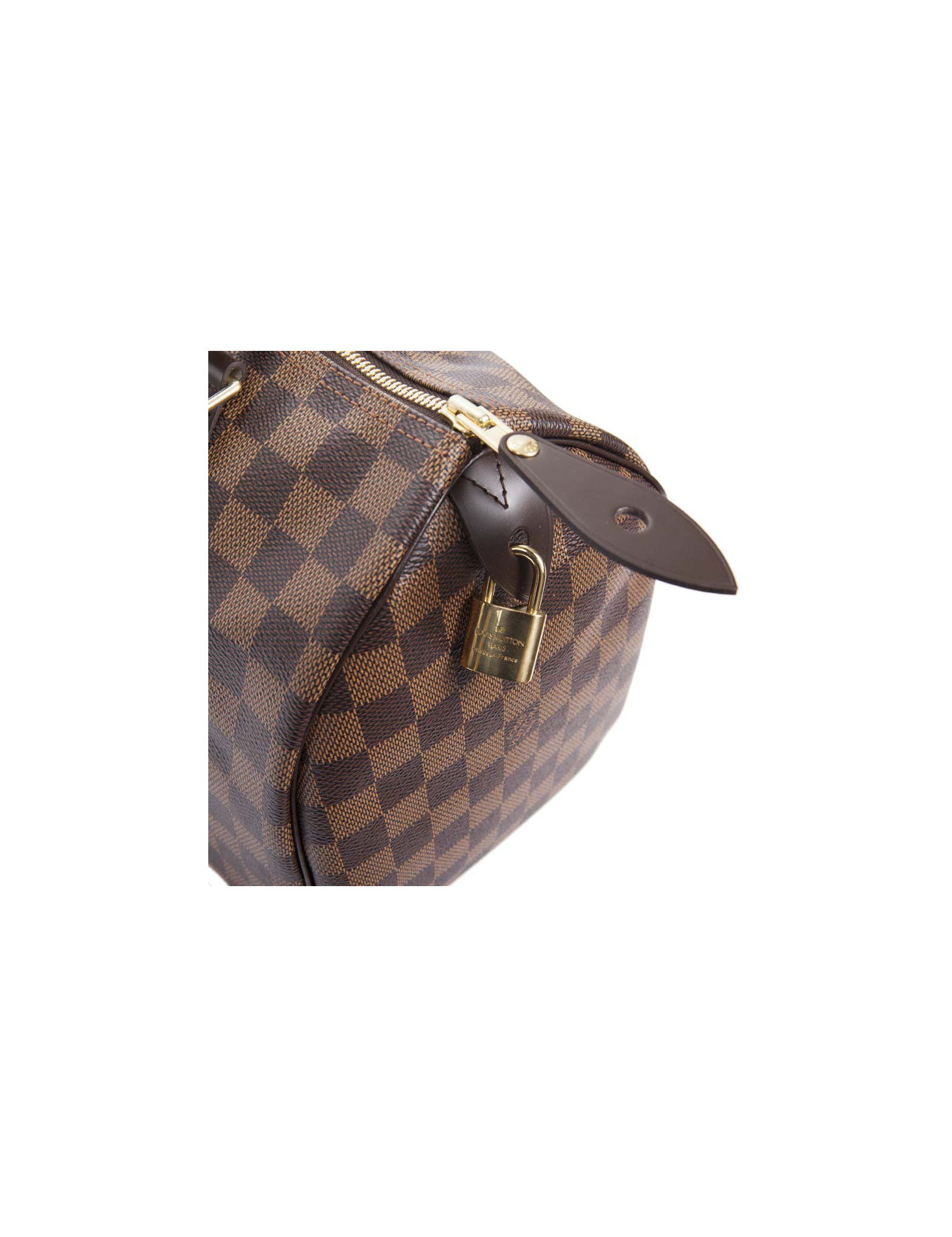 Sac 'speedy 30' de la Maison Louis Vuitton en toile damier. La bijouterie est en métal doré. Fermeture zippée sécurisée par un cadenas et deux clefs. L'intérieur est en toile rouge avec une poche plaquée. Porté main. Etat neuf. Prix public: 760 euros.