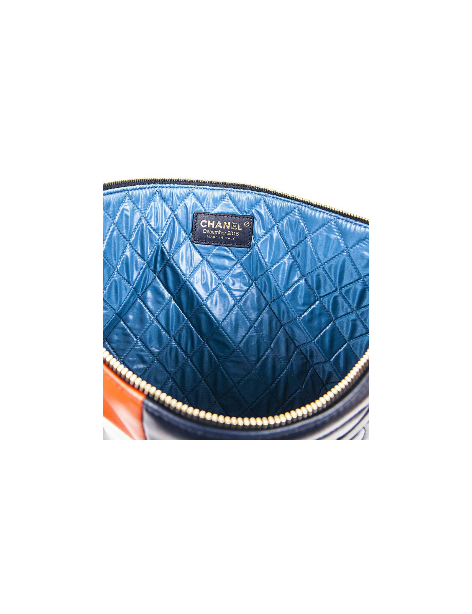 Cette pochette CHANEL est en cuir d'agneau lisse multicolore. La fermeture est zippée et dorée. L'intérieur est matelassé en toile parachute bleue.
