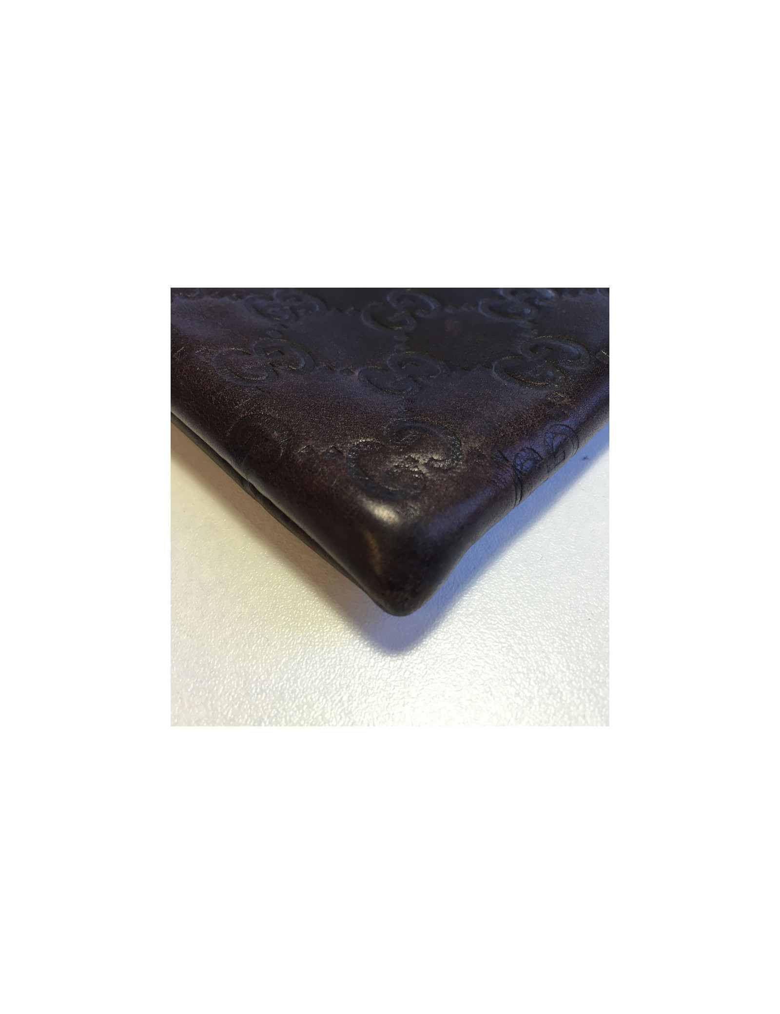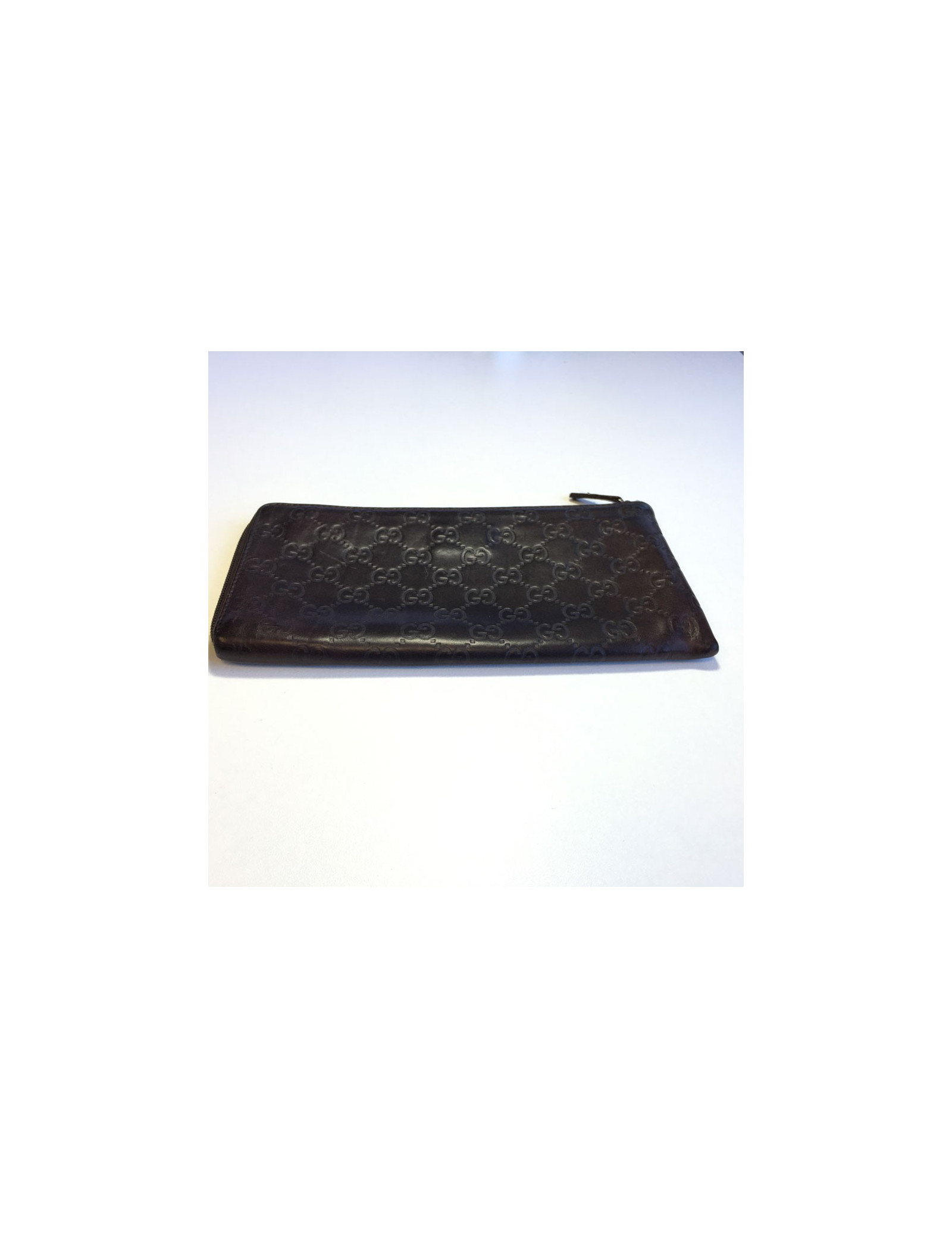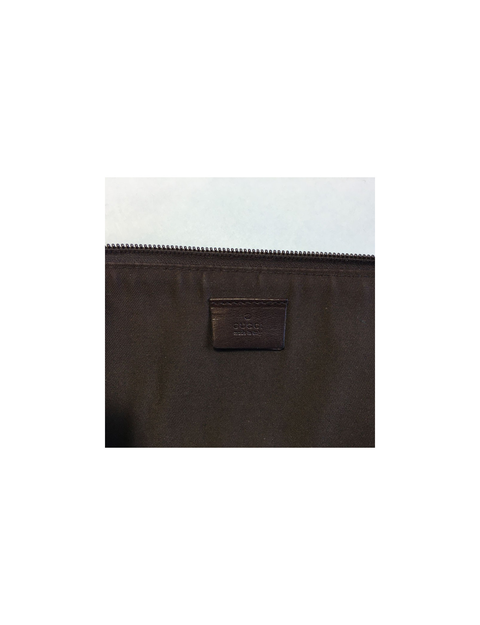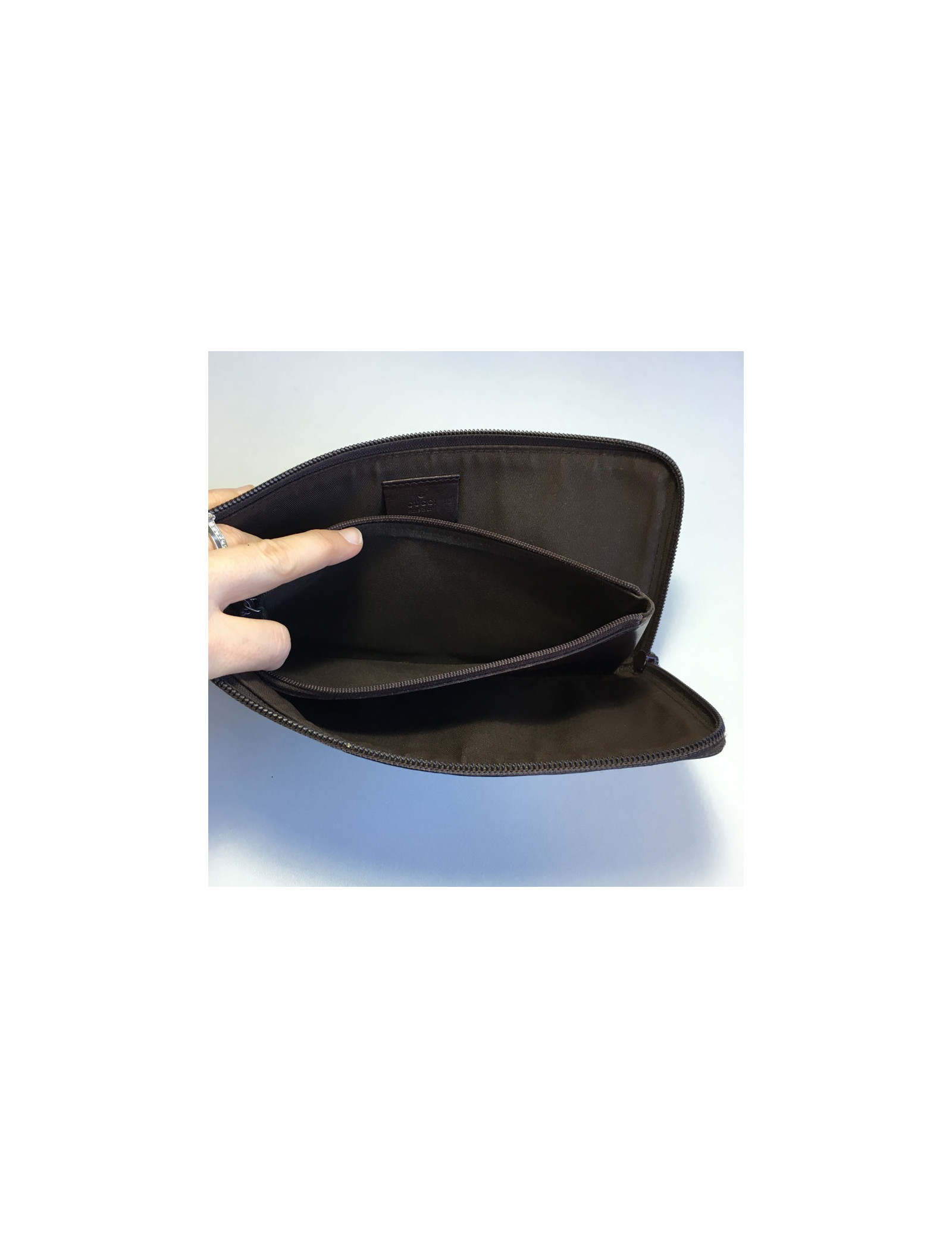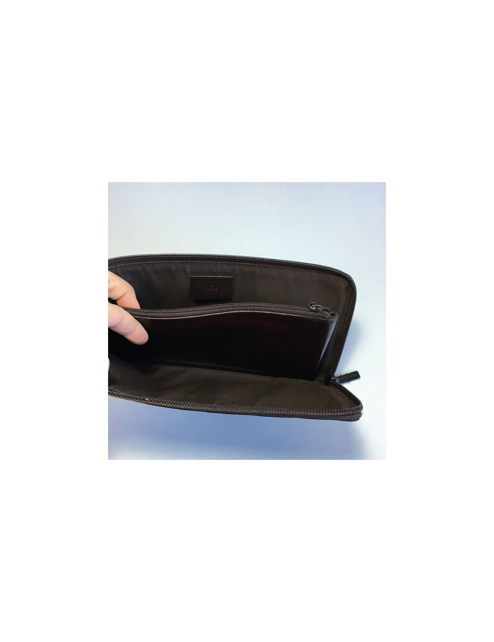 Pochette GUCCI monogram embossé zippée en cuir marron, intérieur en tissu. Une pochette plus petite en cuir marron et également zippée se trouve à l'intérieur. Les coins en bas sont légèrement usés, le cuir est légèrement patiné sur le bas de la pochette.