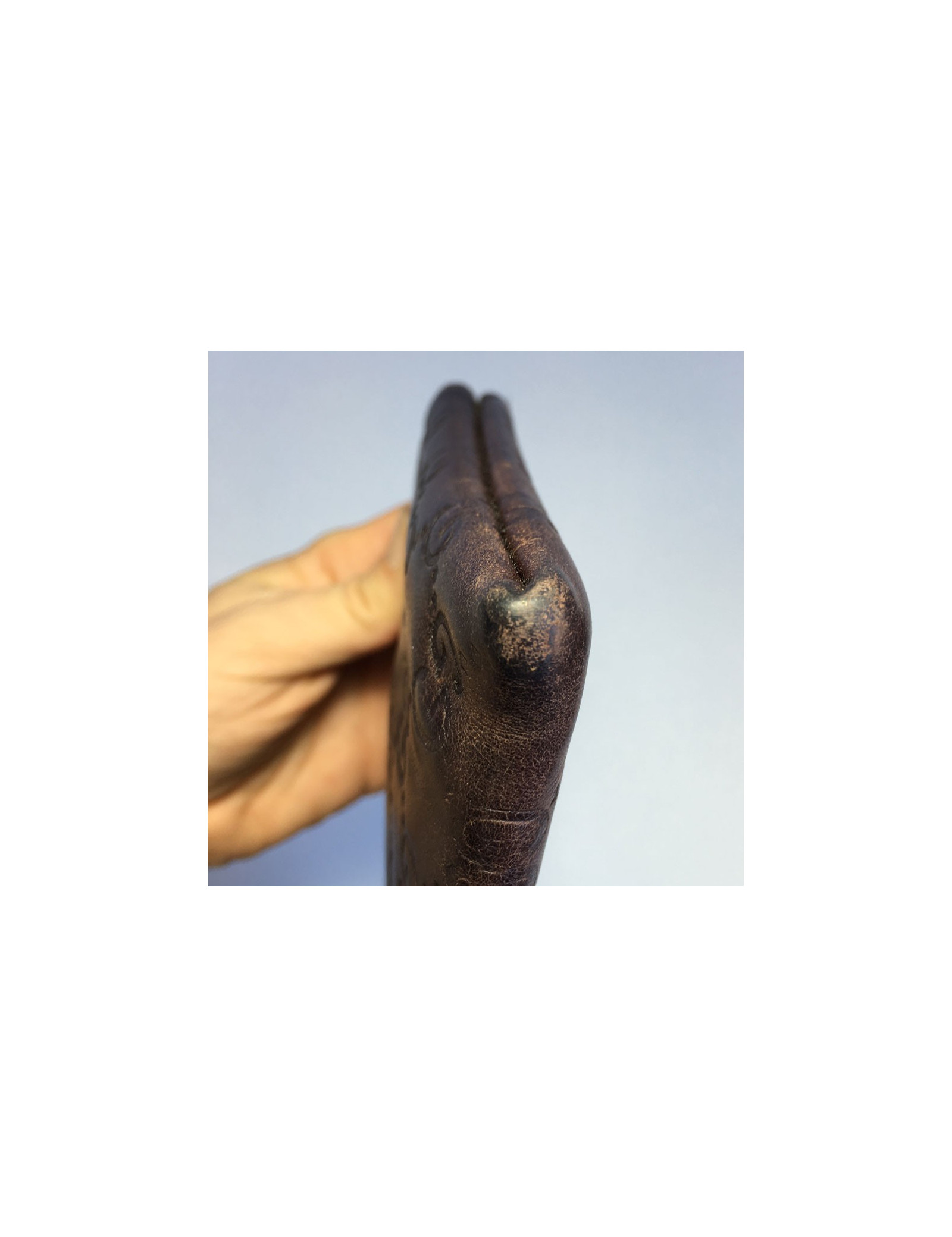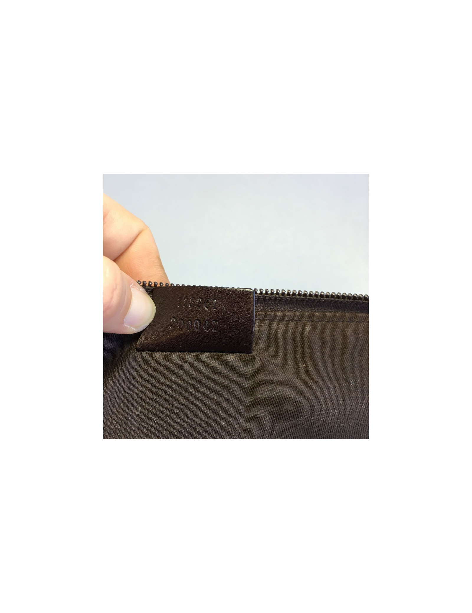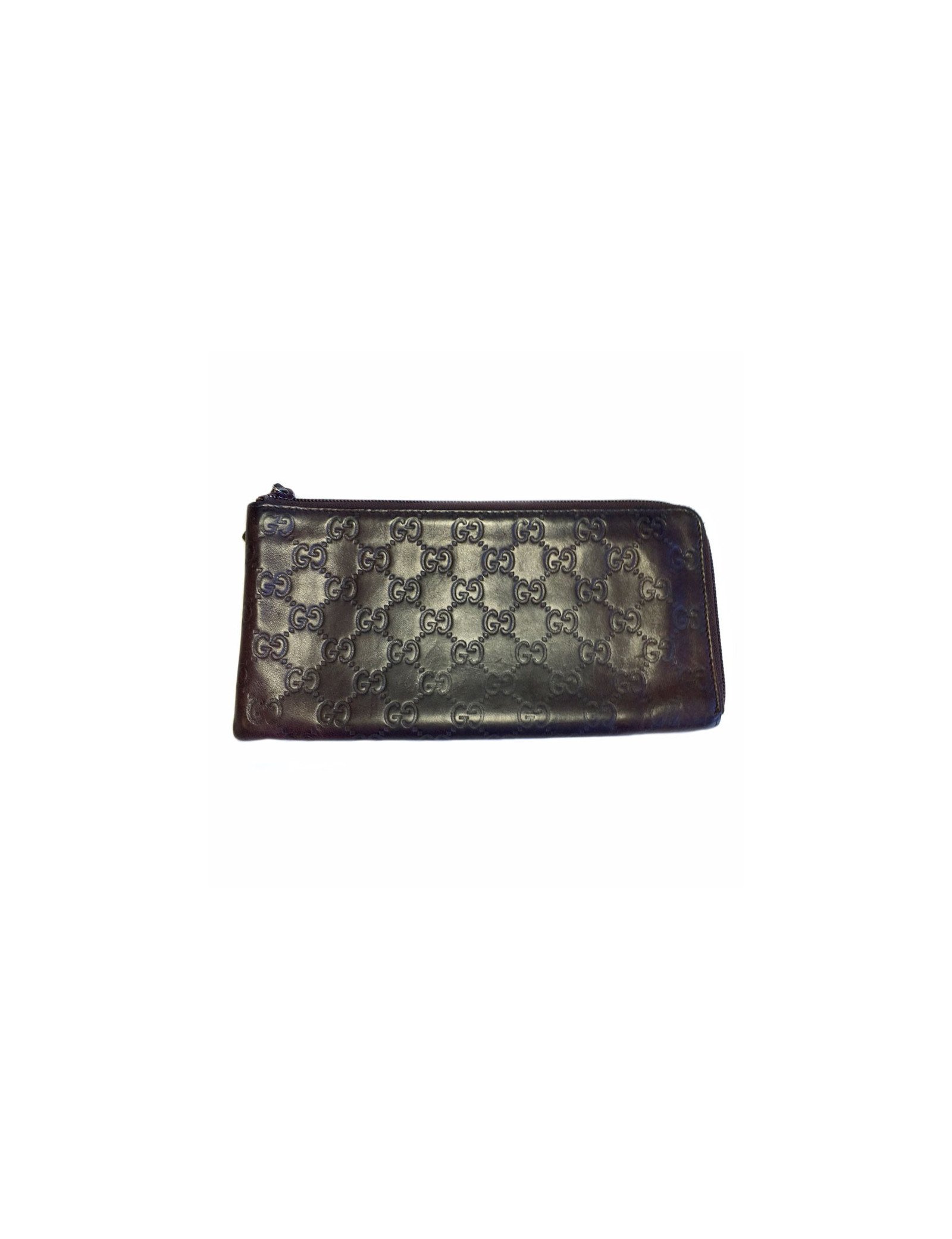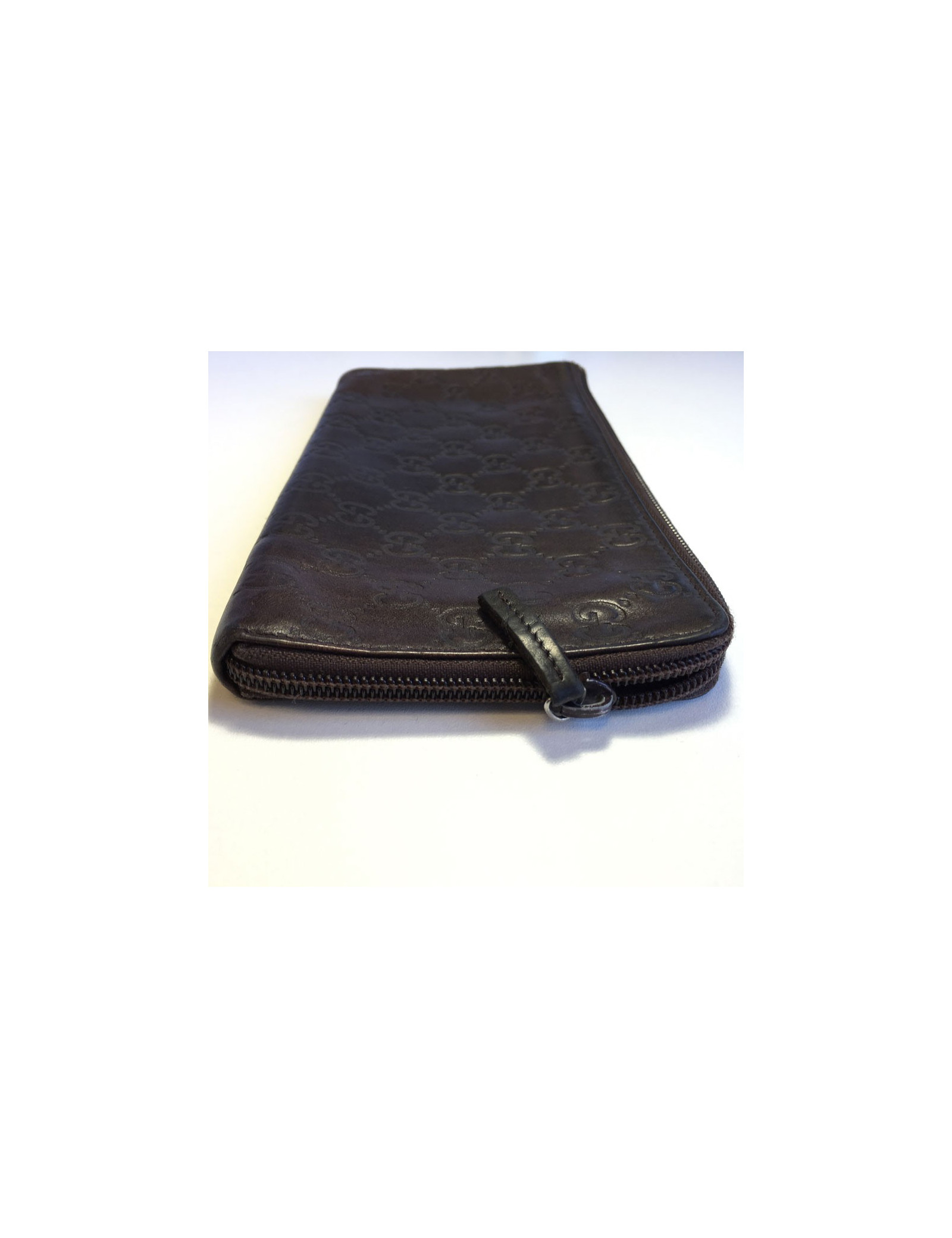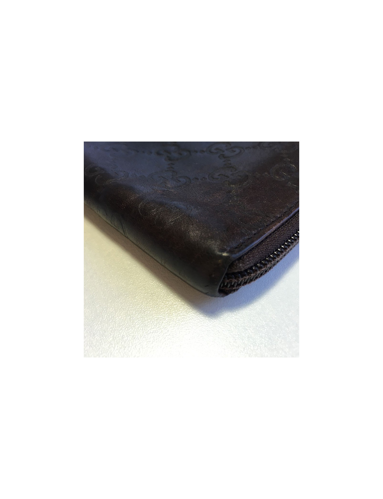 Pochette GUCCI monogram embossé zippée en cuir marron, intérieur en tissu. Une pochette plus petite en cuir marron et également zippée se trouve à l'intérieur. Les coins en bas sont légèrement usés, le cuir est légèrement patiné sur le bas de la pochette.