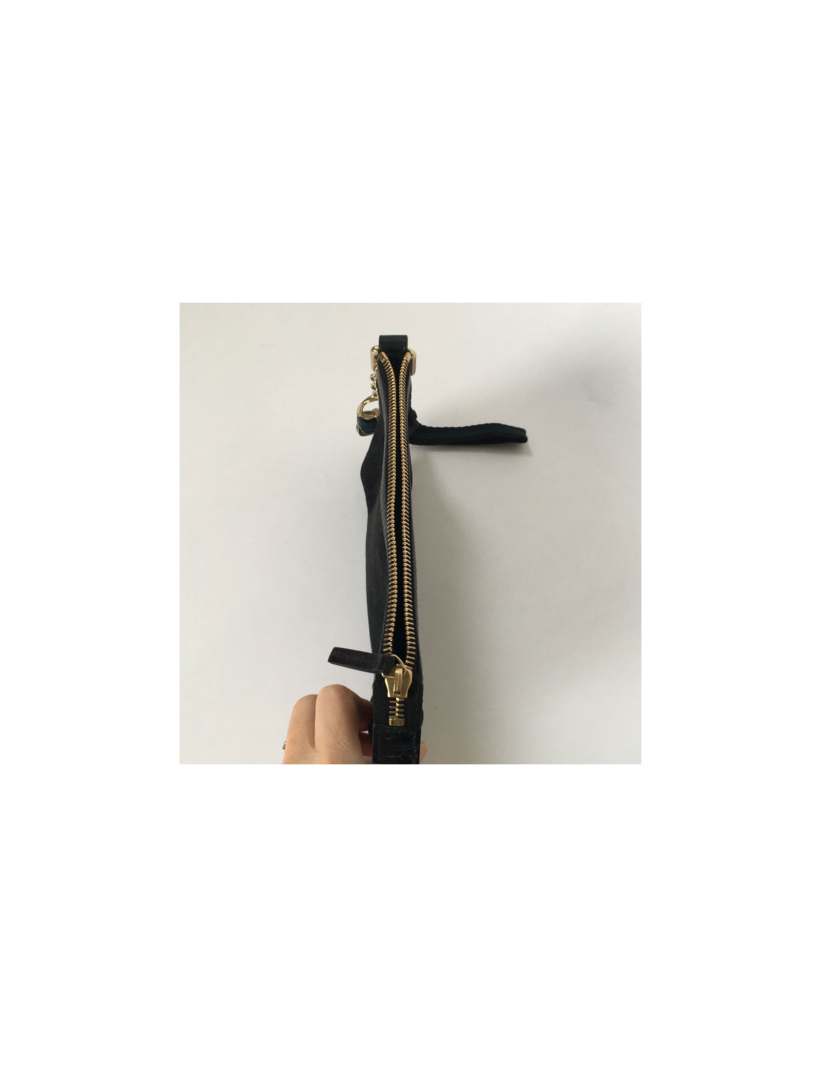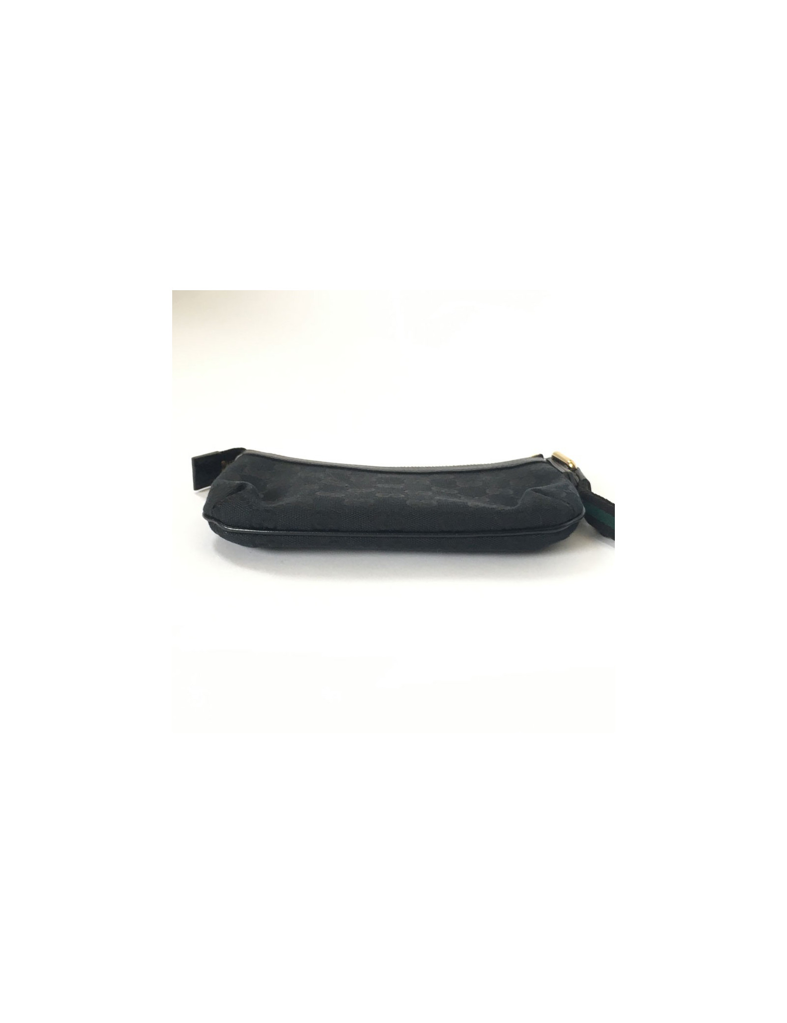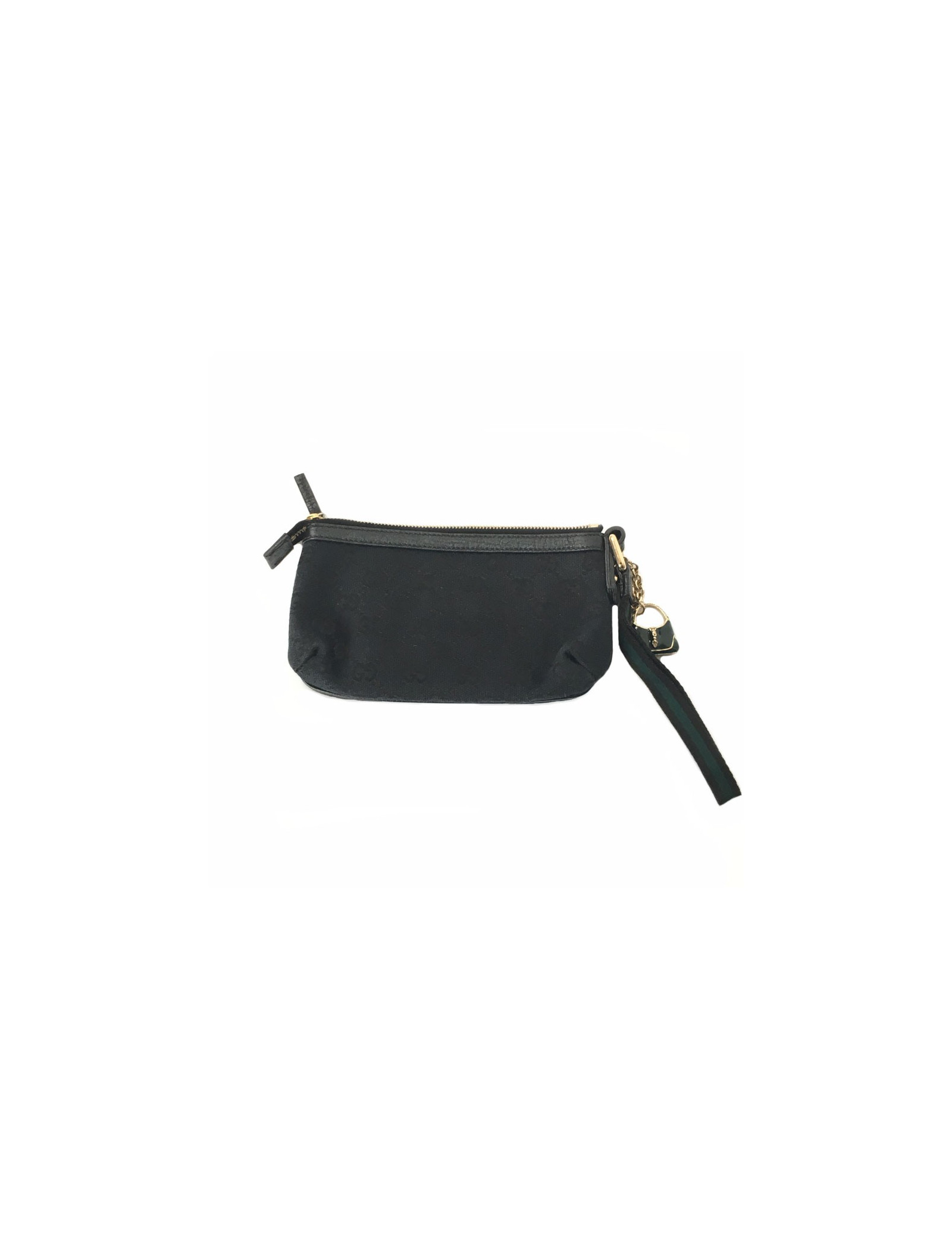 Pochette GUCCI zippée en tissu noir monogram. Un charm "sac" en métal couleur or pâle est accroché à la fermeture éclair. A l'intérieur, en tissu noir, se trouve une petite pochette. Petite anse pour le poignet.