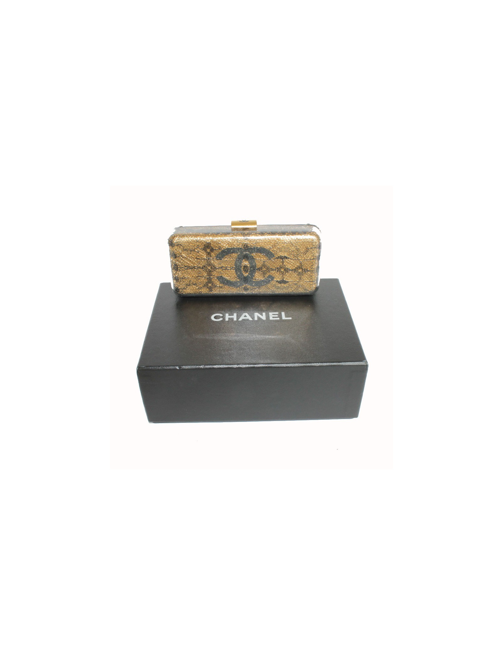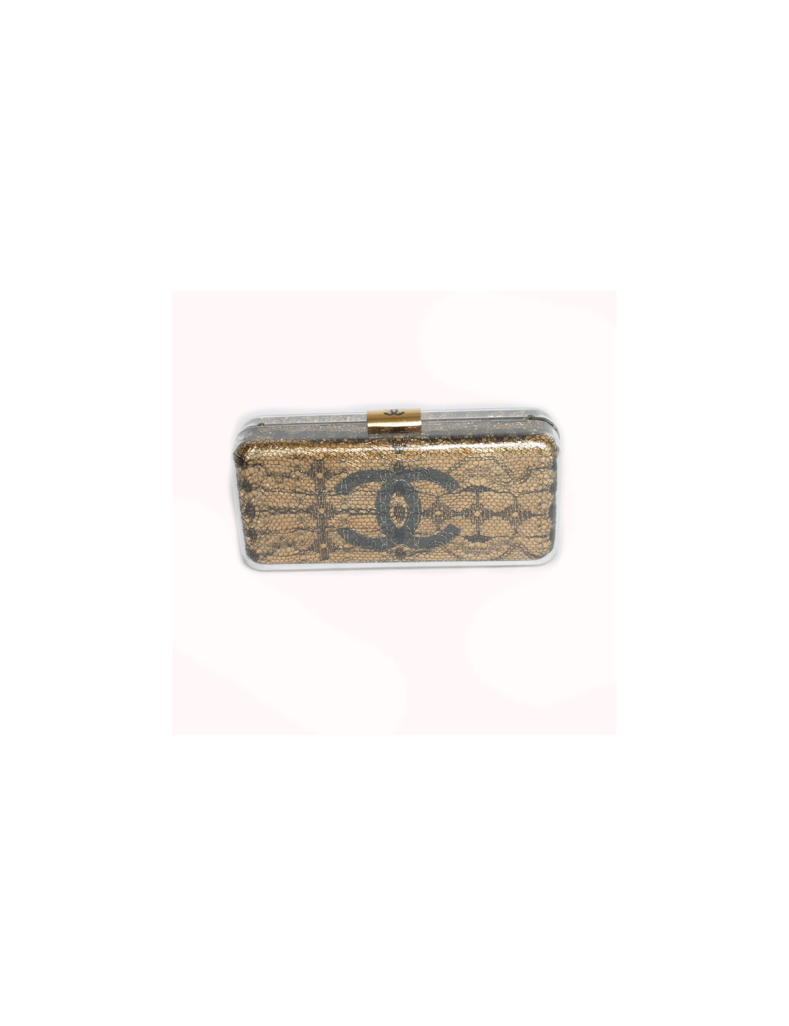 Ravissante minaudière du soir de la Maison Chanel en plexiglas avec inclusion de dentelle. Bijouterie dorée. L'intérieur est en cuir lamé doré. Porté épaule et crossover. Pas d'hologramme, ni de carte d'authenticité. En très bon état.