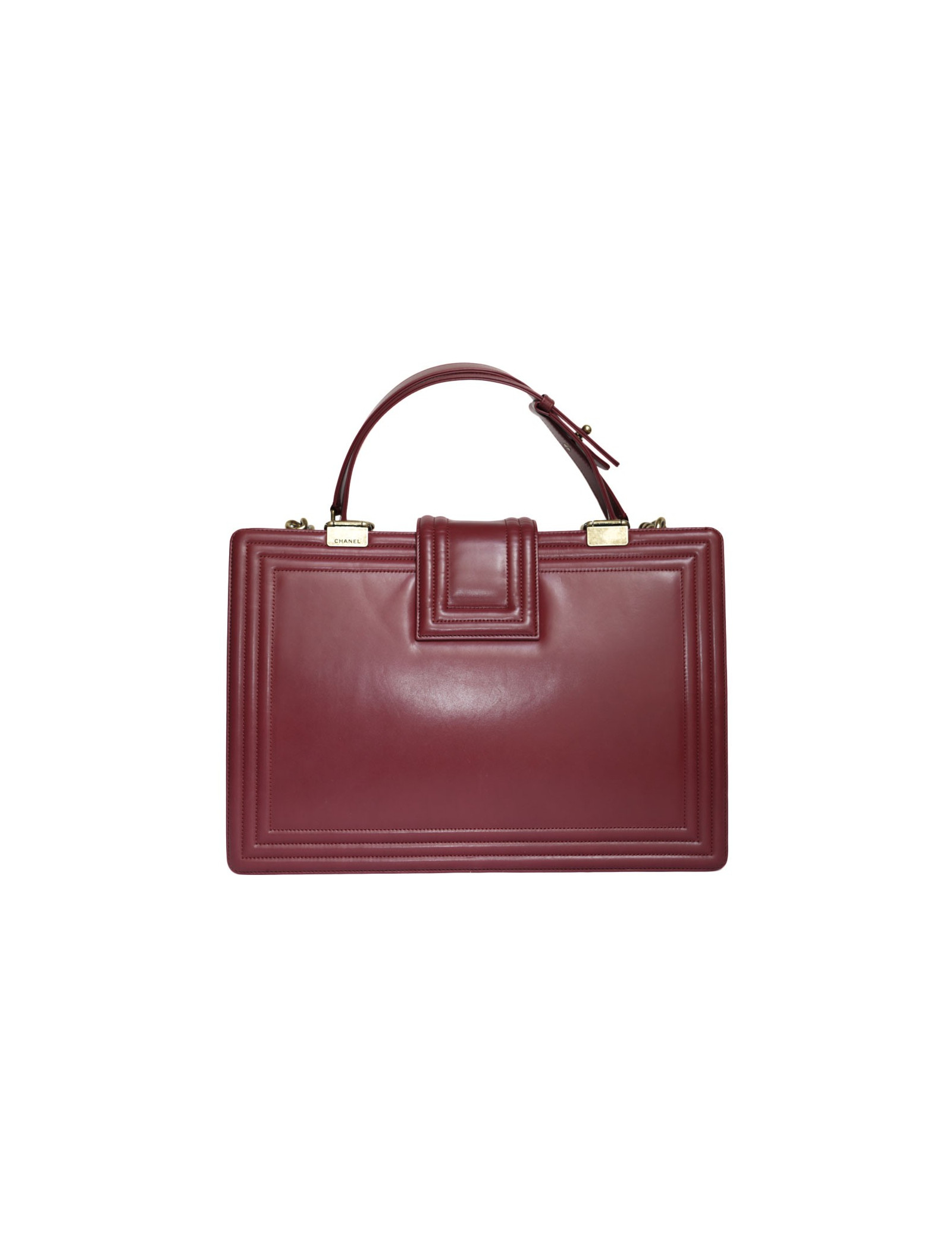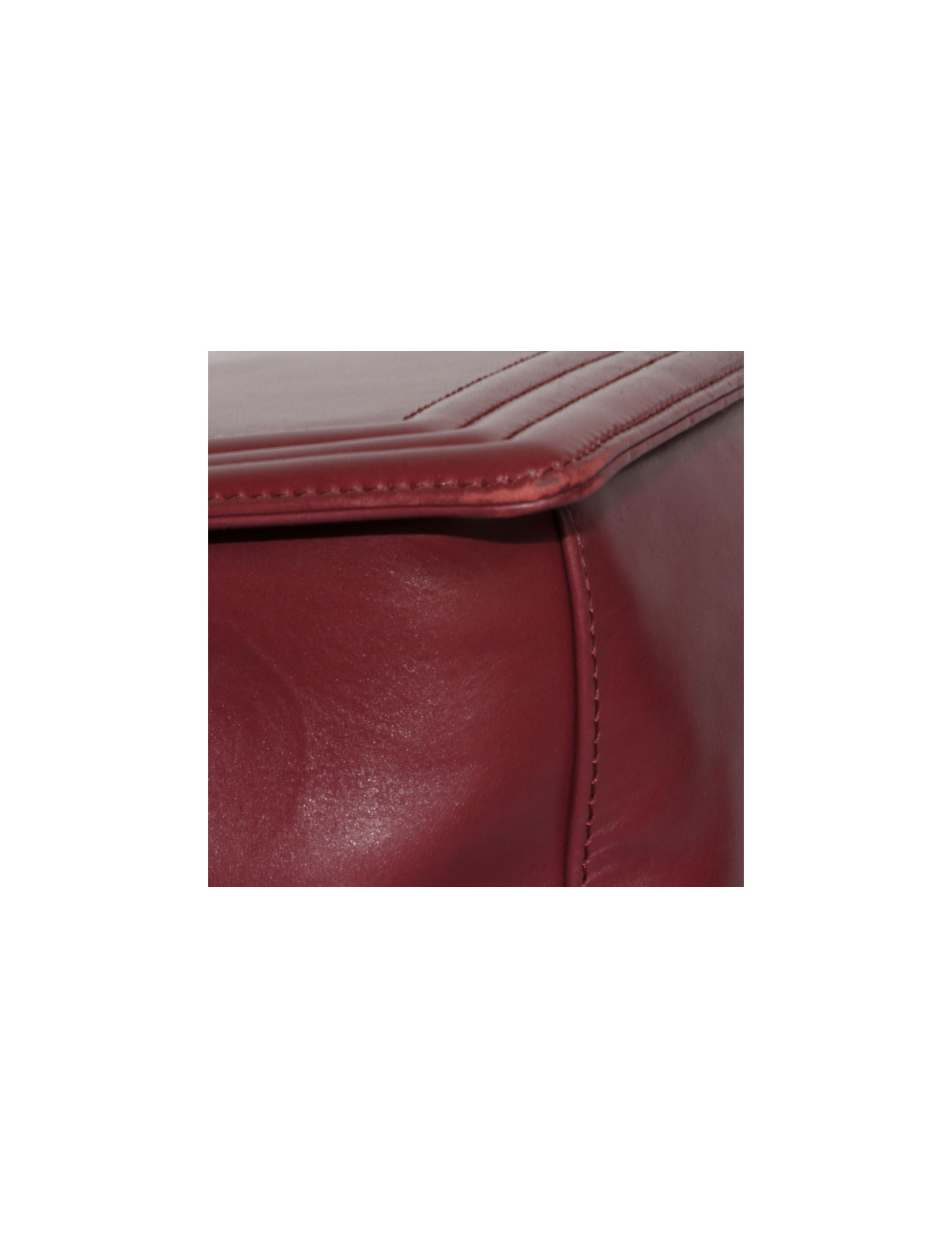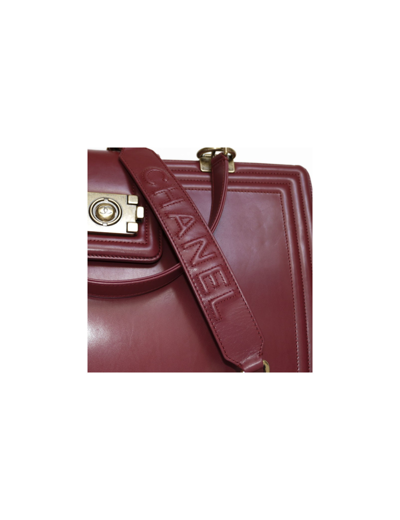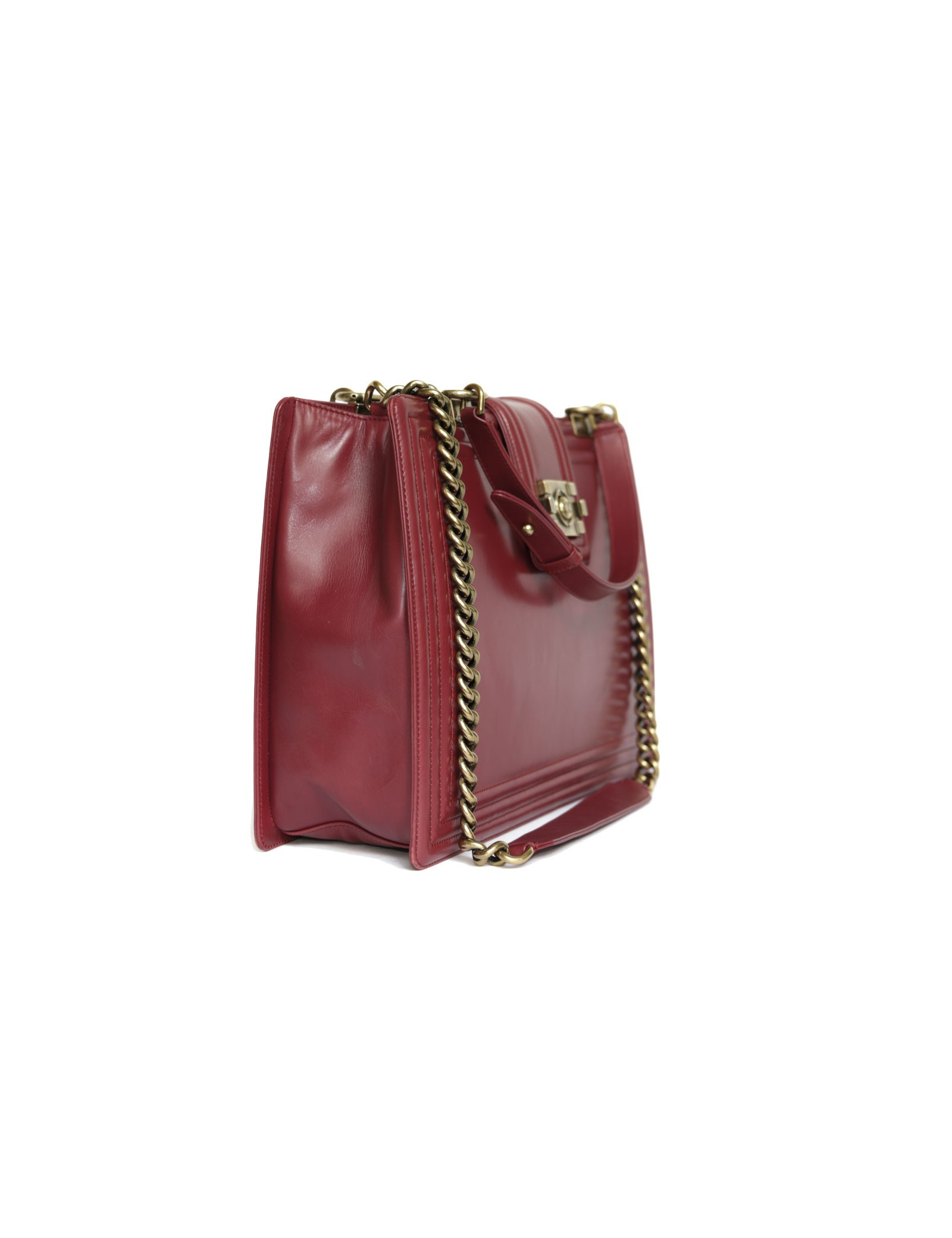 Sac cabas en cuir d'agneau lisse bordeaux de la Maison Chanel. Fermoir "boy". L'accastillage est doré cuivré. Porté à la main avec deux anses et à l'épaule à l'aide d'une bandoulière. L'intérieur est en toile marron avec 3 poches dont 1 zippée, 1 pour smartphone et une plaquée.