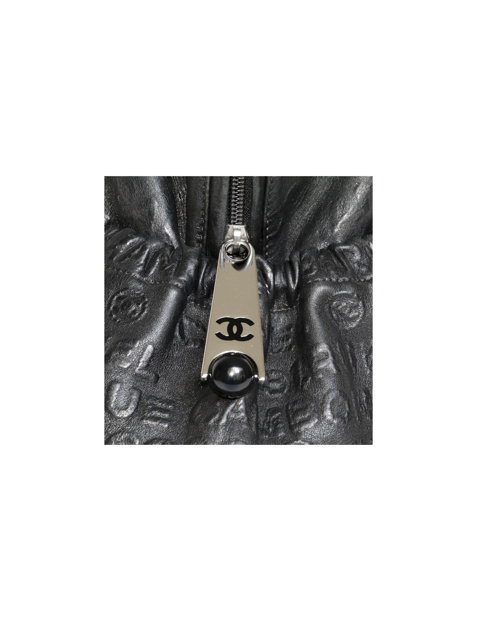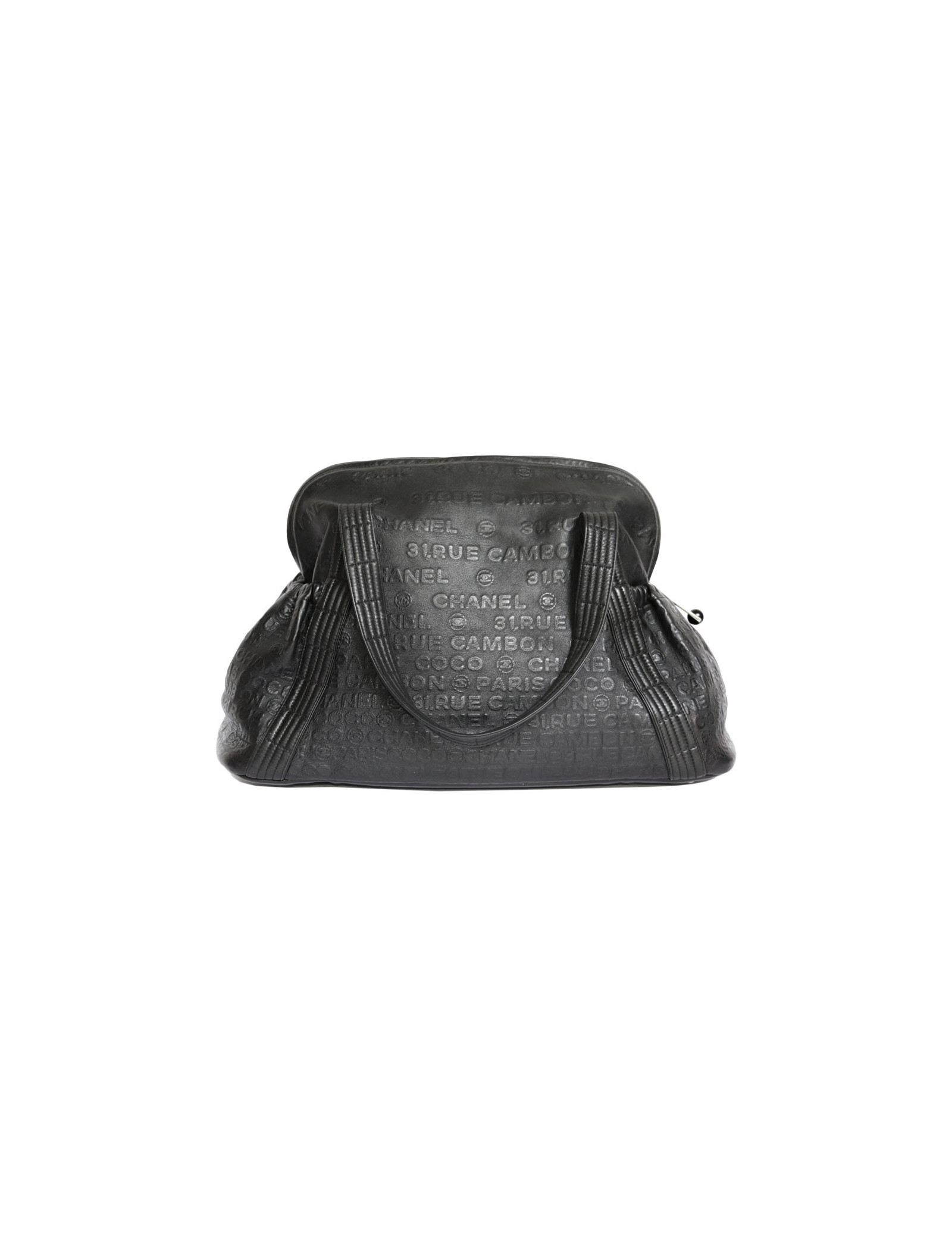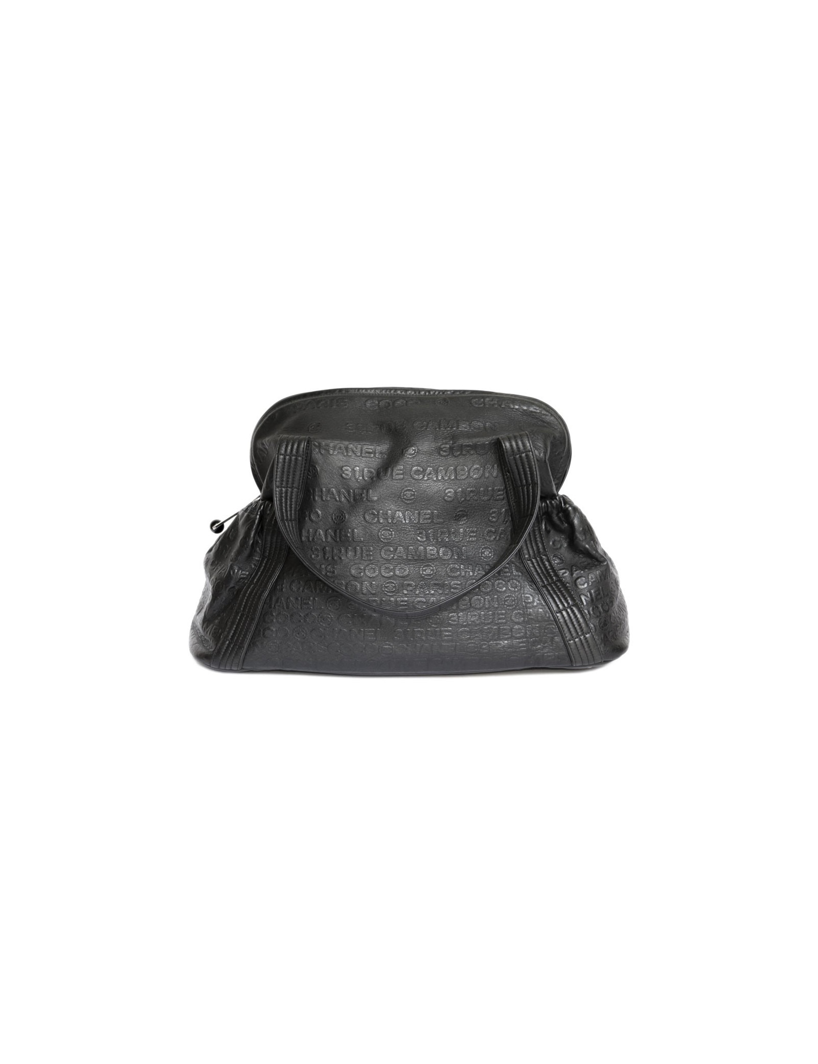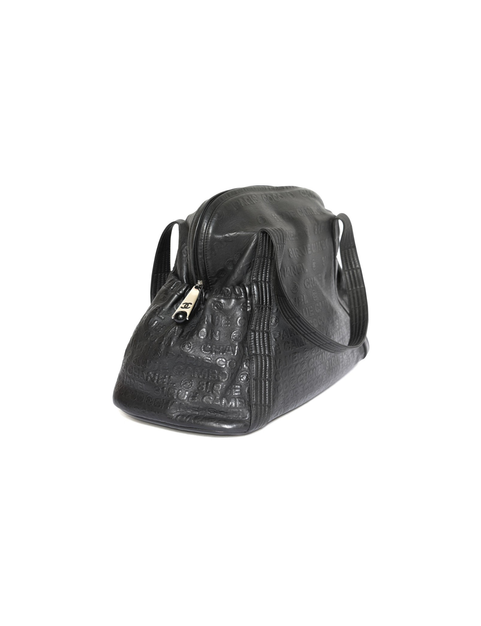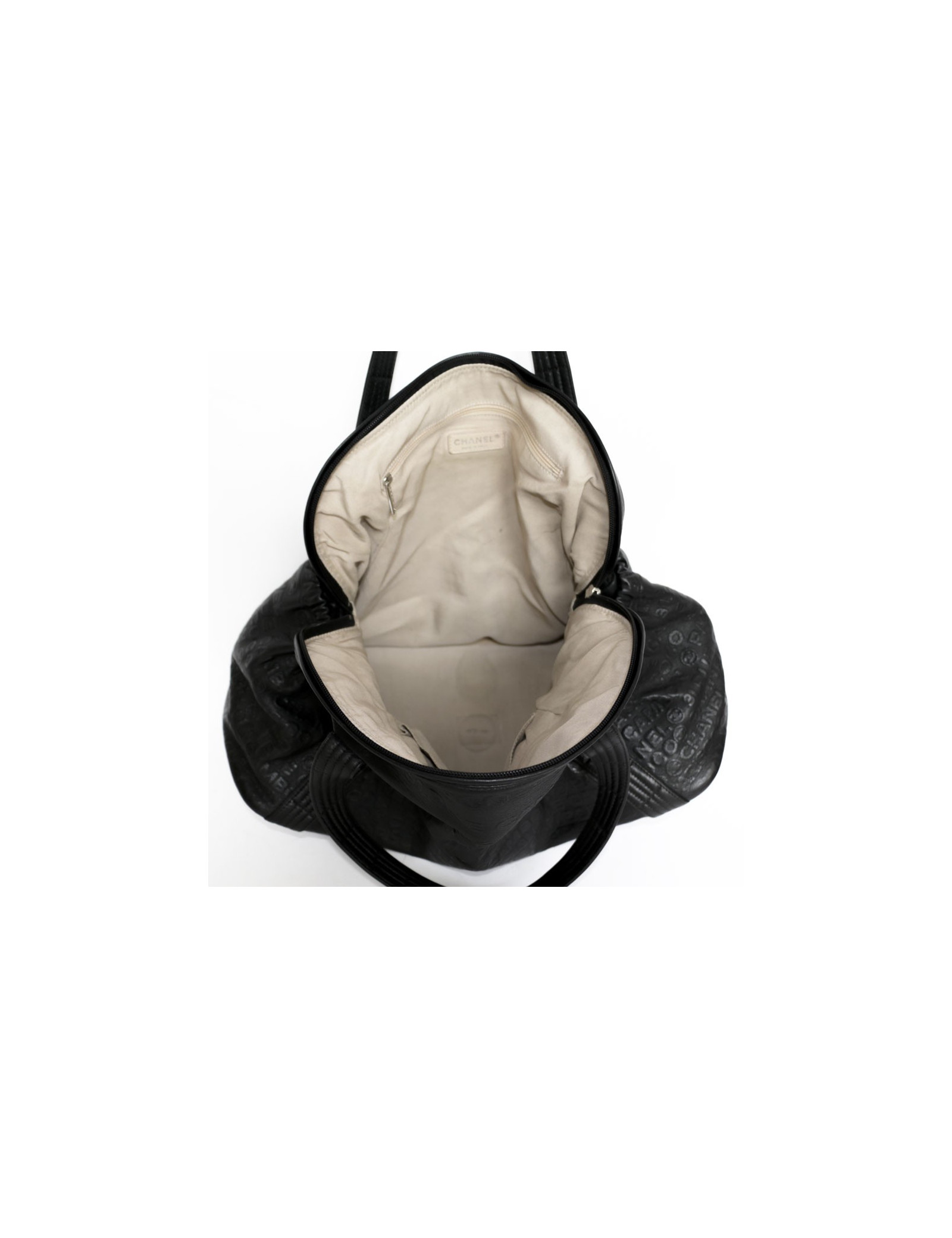 Sac cabas Chanel, en cuir noir embossé avec inscriptions: "Chanel", "coco", "Paris Cambon. Fermeture zippée. Bijouterie argent palladié.