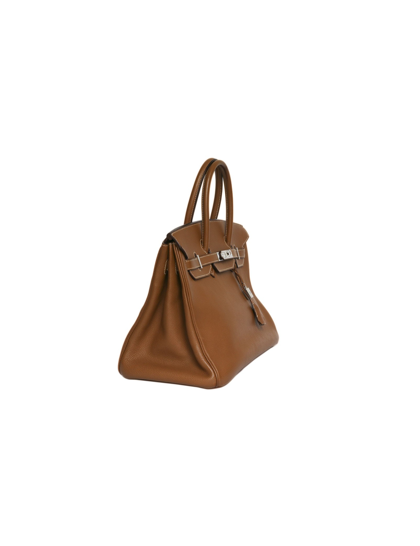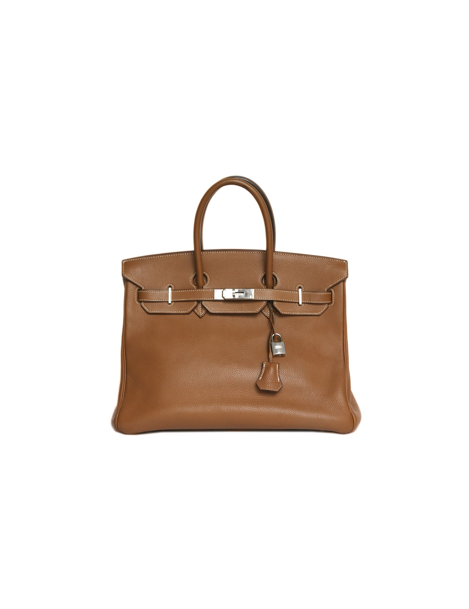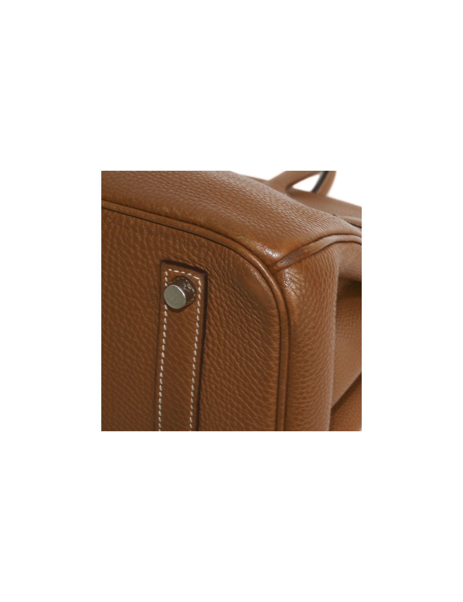 Birkin 35 togo gold de la Maison Hermès. Bijouterie argent palladié. A l'intérieur, 2 grandes poches plaquées dont 1 zippée. Tirette, clochette, cadenas et clefs. Lettre J dans un carré. En très bon état. Très légère usure des coins sous le sac.
