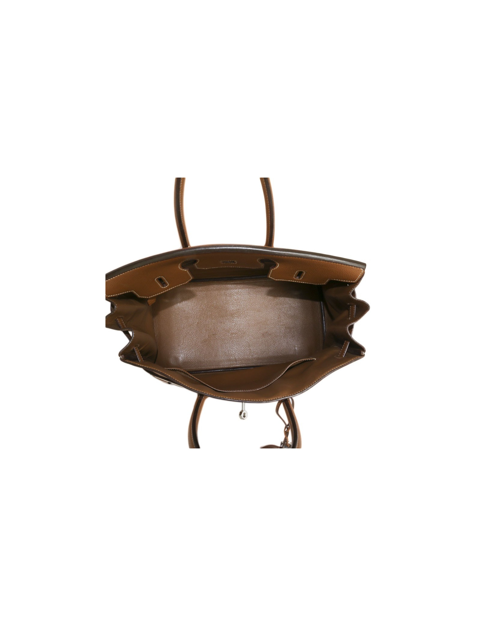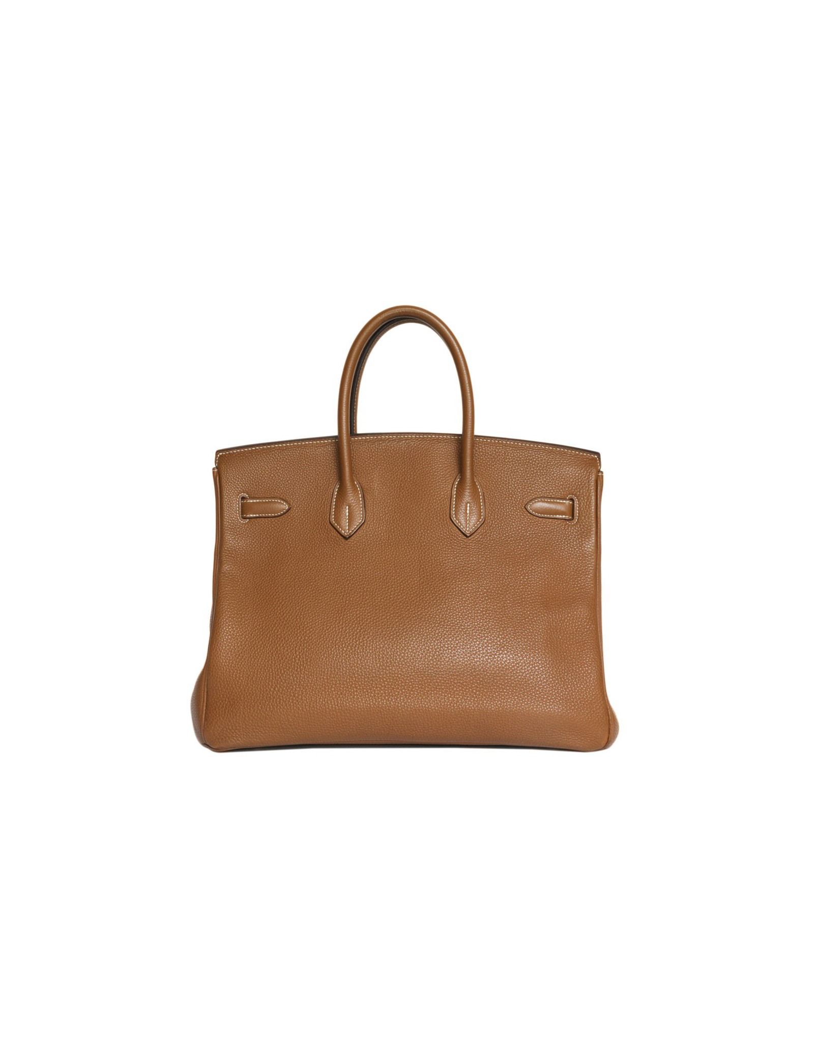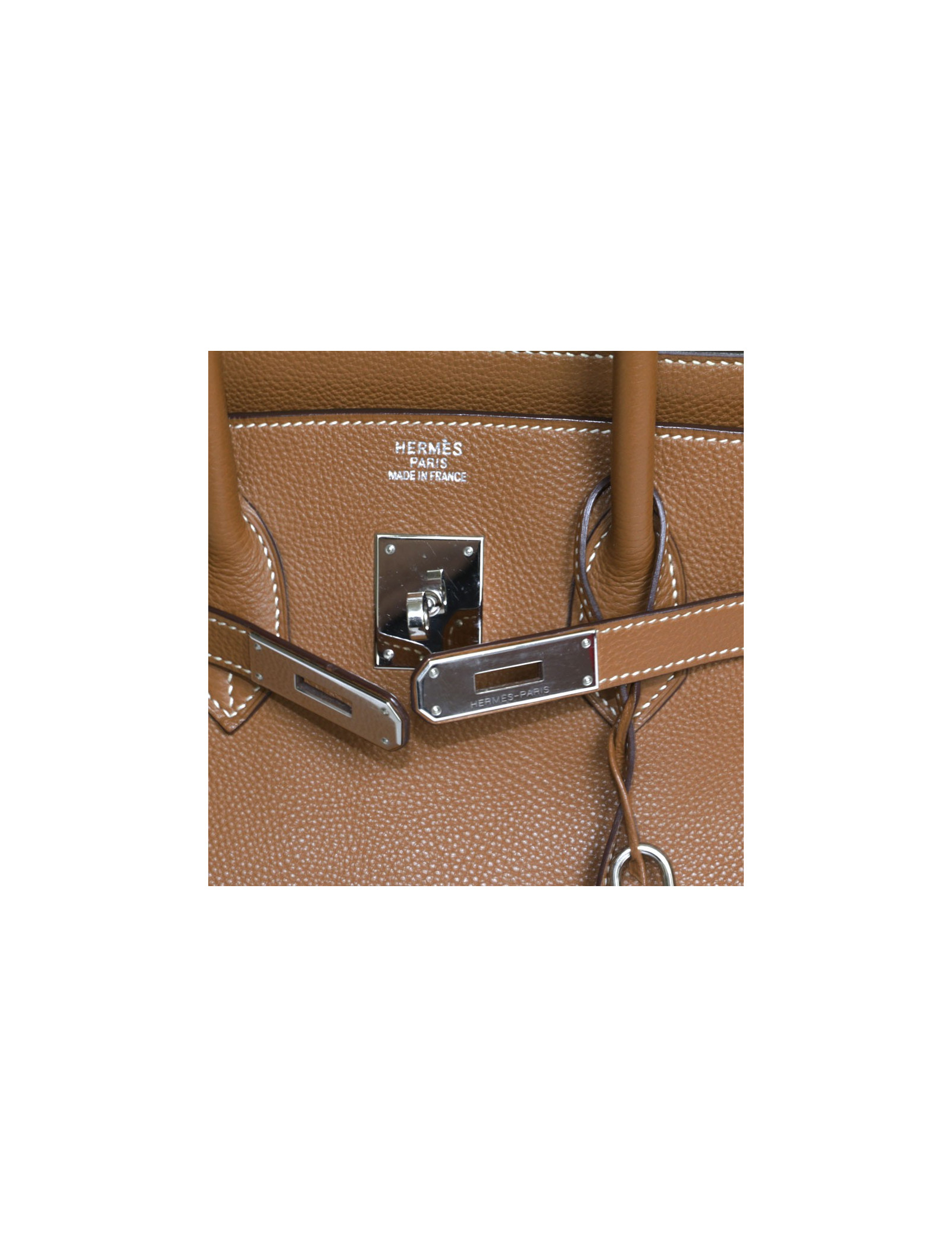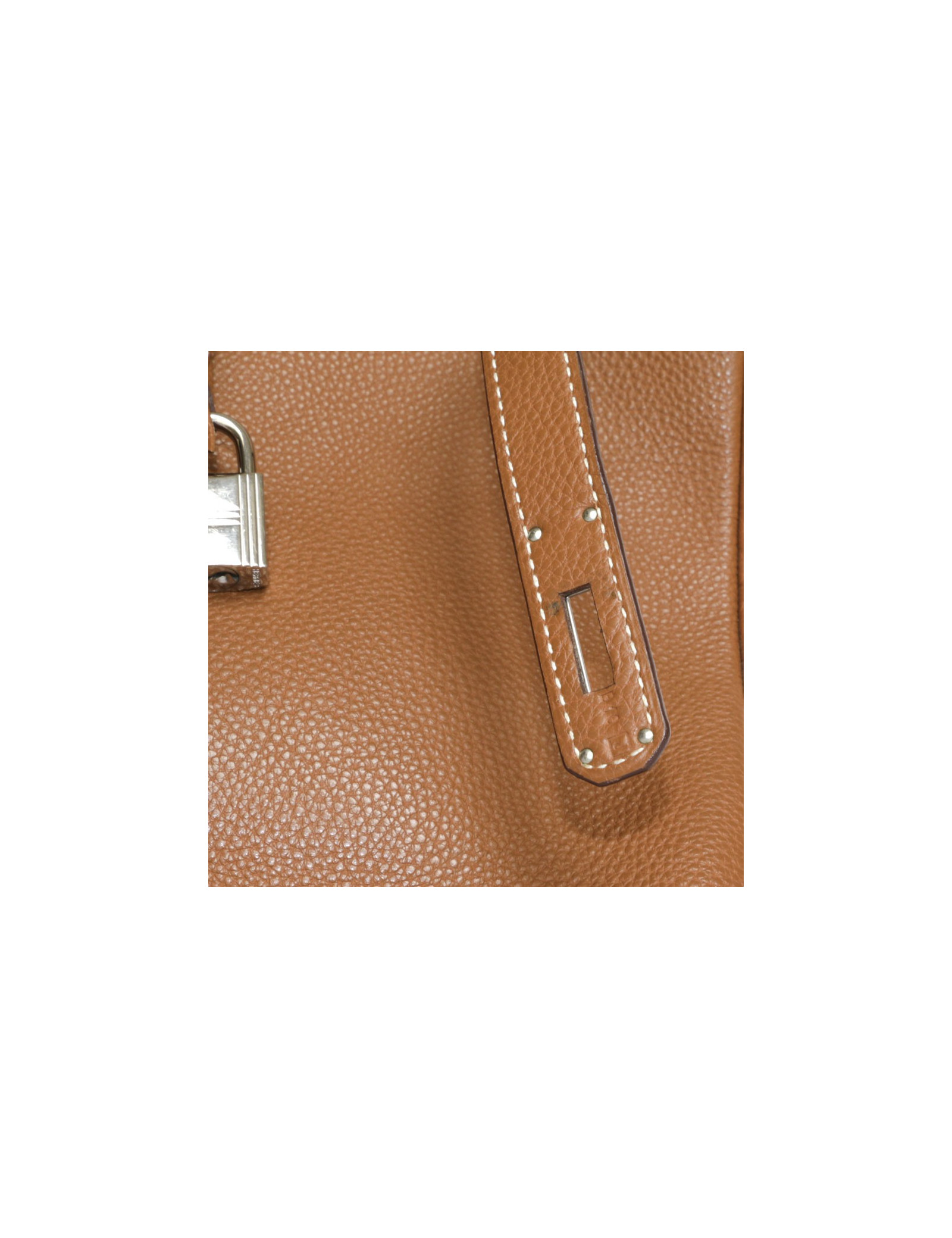 Birkin 35 togo gold de la Maison Hermès. Bijouterie argent palladié. A l'intérieur, 2 grandes poches plaquées dont 1 zippée. Tirette, clochette, cadenas et clefs. Lettre J dans un carré. En très bon état. Très légère usure des coins sous le sac.