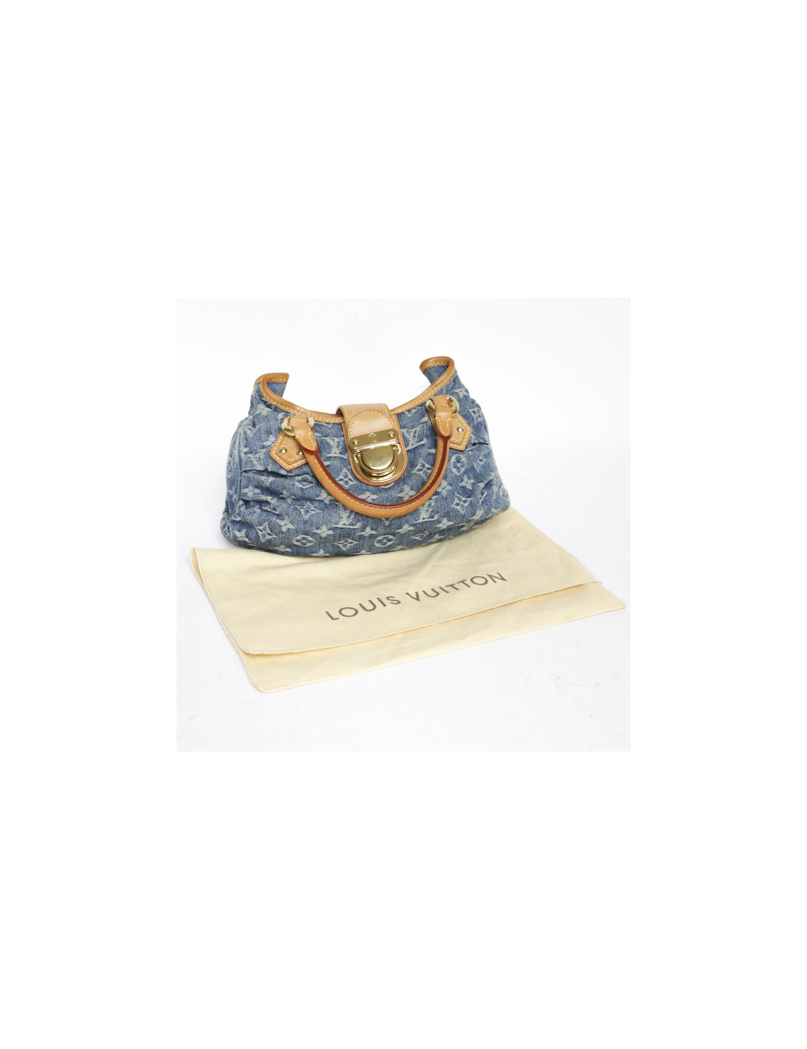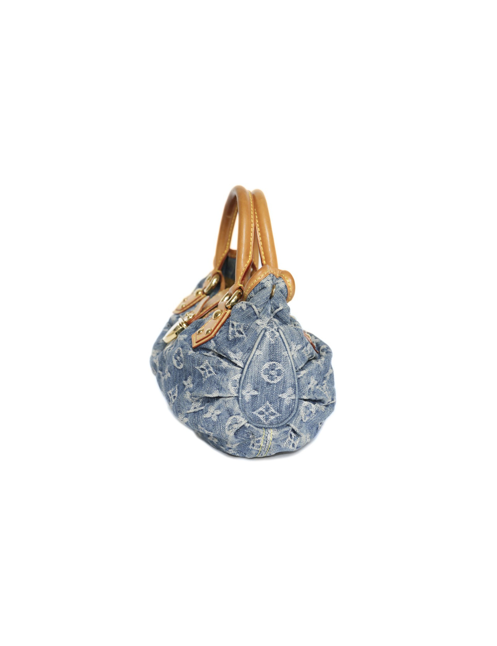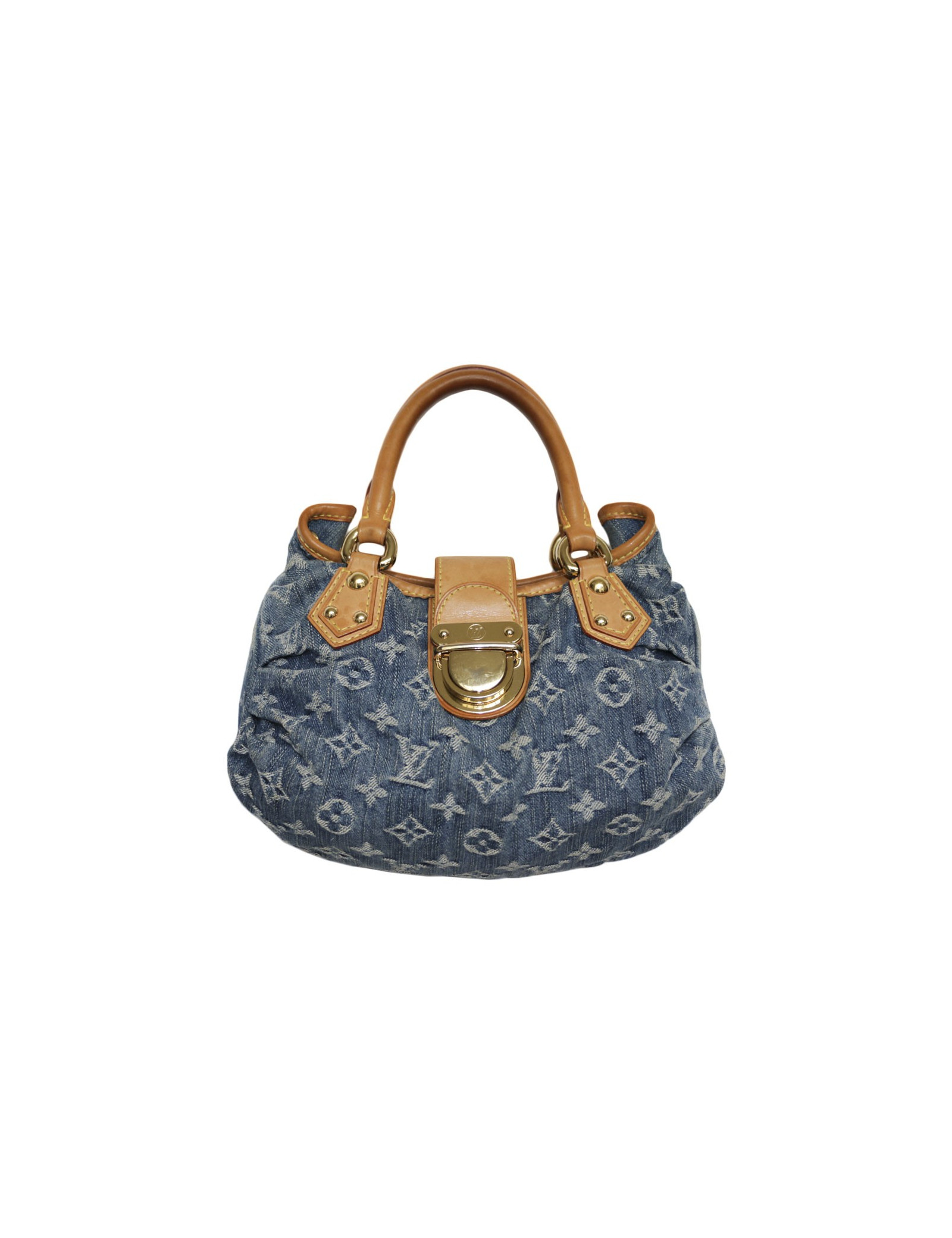 Sac Louis Vuitton "Pleaty" en toile denim monogram bleu crée par Marc Jacobs en 2005. Porté main. Bijouterie dorée (micro rayures).