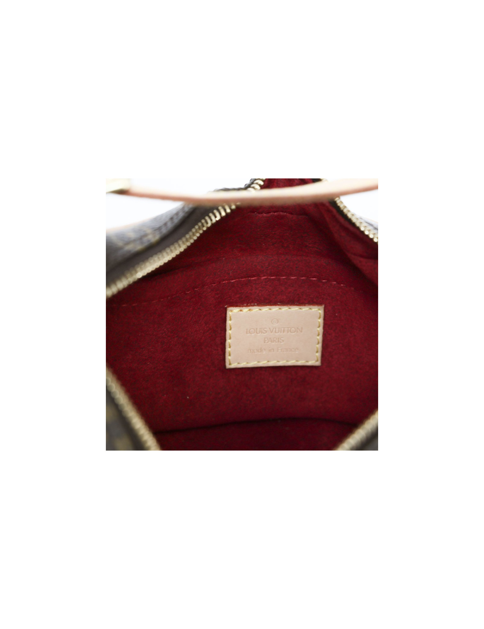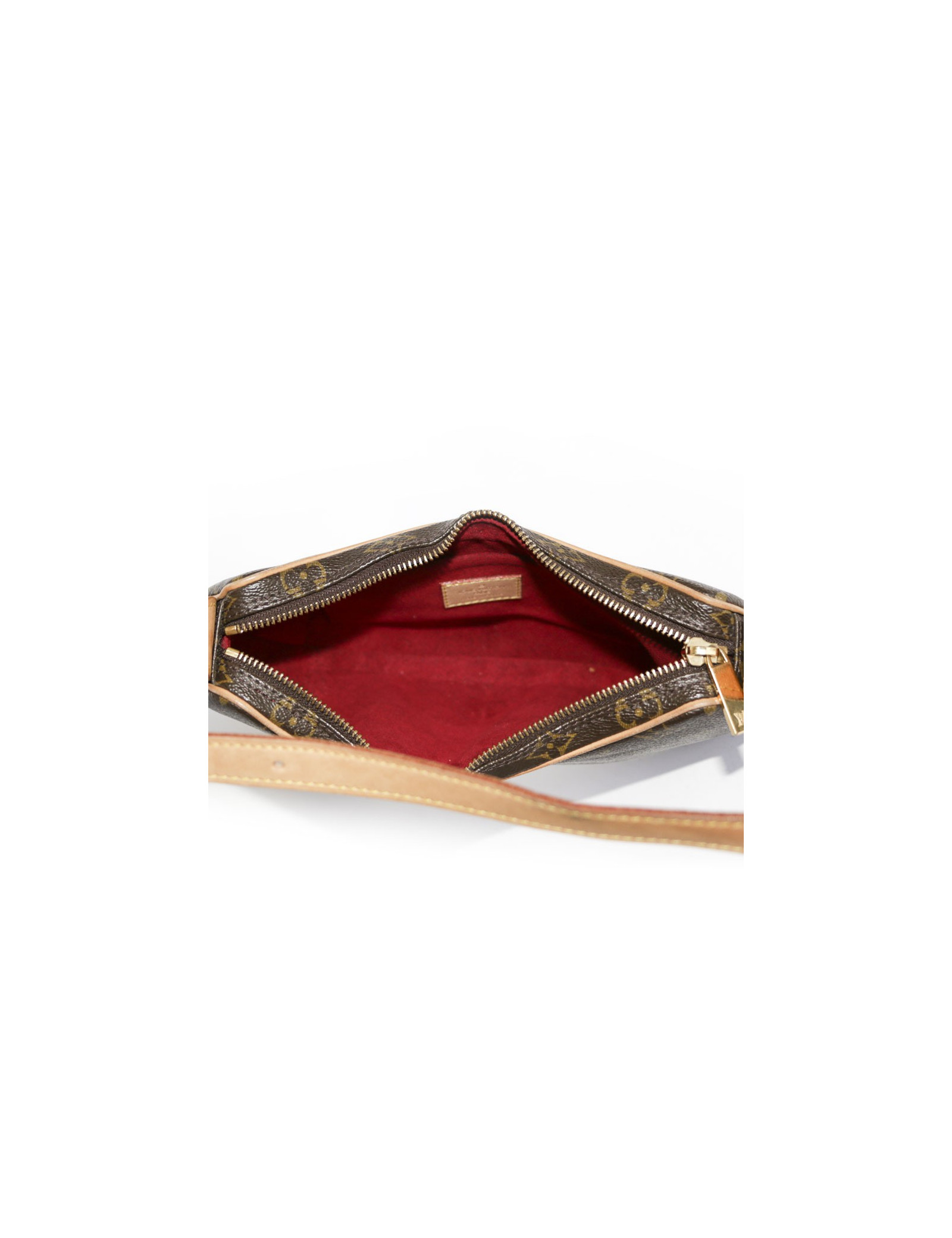 Sac en toile monogram de la Maison Louis Vuitton. Fermeture zippée. Bijouterie doré. L'intérieur est en suède rouge. L'anse réglable est en cuir de vache naturelle avec une poche plaquée. En très bon état.