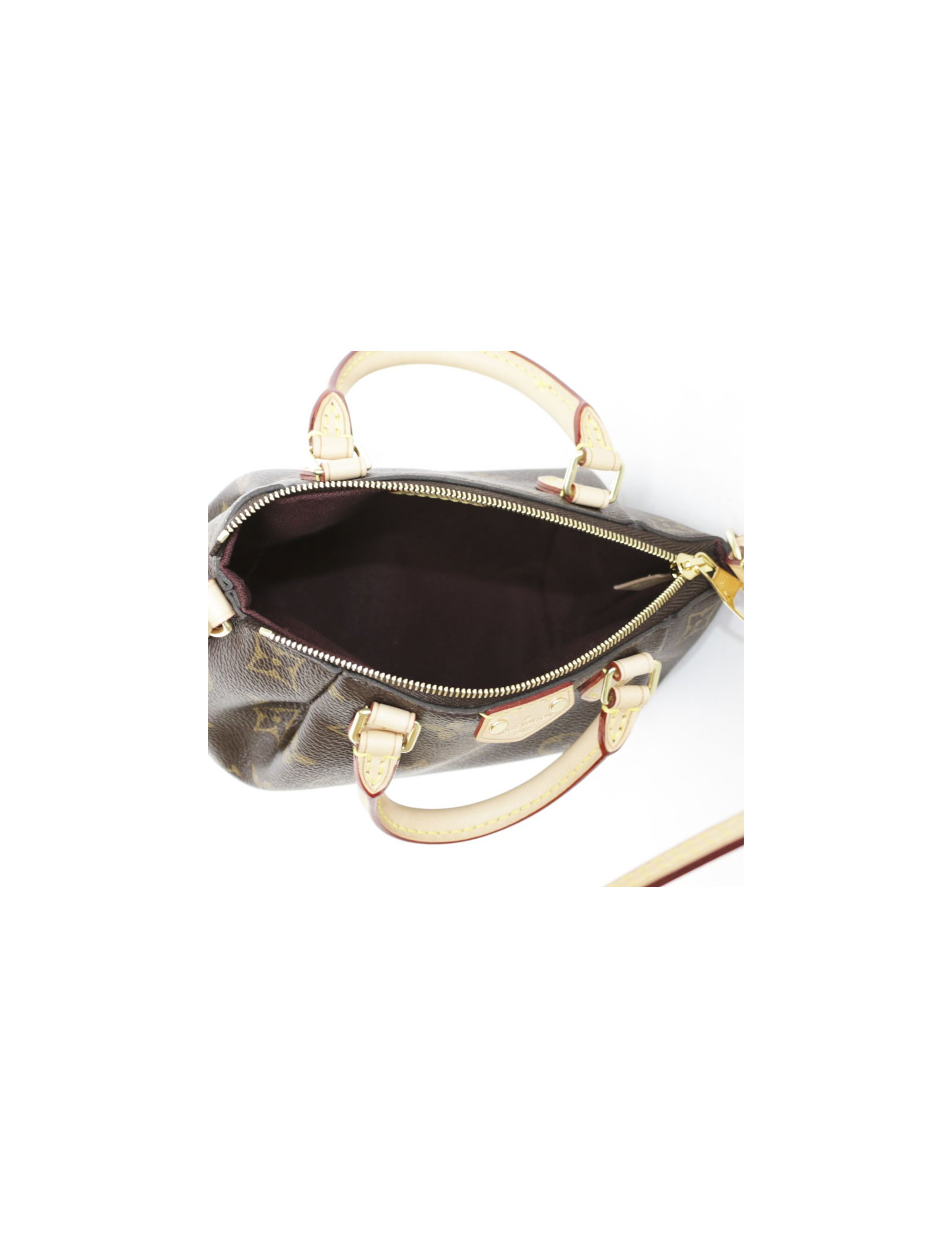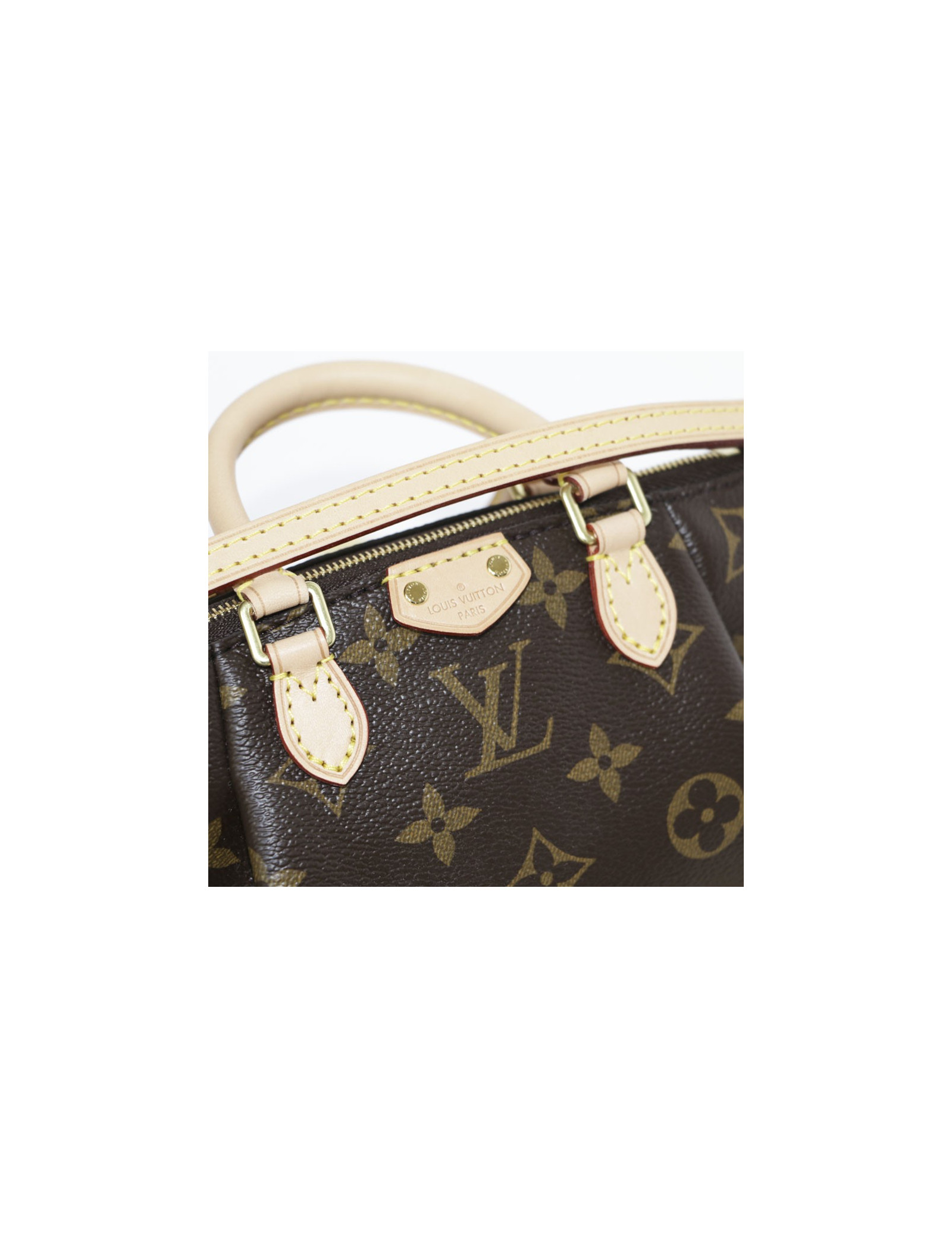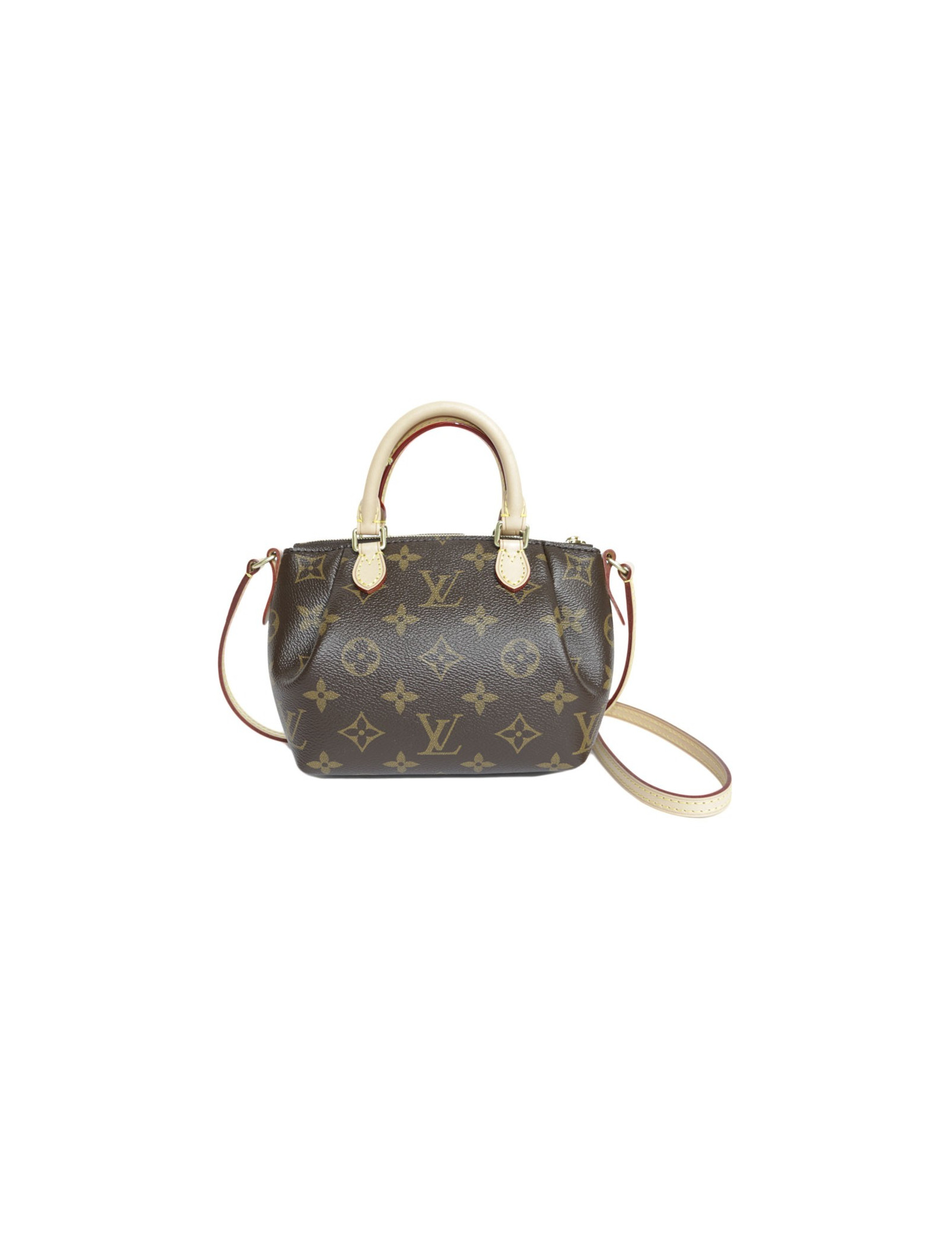 Mini sac Nano Turenne, en toile monogram. Il se porte à la main ou à l'épaule et croisé par une bandoulière : 115 cm. La doublure est en textile brune. la finition est en cuir de vachette naturel. l'accastillage est doré. Fermeture zippée