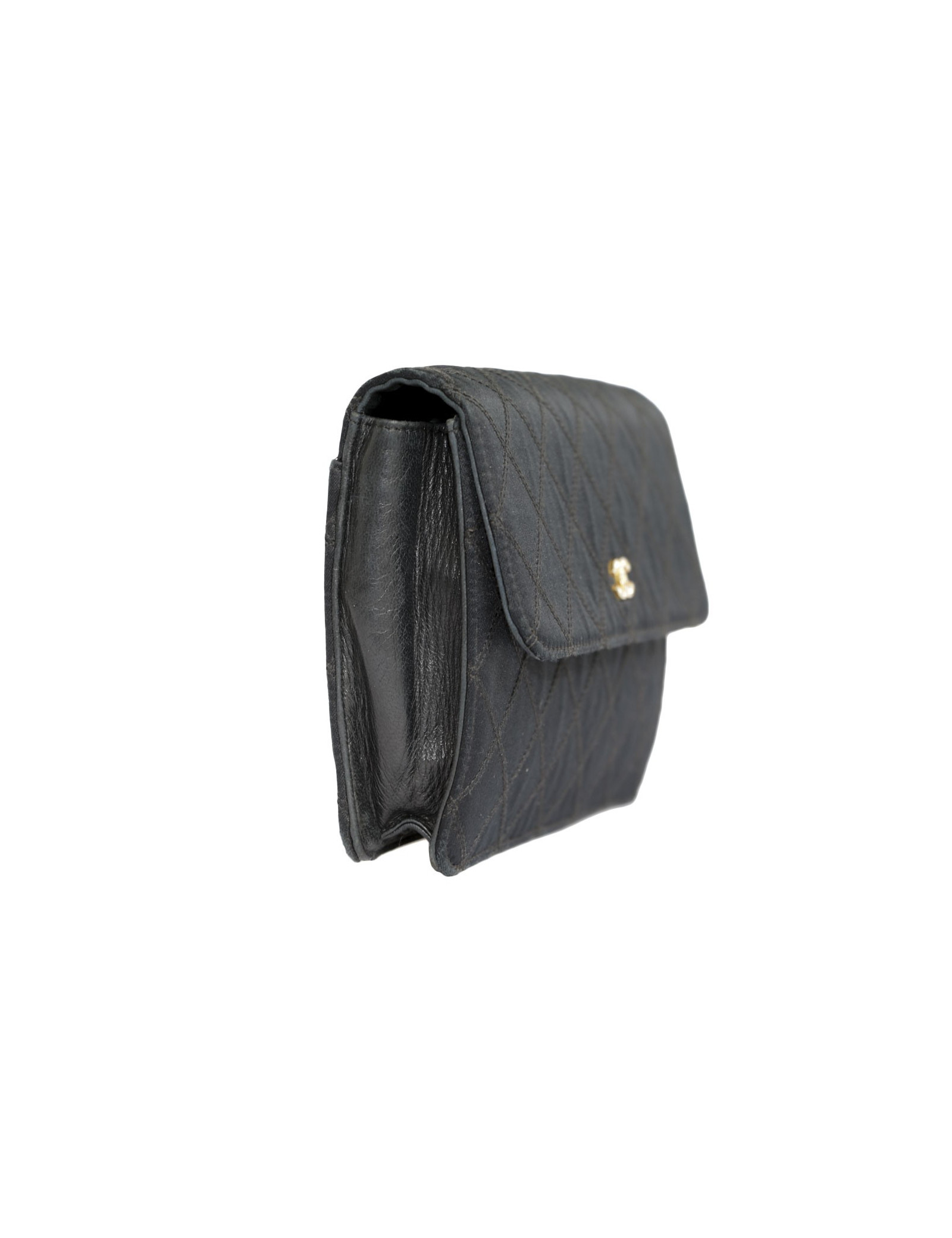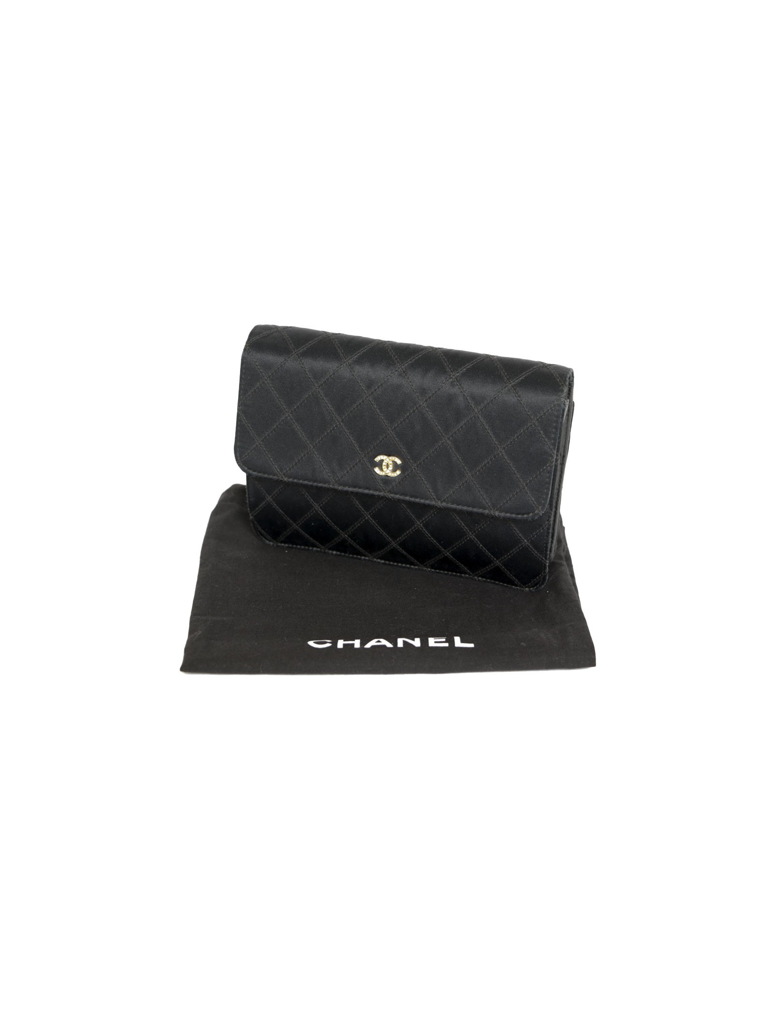 Sac/ pochette du soir en soie noire de la Maison Chanel, matelassé. Bijouterie dorée. L'intérieur est en soie sauvage et cuir noir avec une poche plaquée et zippée. Hologramme: 0738... pas de carte d'authenticité. Porté main. Double C avec des strass.