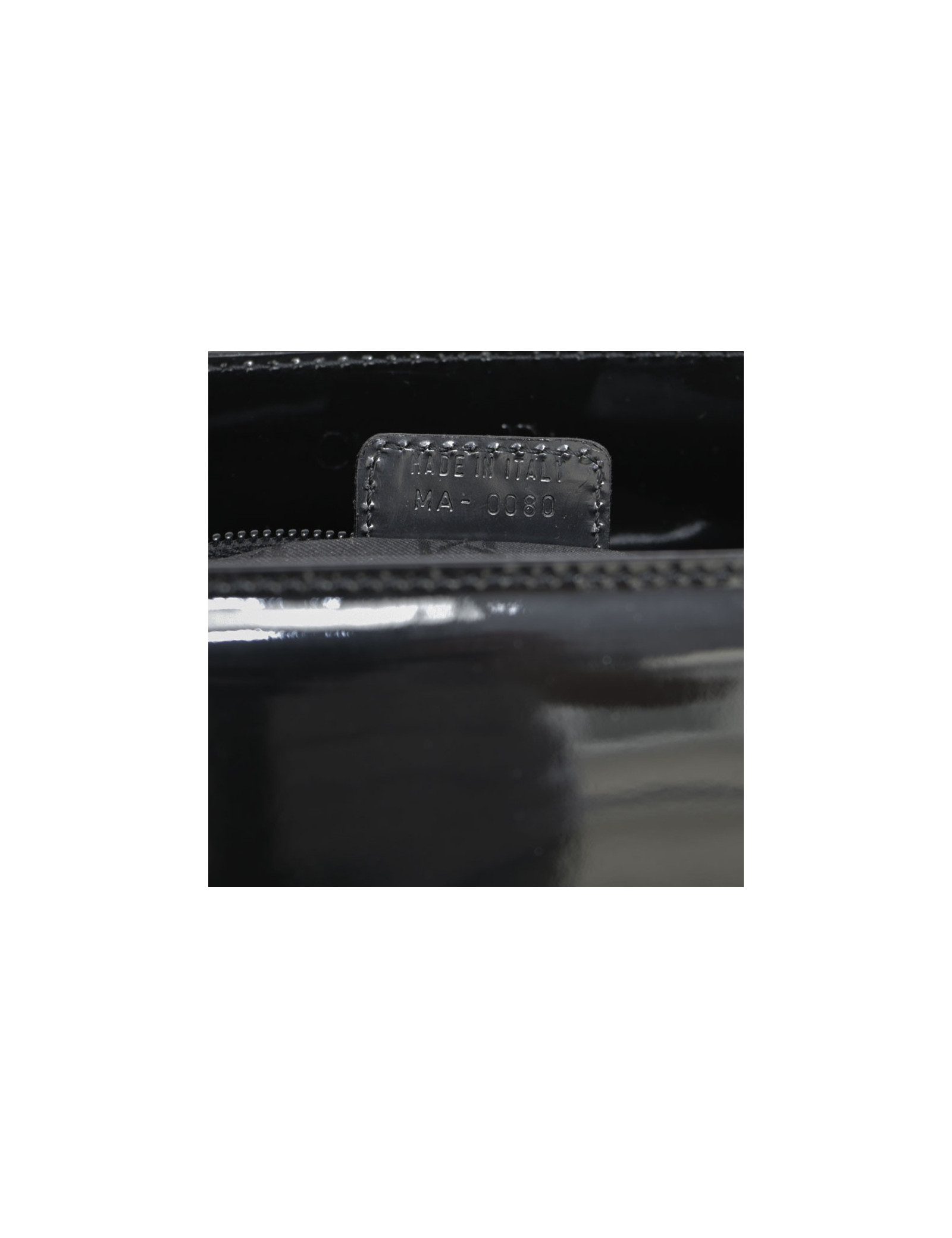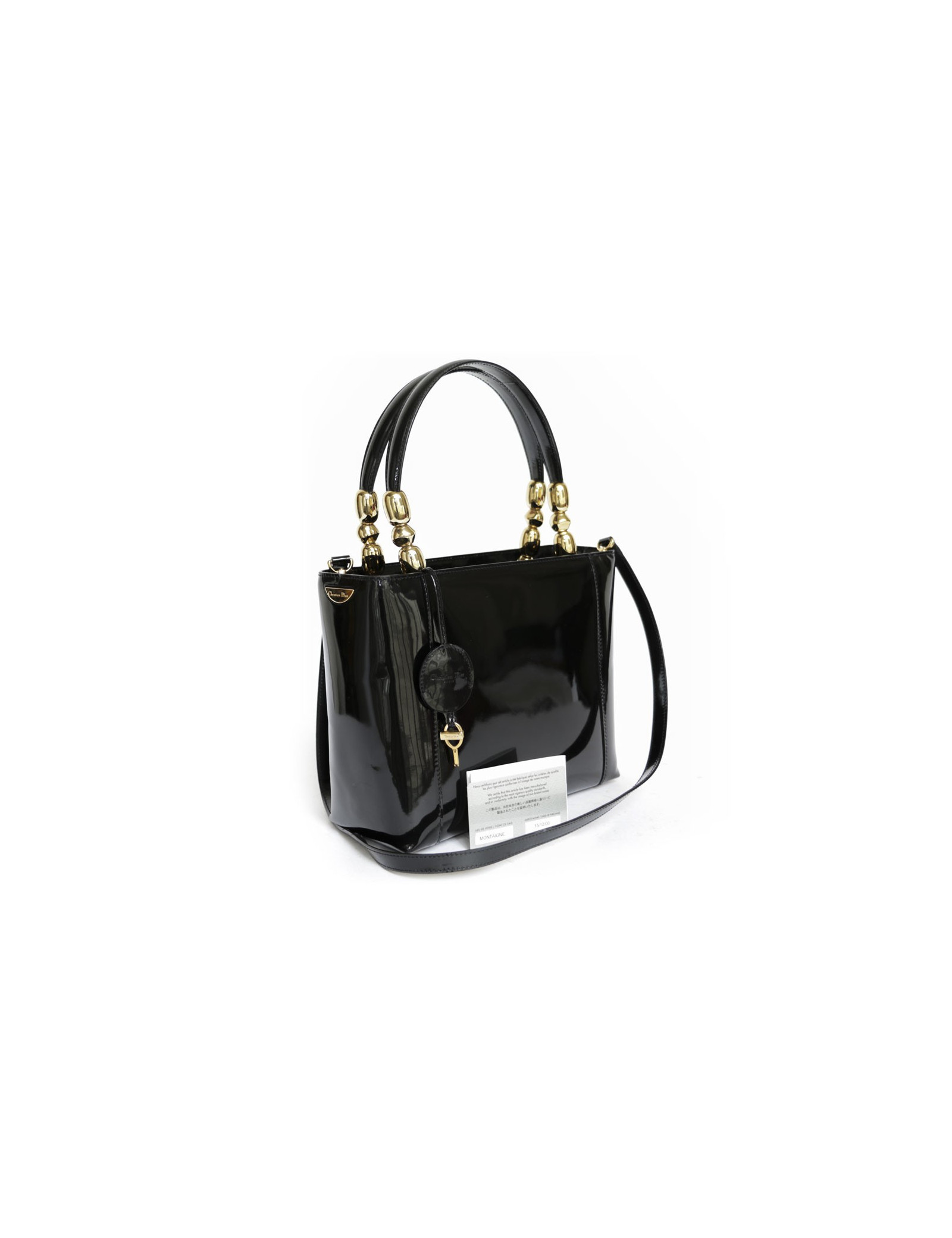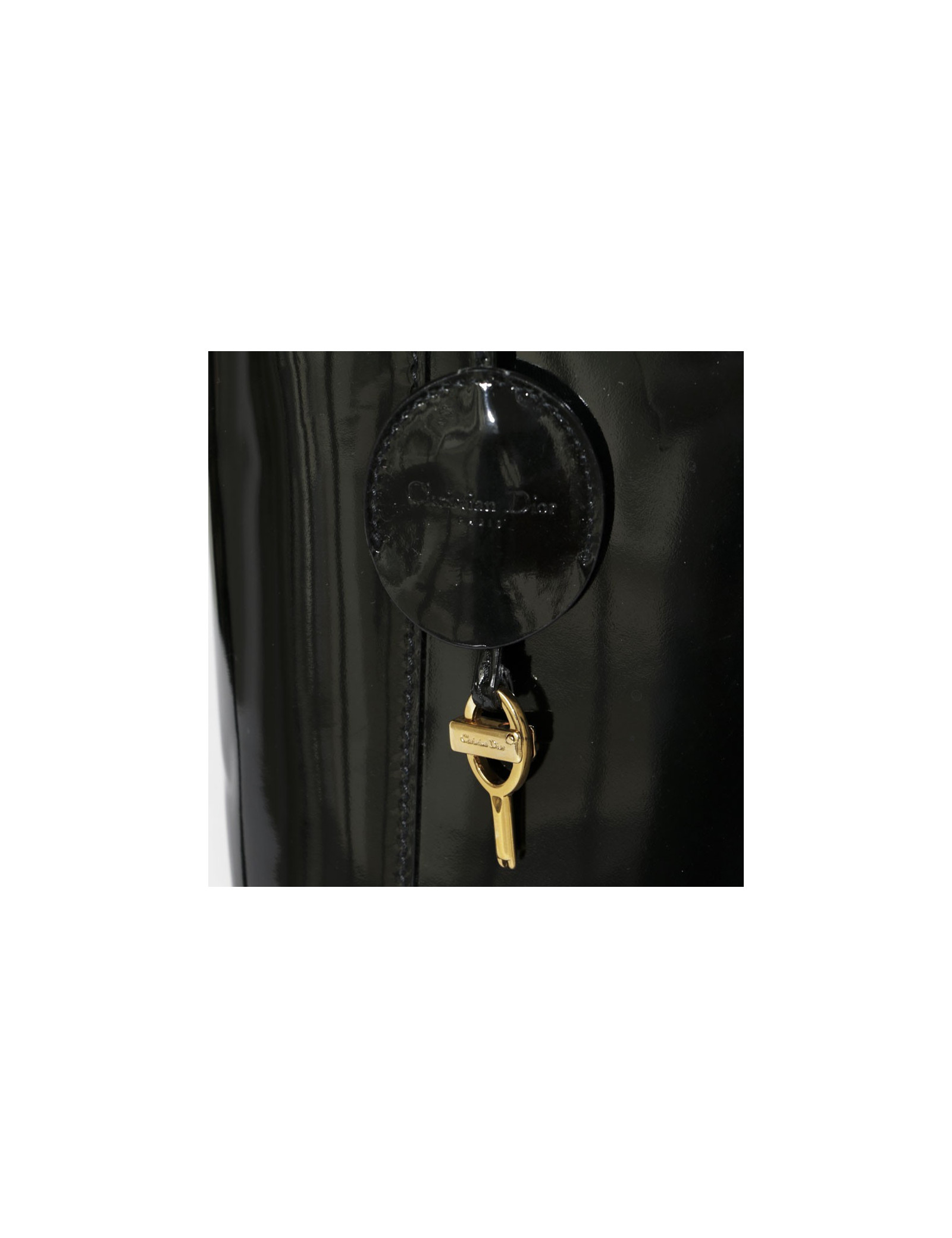 Sac 'Lady Dior' en cuir verni noir de la Maison Christian Dior. Bijouterie doré. Fermeture zippée. Porté main avec deux anses et à l'épaule à l'aide d'une bandoulière amovible. L'intérieur est en tissu monogram noir avec 2 poches plaquées dont 1 zippée.