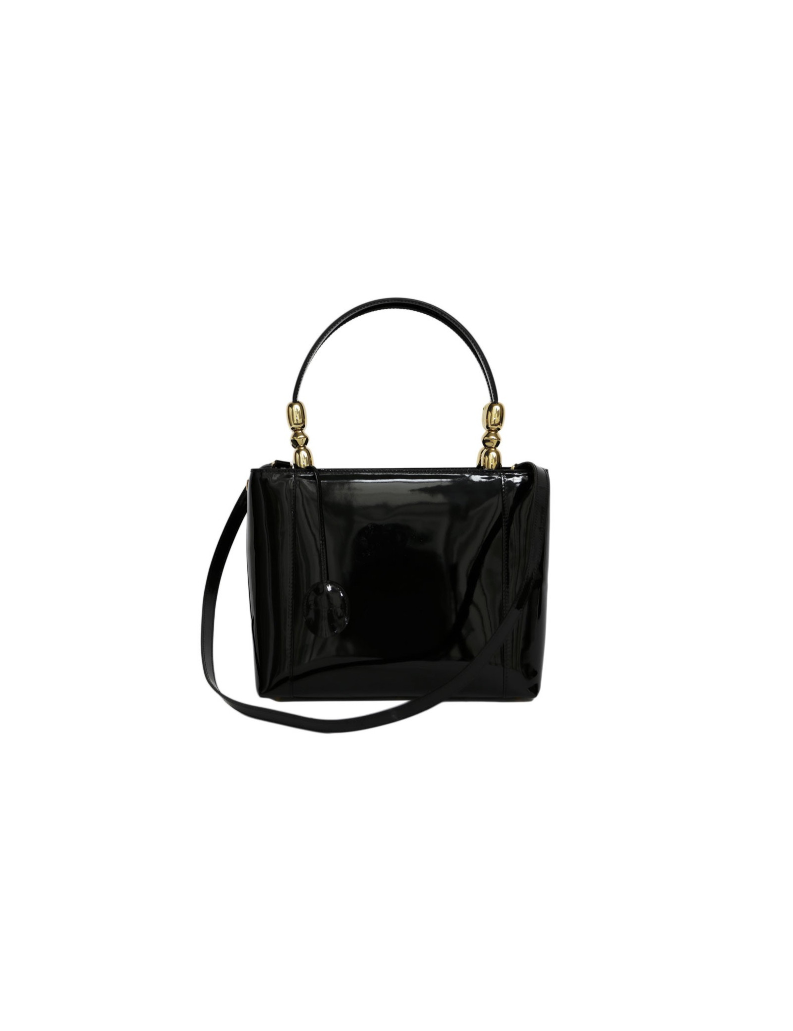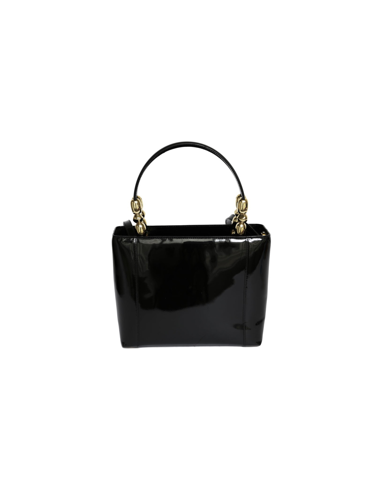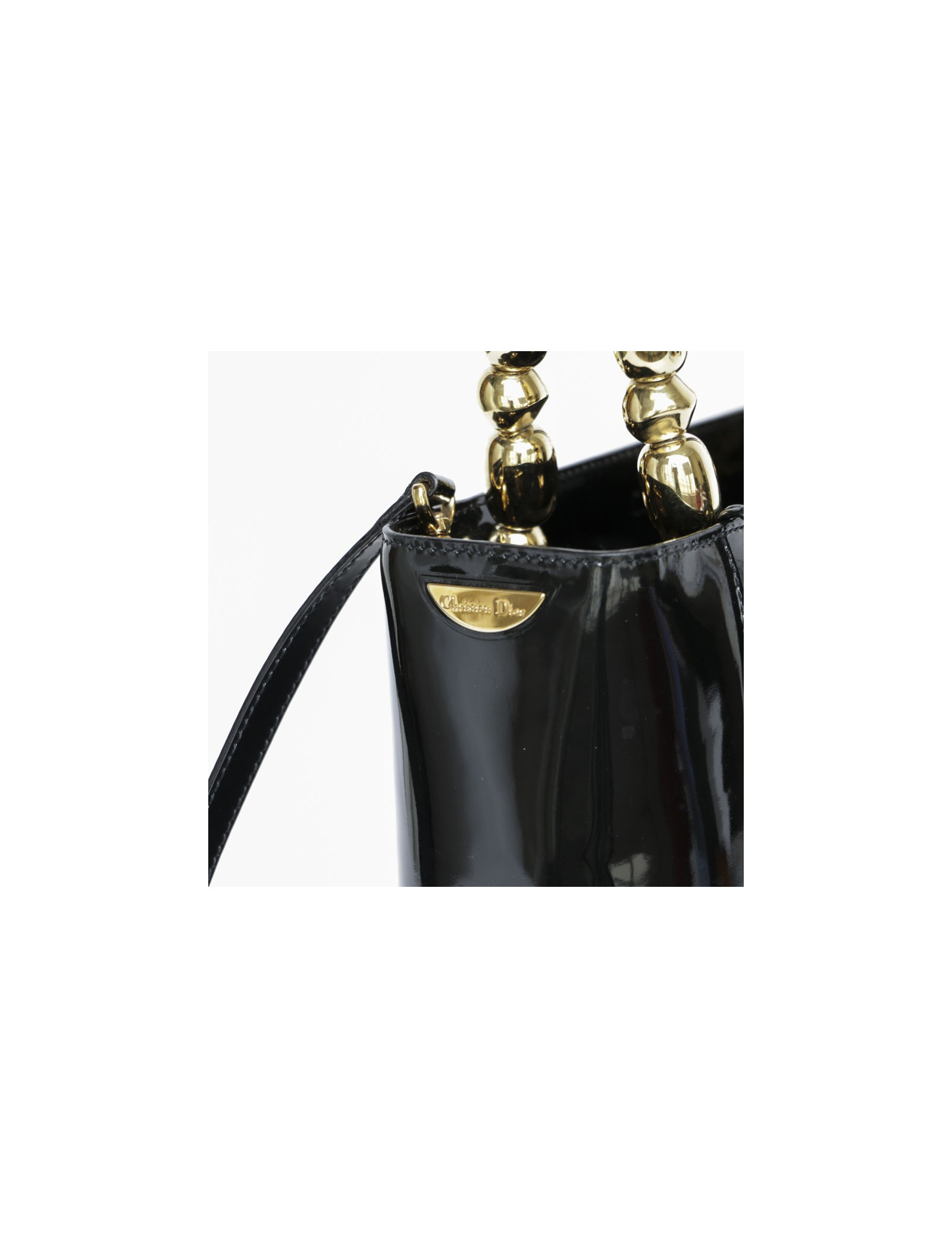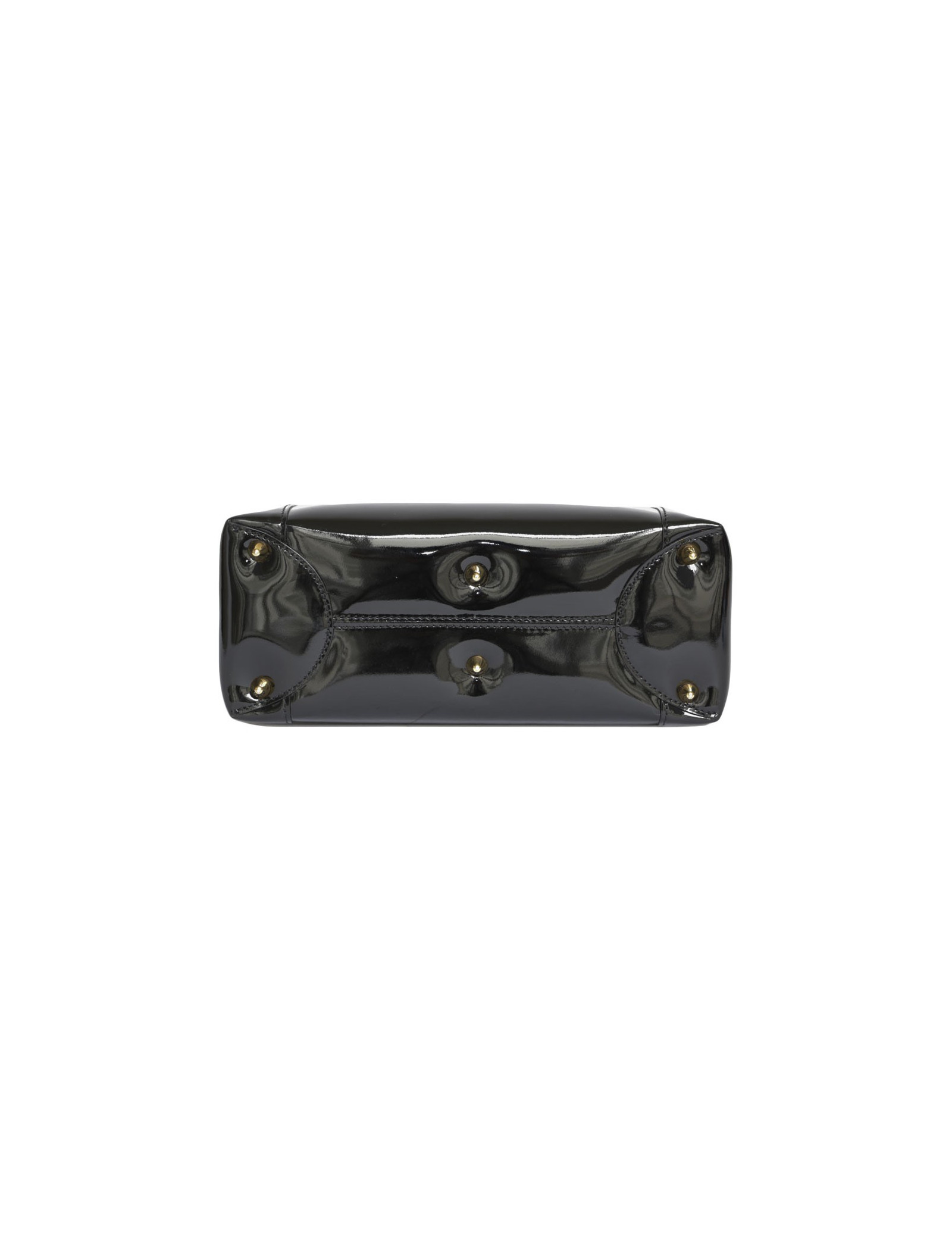 Sac 'Lady Dior' en cuir verni noir de la Maison Christian Dior. Bijouterie doré. Fermeture zippée. Porté main avec deux anses et à l'épaule à l'aide d'une bandoulière amovible. L'intérieur est en tissu monogram noir avec 2 poches plaquées dont 1 zippée.