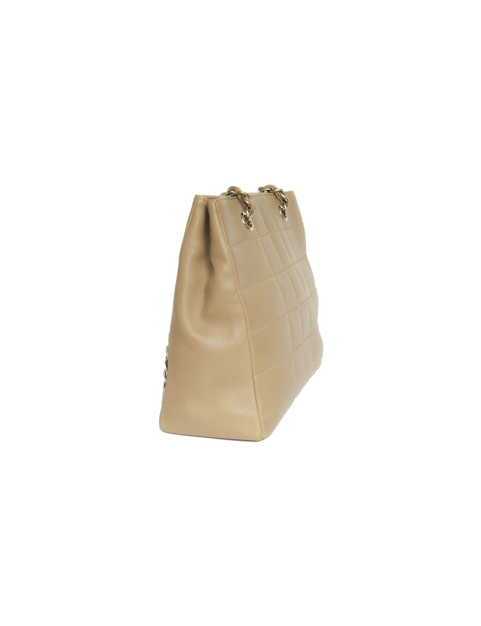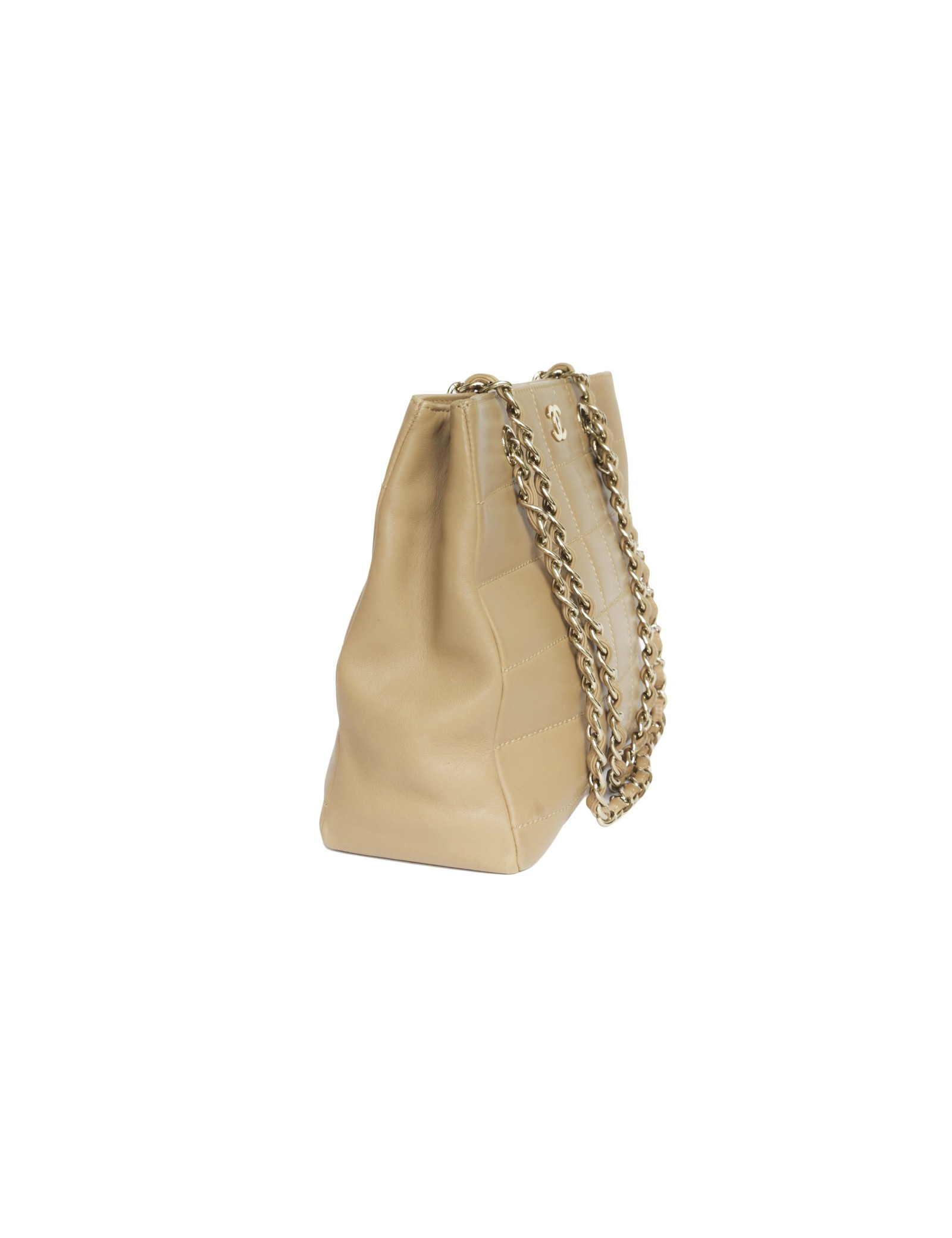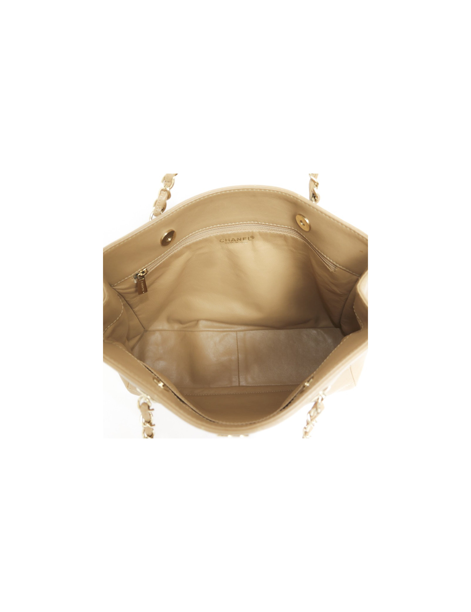 Sac en cuir d'agneau lisse de couleur gold de la Maison Chanel. Bijouterie dorée. Fermeture par bouton pression. A l'intérieur, deux grandes poches plaquées dont 1 zippée. Hologramme : 7253.... pas de carte d'authenticité.