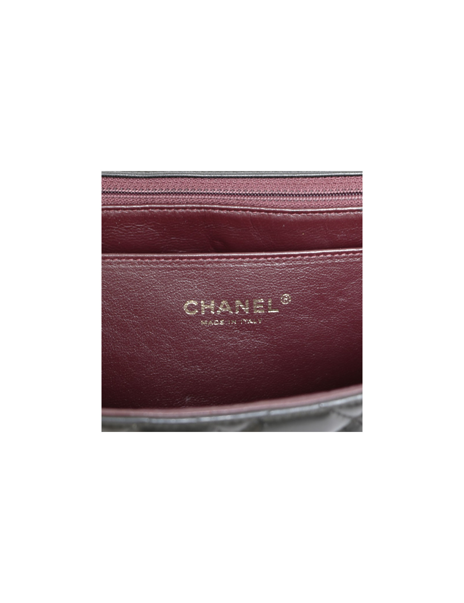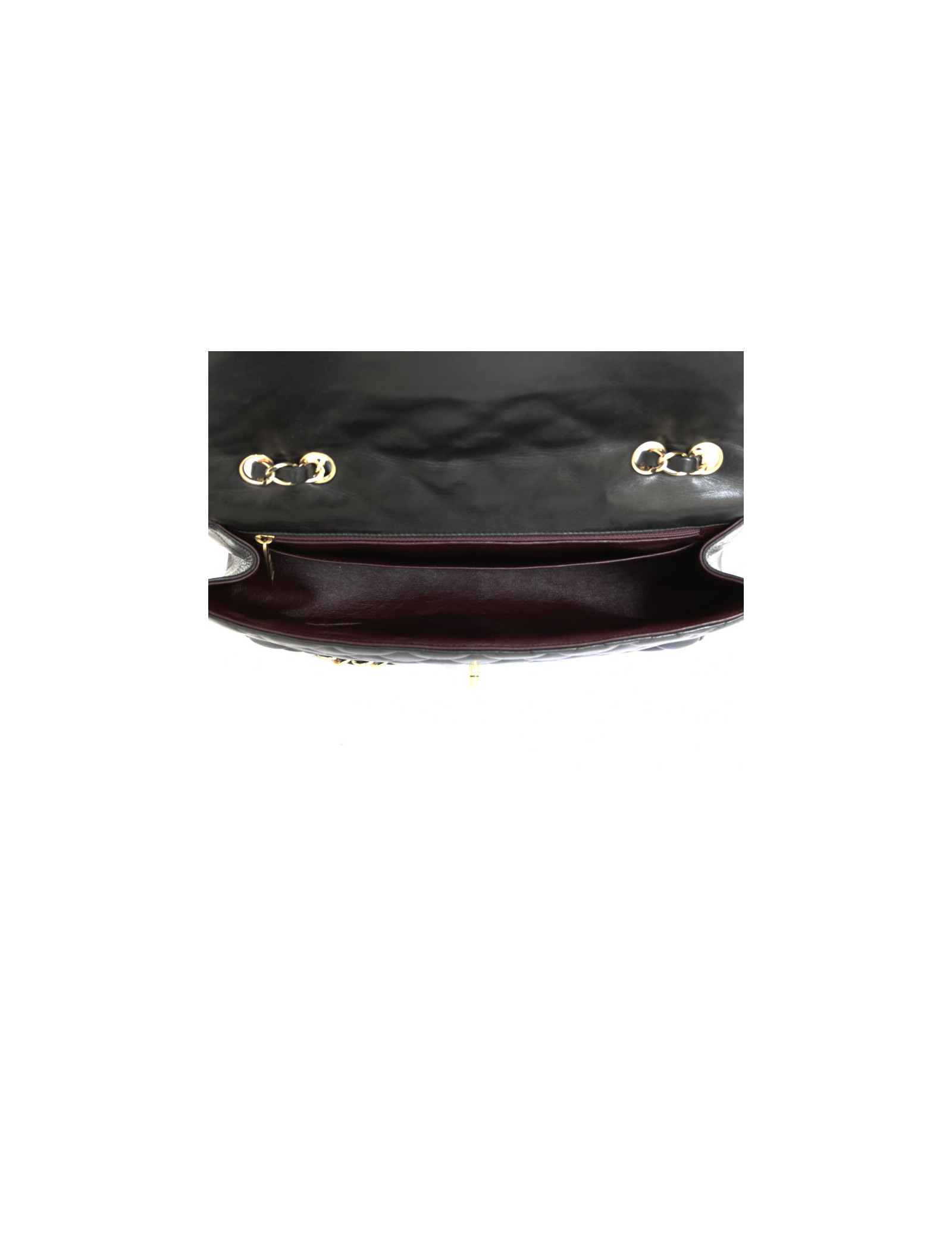 Sac 'Jumbo' en cuir d'agneau lisse noir matelassé. Bijouterie dorée. Fermoir 'CC'. L'intérieur est en cuir d'agneau lisse bordeaux avec 2 grandes poches plaquées dont 1 zippée. Hologramme: 1232... pas de carte d'authenticité.