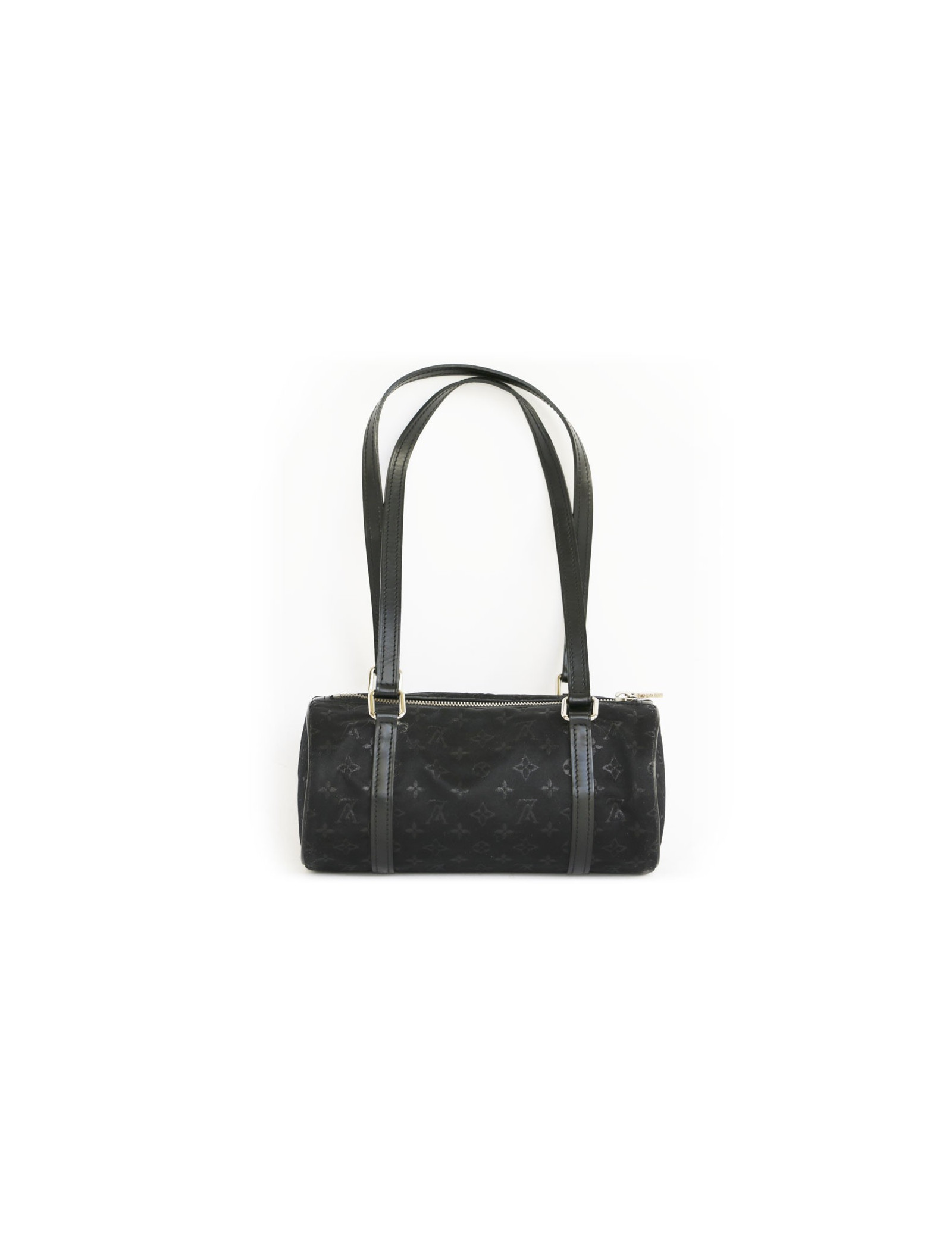 Mini sac en satin noir monogram de la Maison Louis Vuitton. Fermeture zippée.