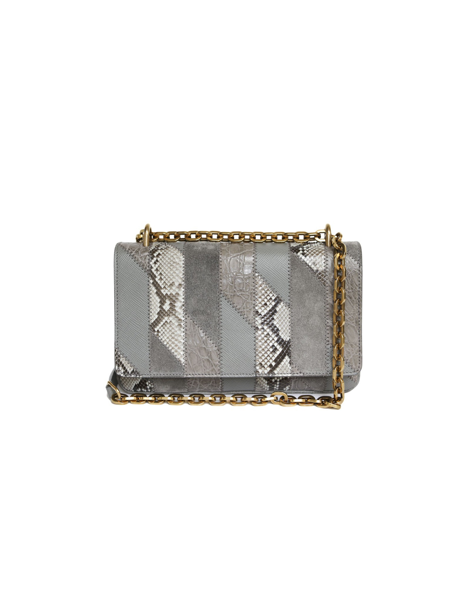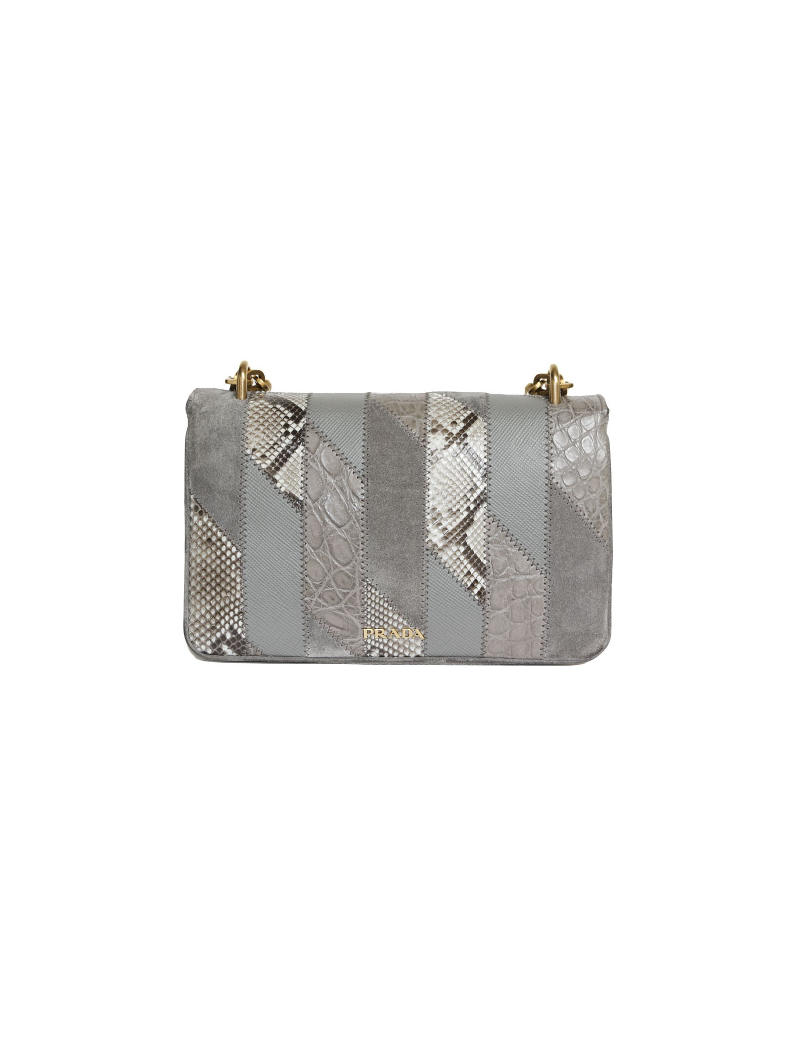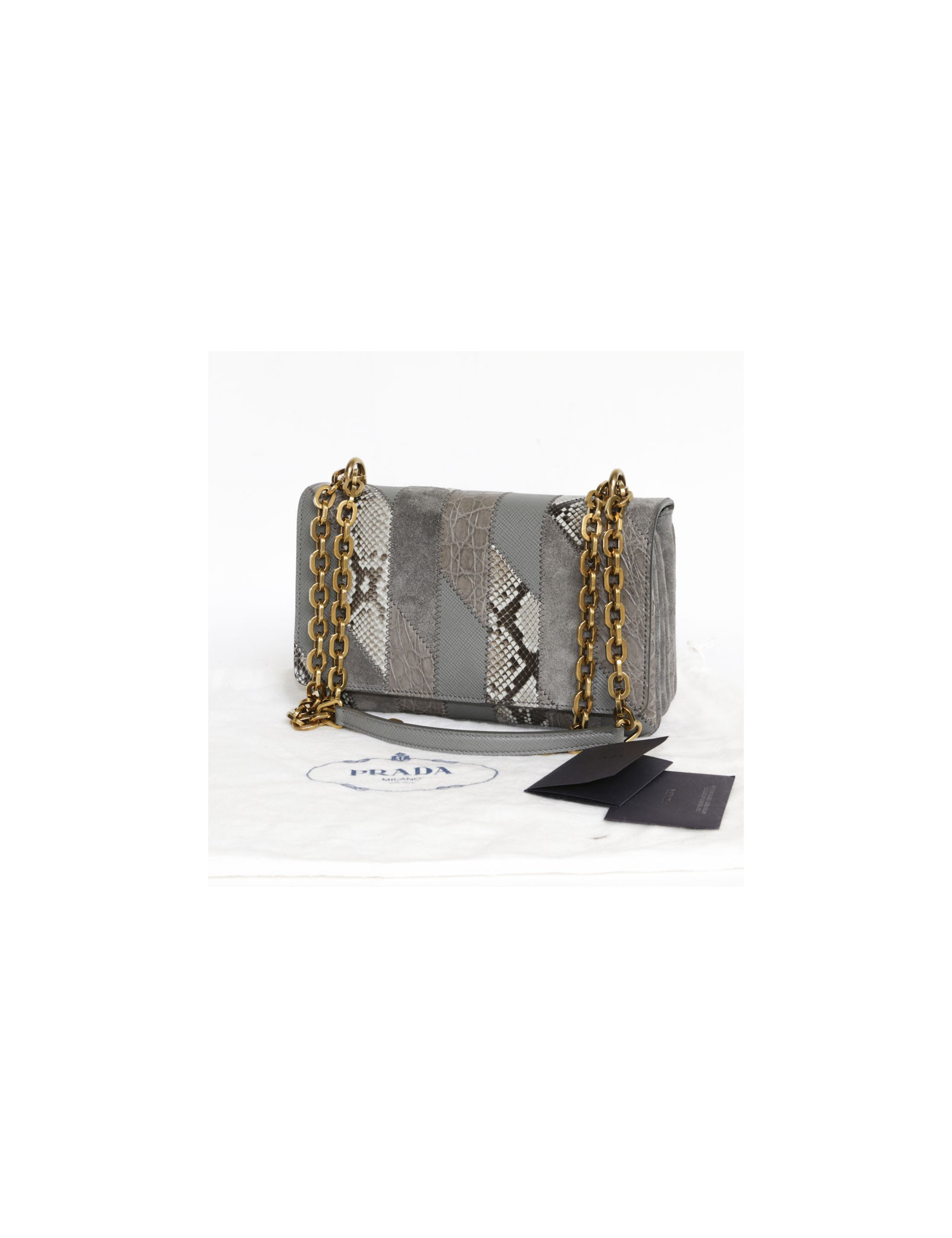Superbe sac Prada gris et chaîne dorée, en patchwork de cuirs exotiques (crocodile/python) daim et cuir Safiano. carte d'authenticité.