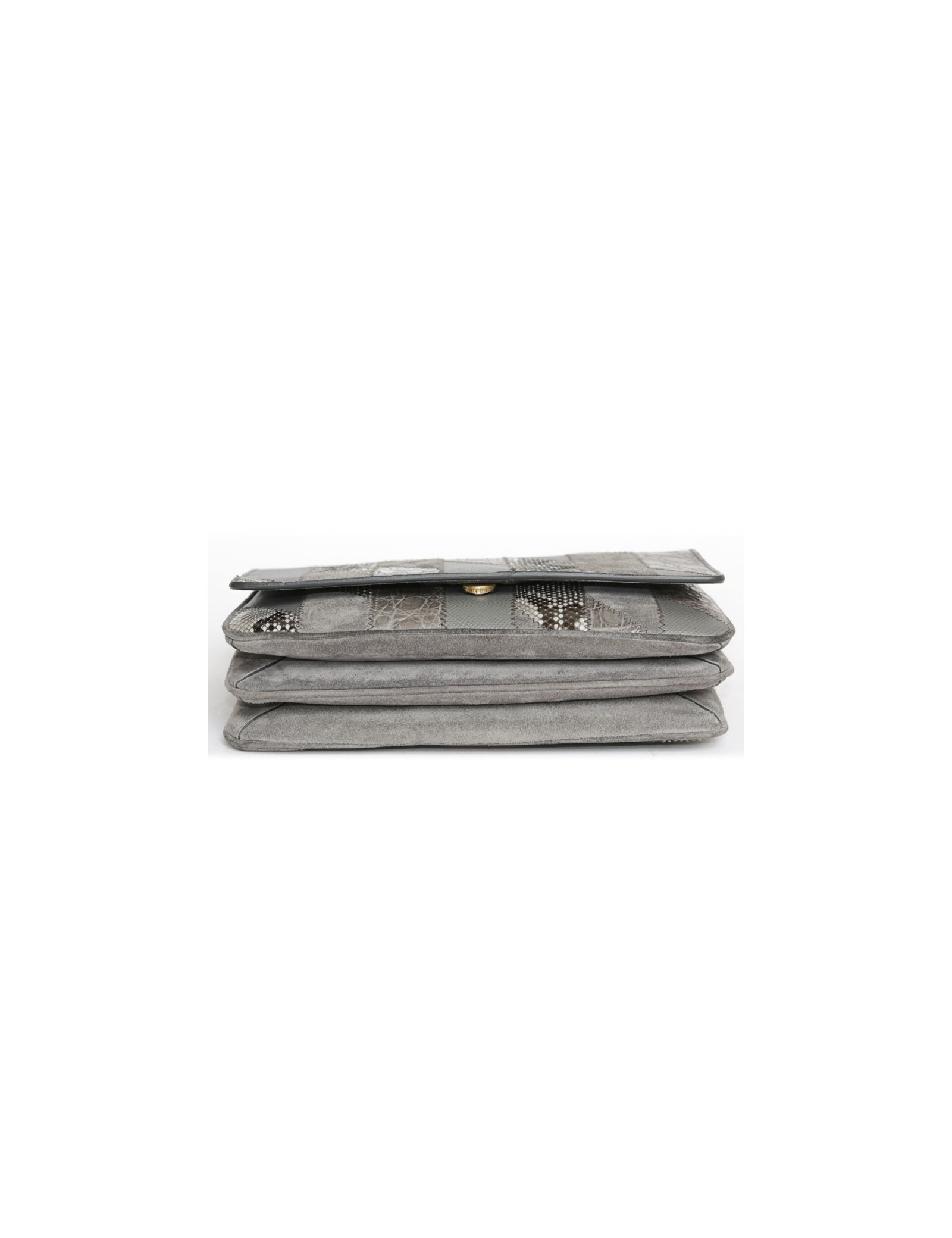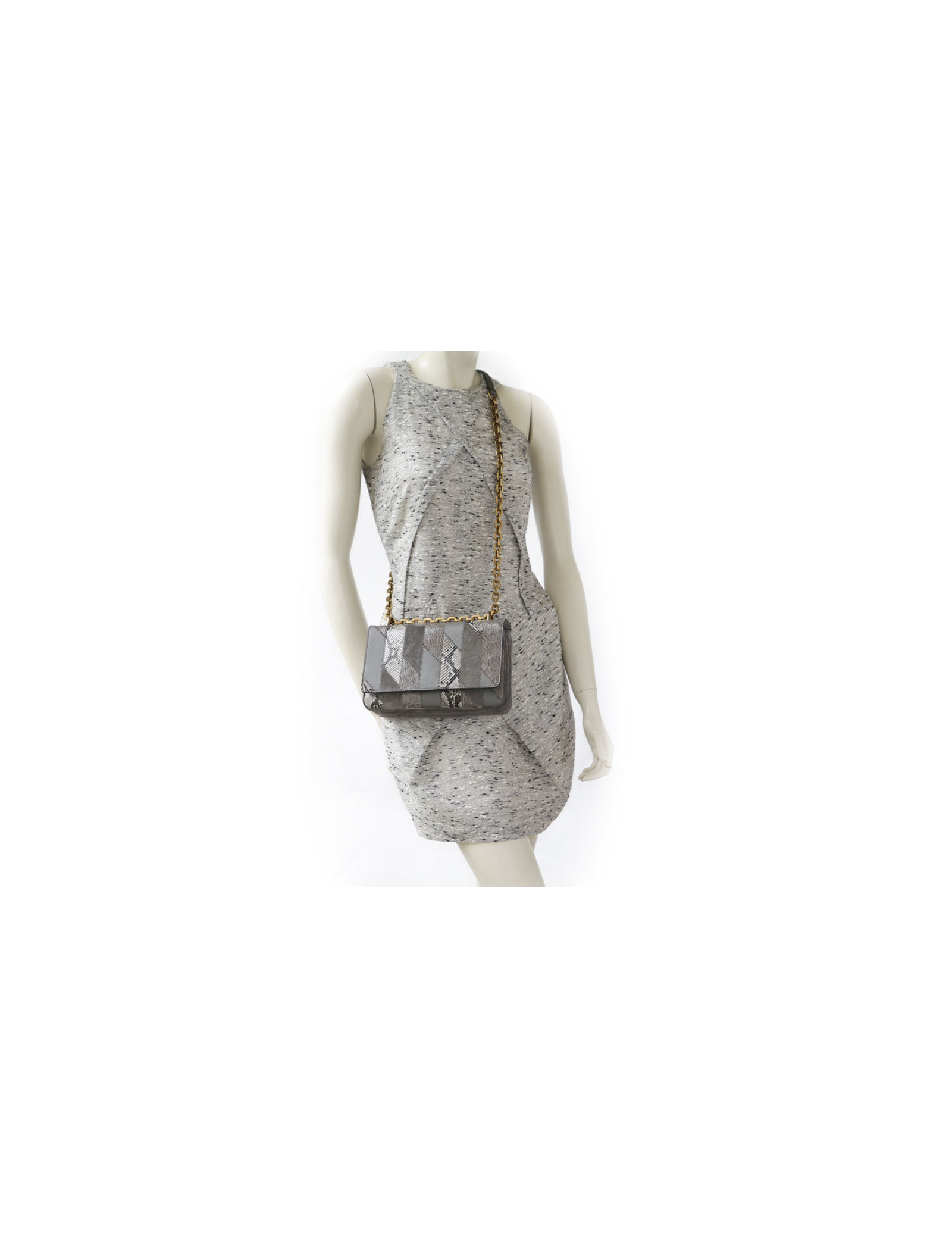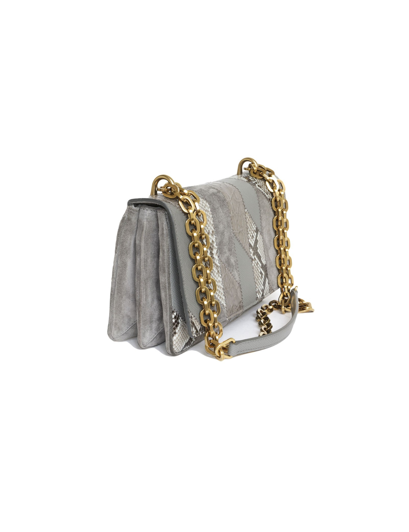 Superbe sac Prada gris et chaîne dorée, en patchwork de cuirs exotiques (crocodile/python) daim et cuir Safiano. carte d'authenticité.
