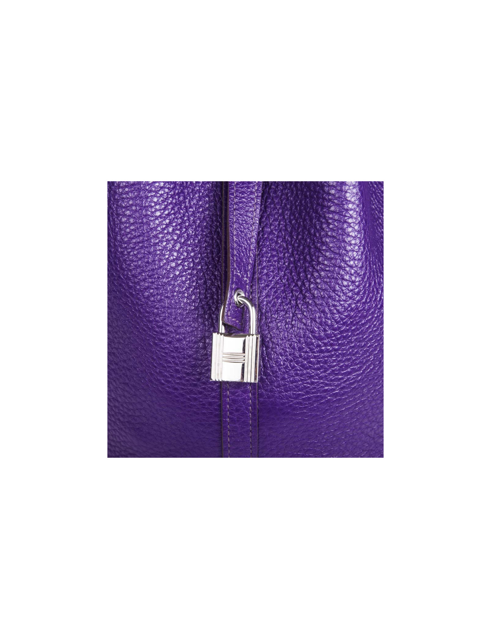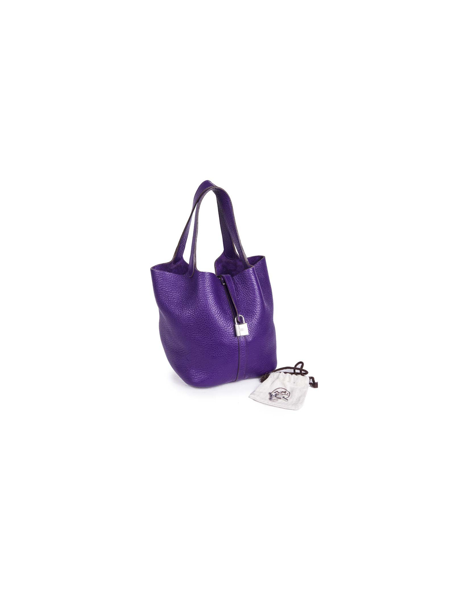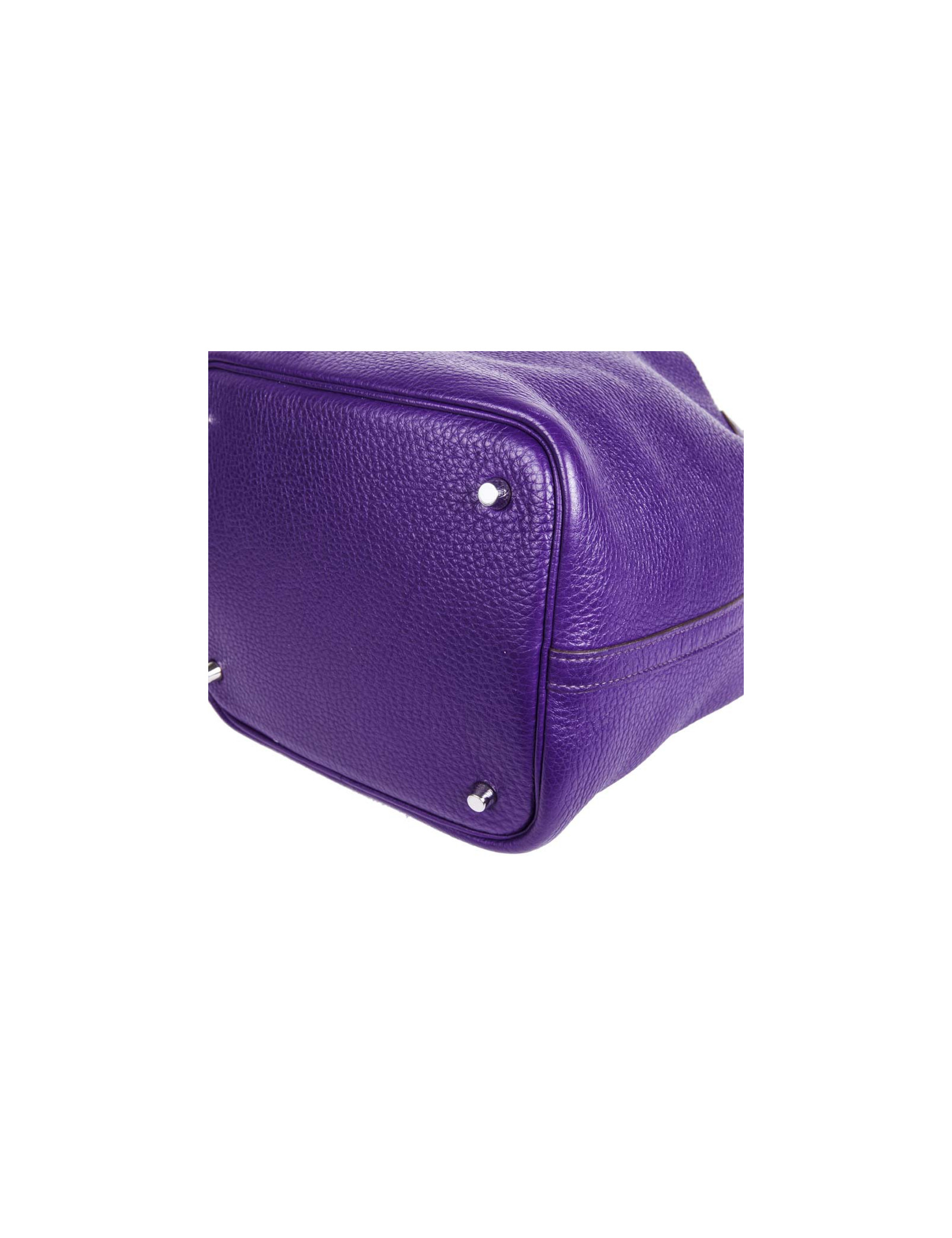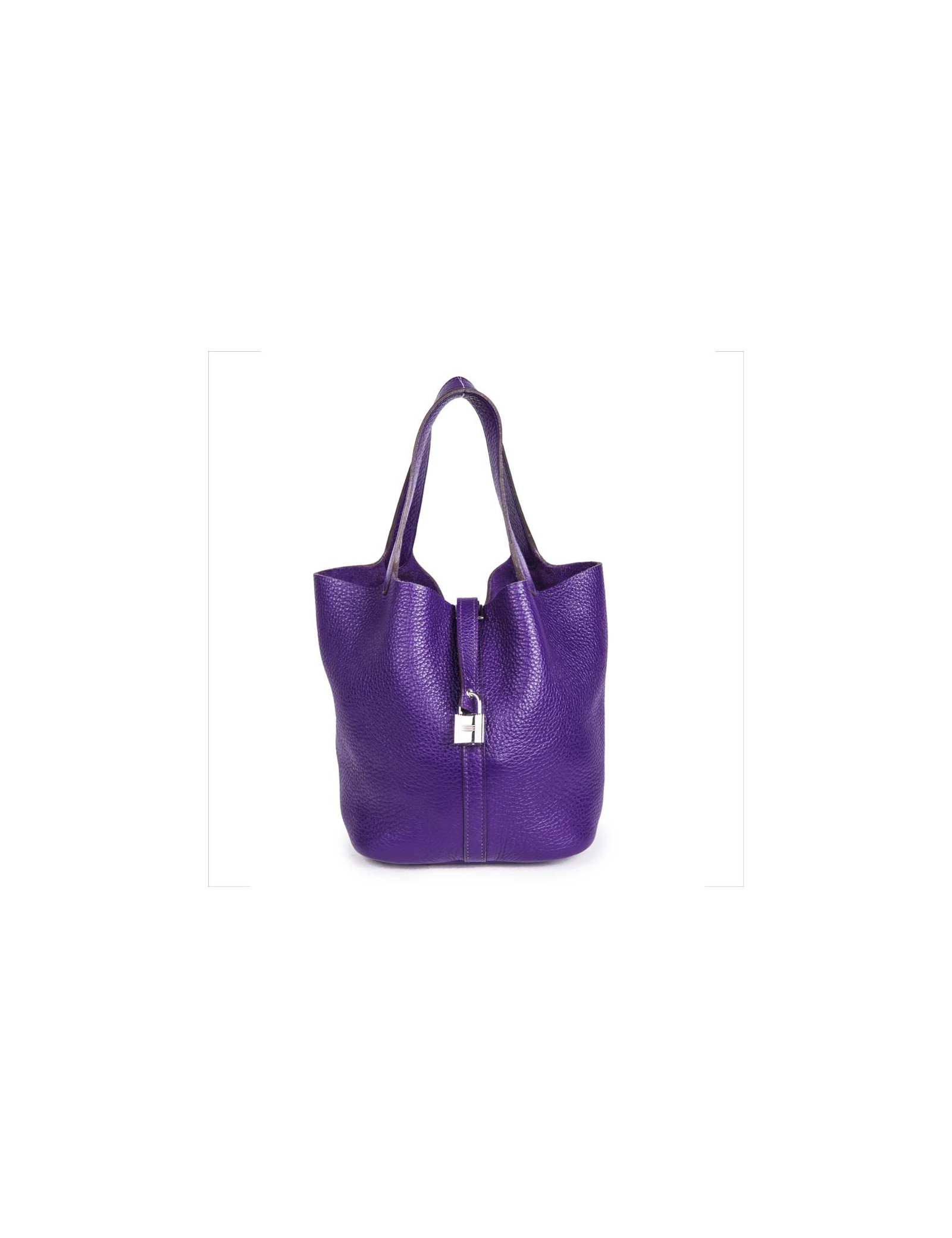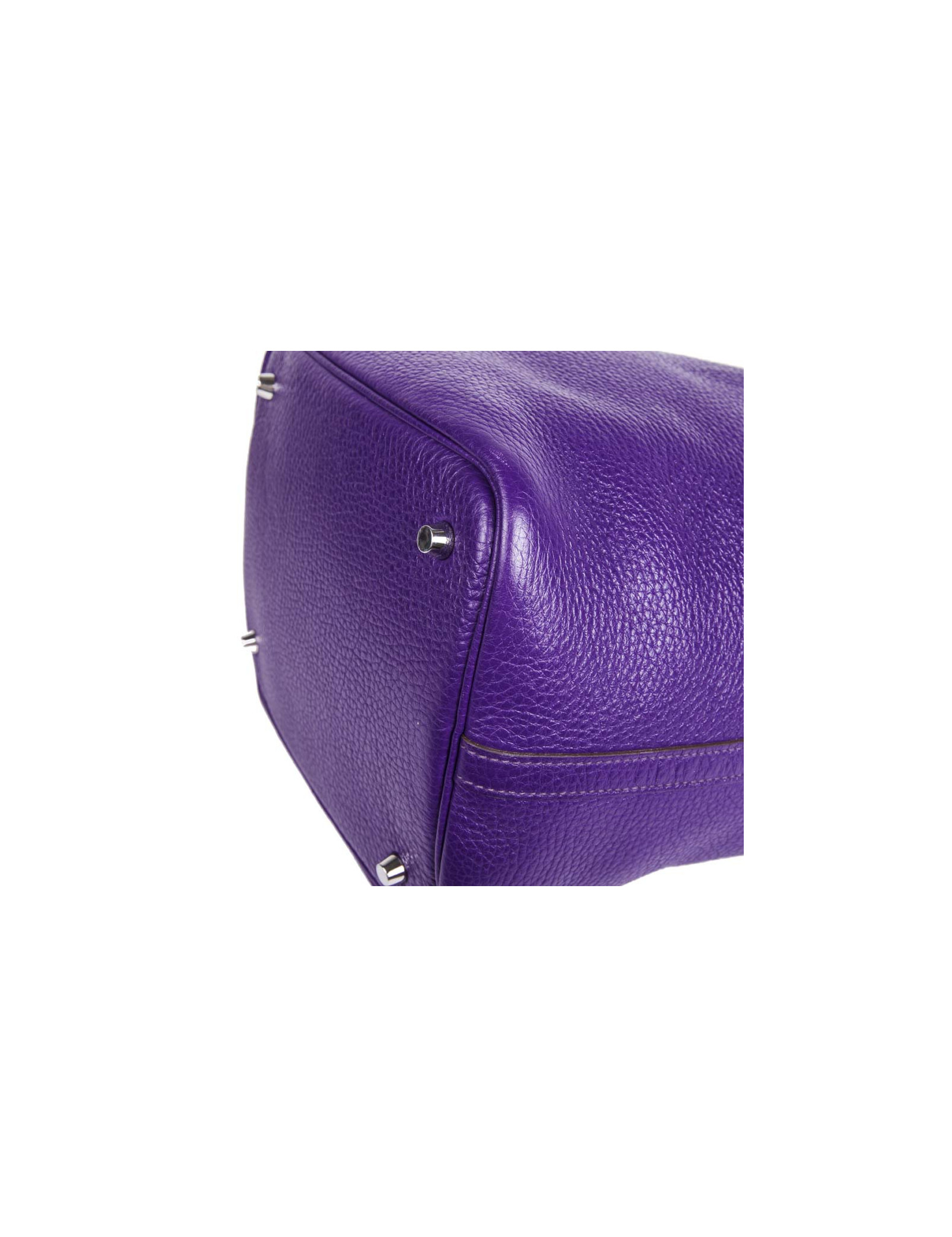 Sac 'picotin' en cuir grainé violet de la Maison Hermès. Bijouterie en métal argenté. Lettre O dans un carré.