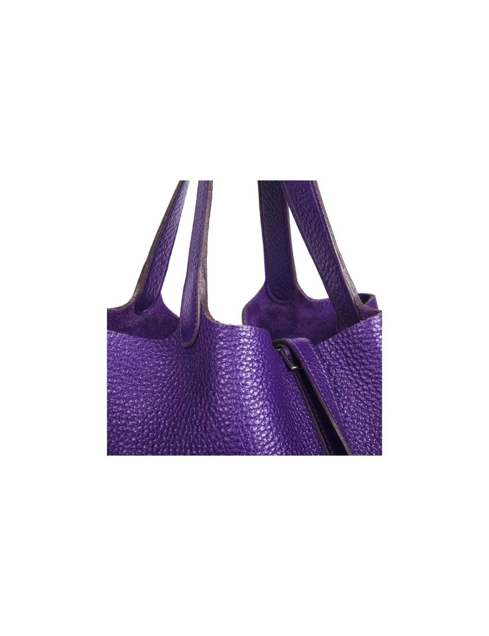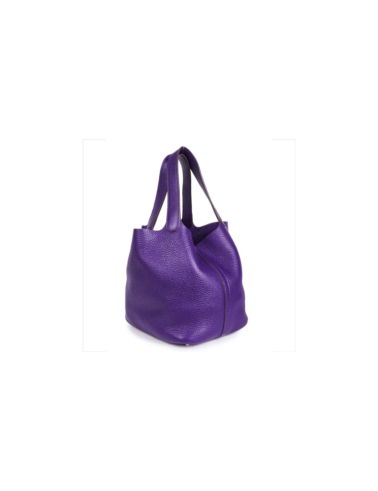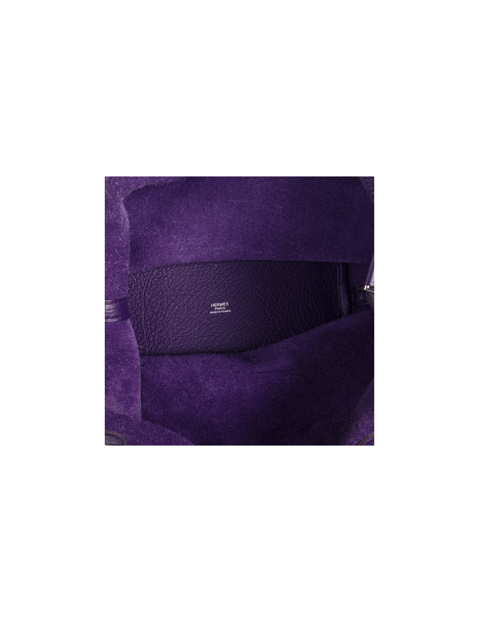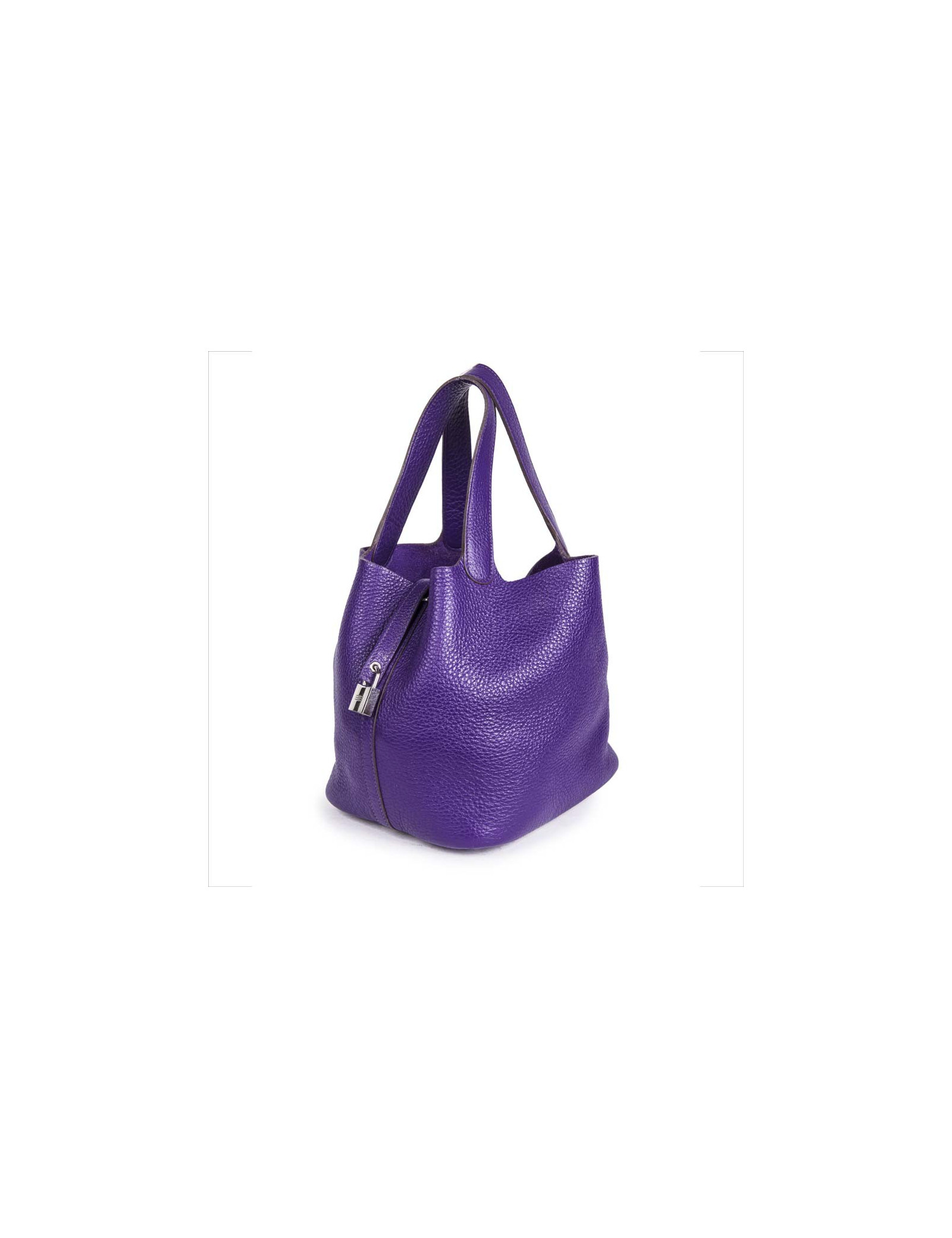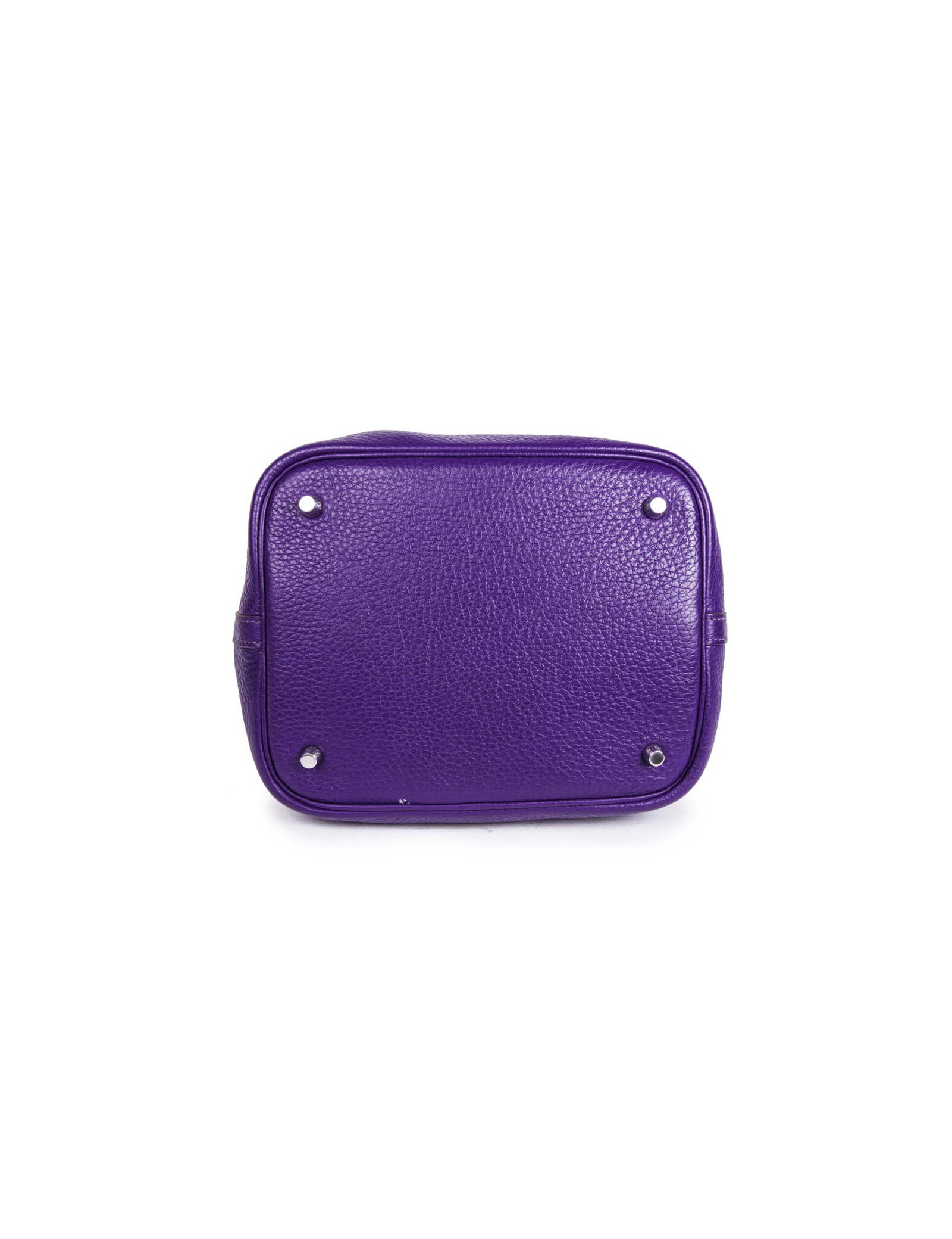 Sac 'picotin' en cuir grainé violet de la Maison Hermès. Bijouterie en métal argenté. Lettre O dans un carré.