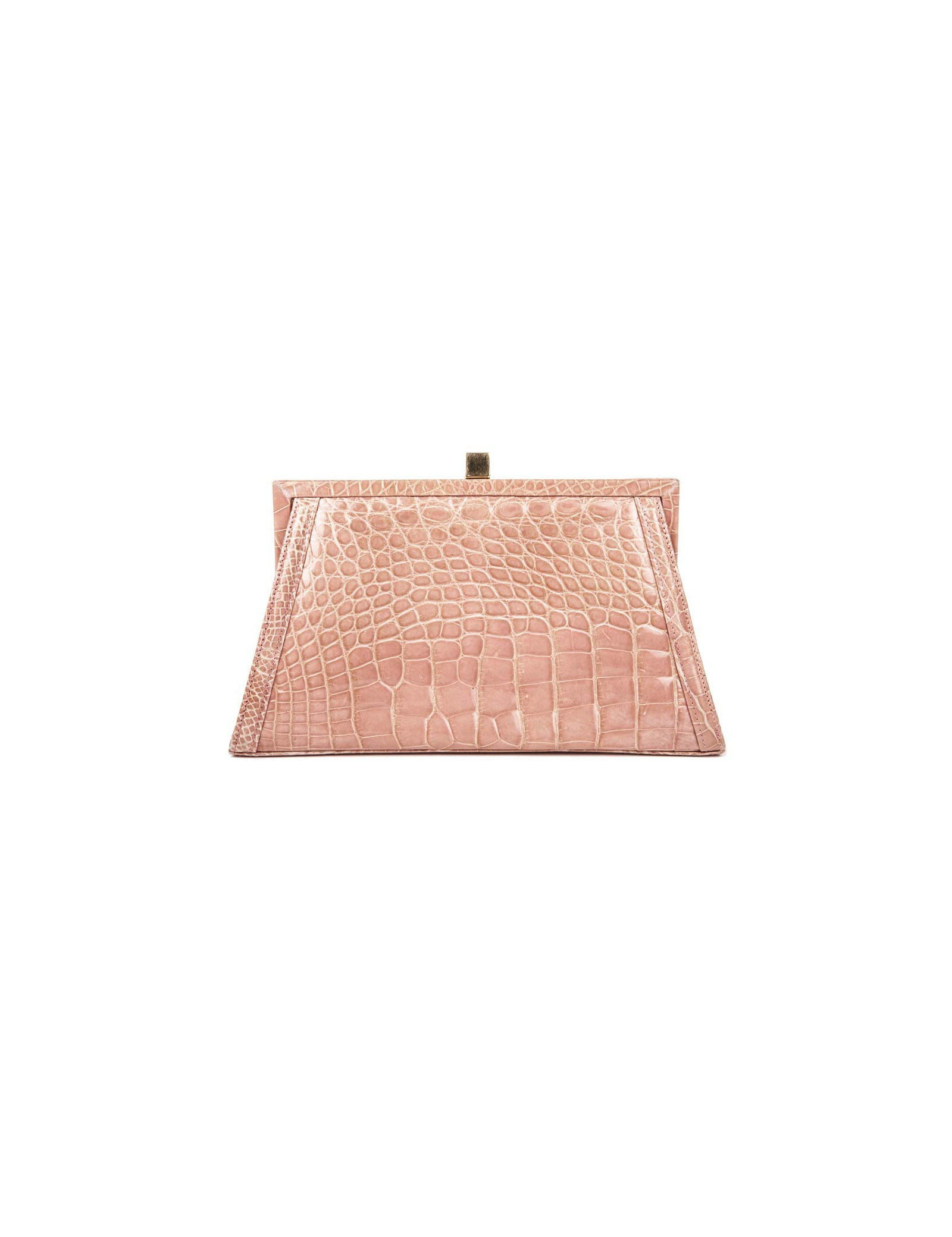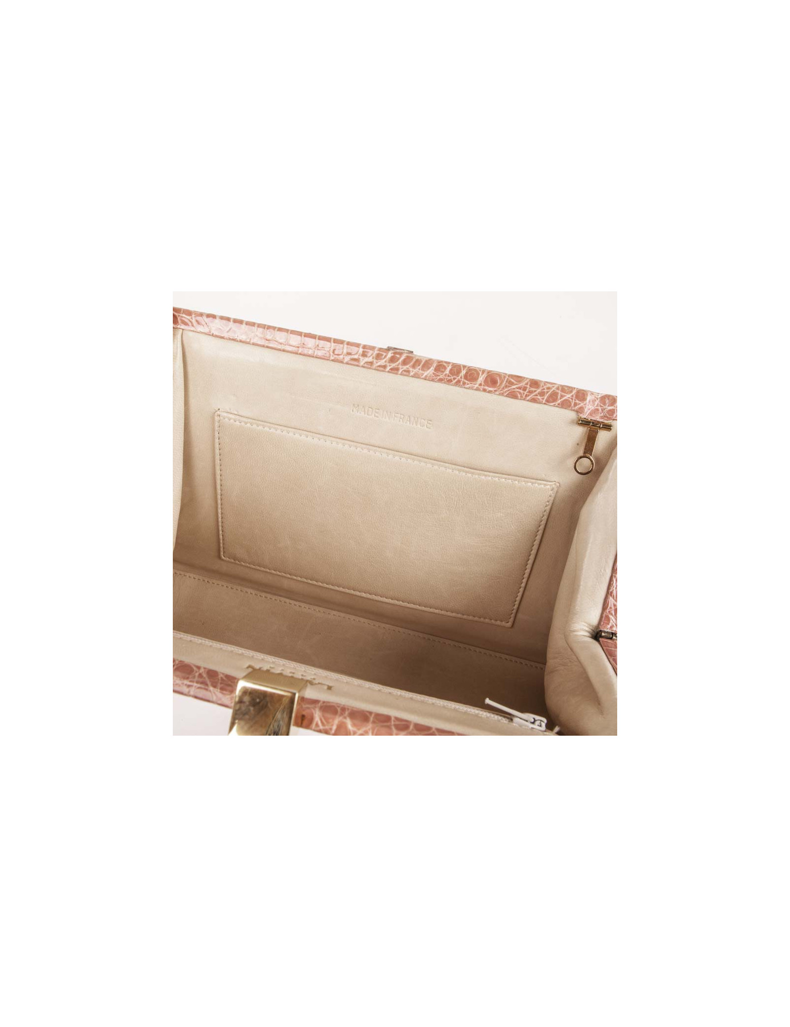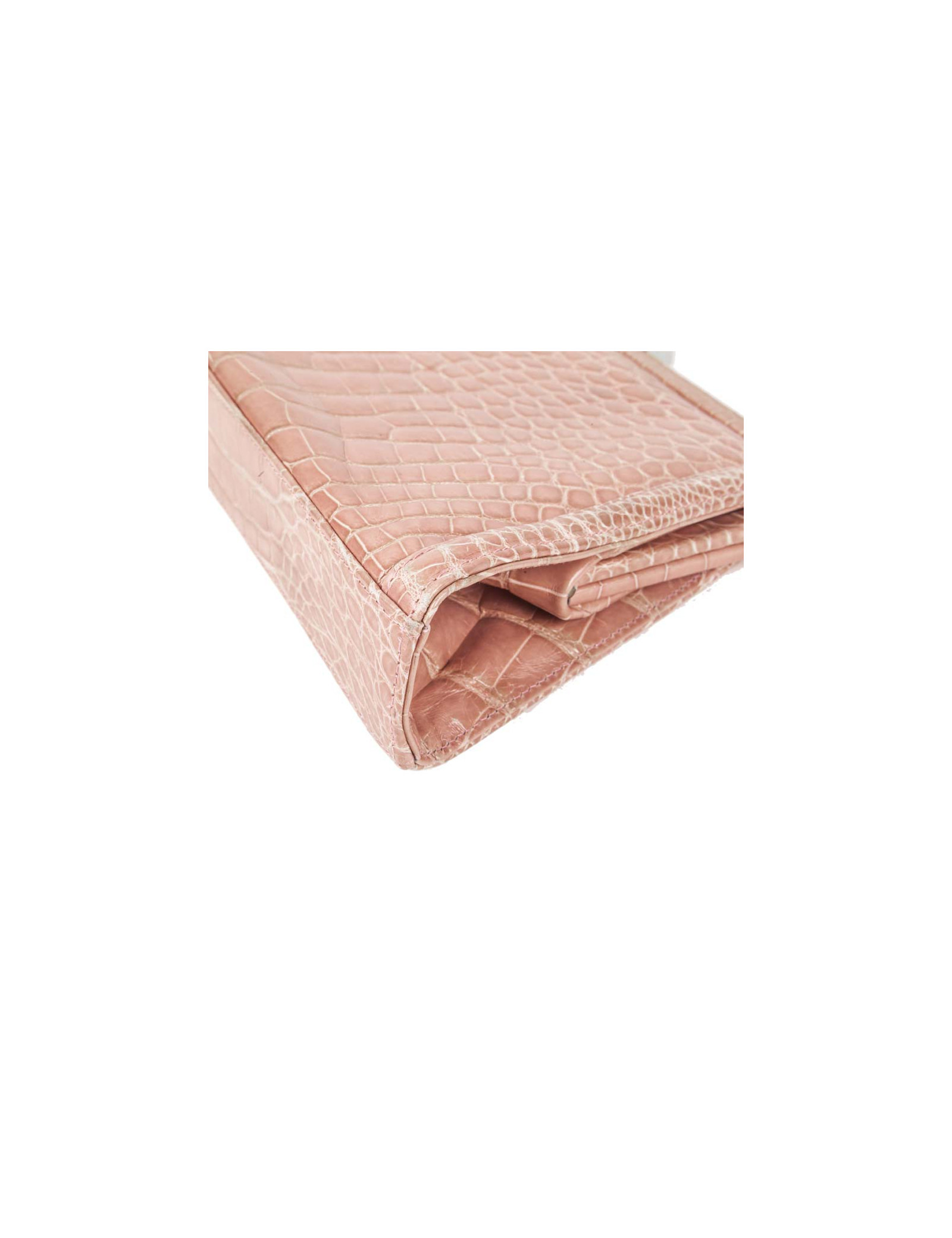 Pochette de la Maison Lanvin en cuir façon crocodile rose poudrée. Bijouterie dorée. L'intérieur est en cuir d'agneau beige avec 2 poches plaquées dont 1 zippée. En très bon état. Légère usure des coins sous le sac.