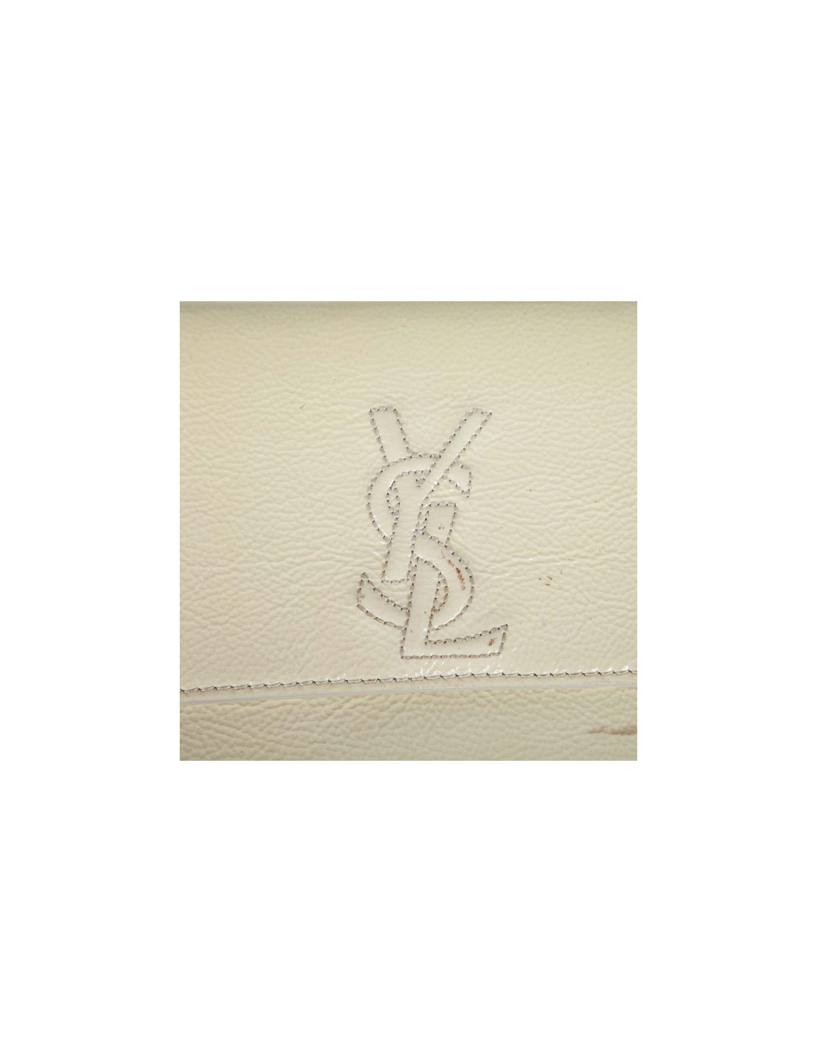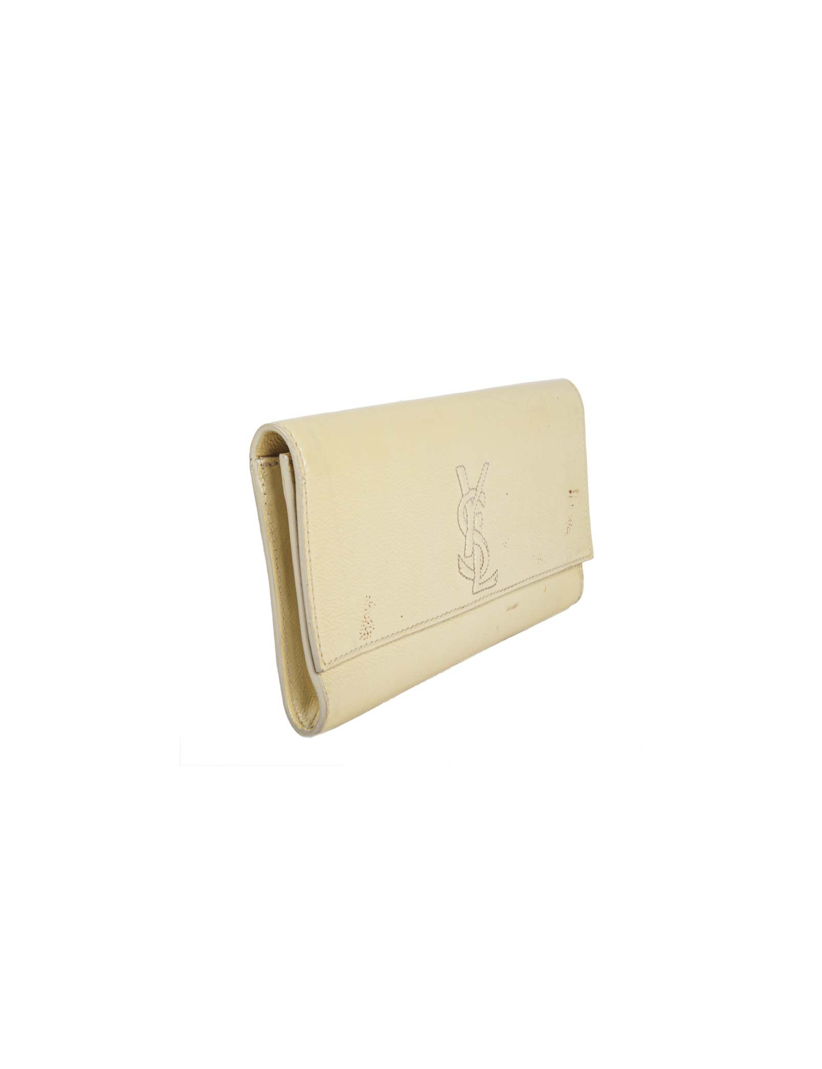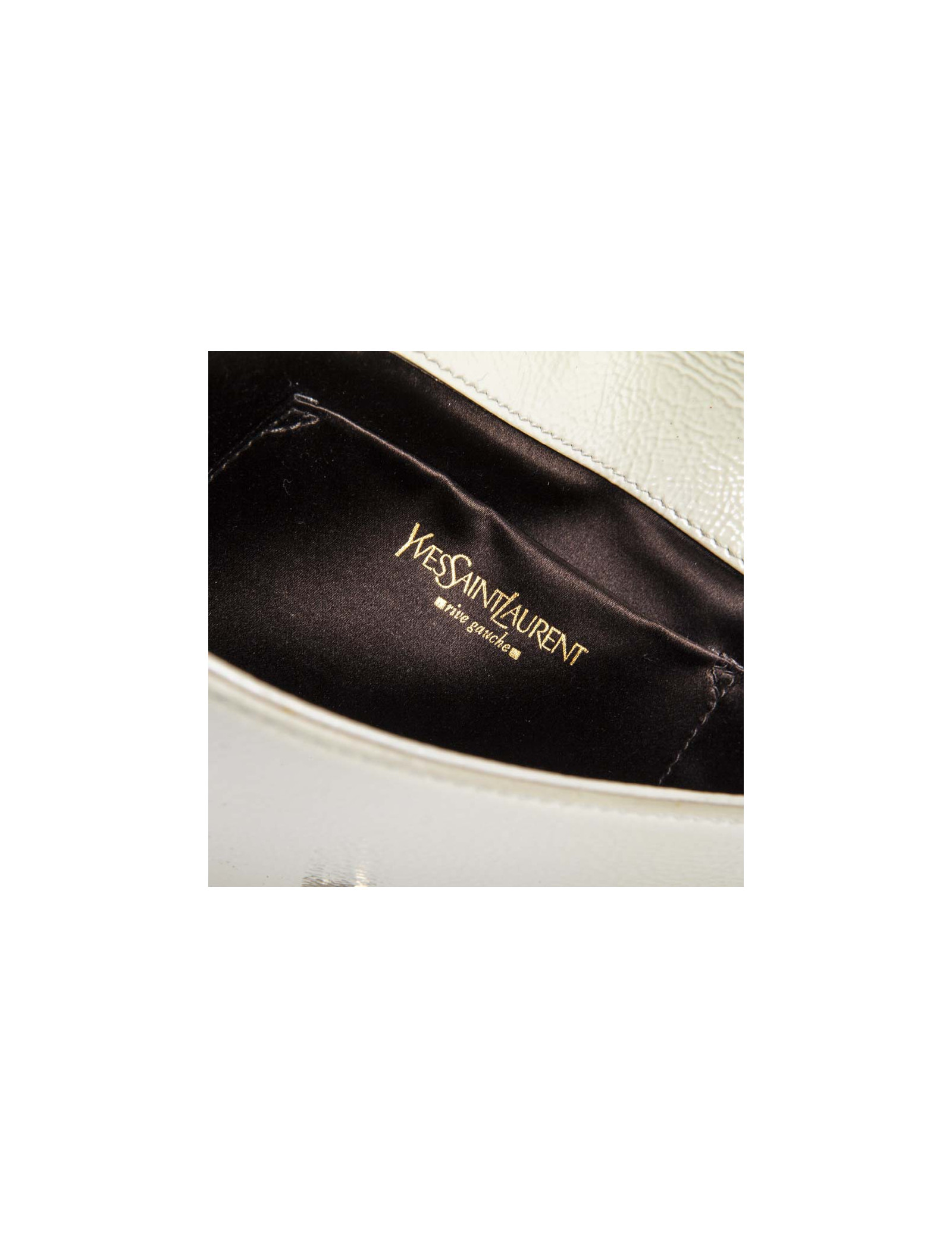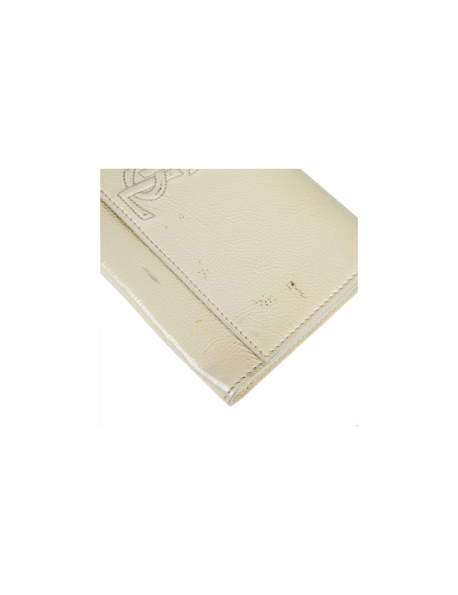 Pochette en cuir verni beige de la Maison Saint Laurent. Fermeture par bouton pression. L'intérieur est en satin marron avec une petite poche plaquée. Etat correct (quelques tâches indélébiles sont présentes à l'avant de la pochette (voir photos).