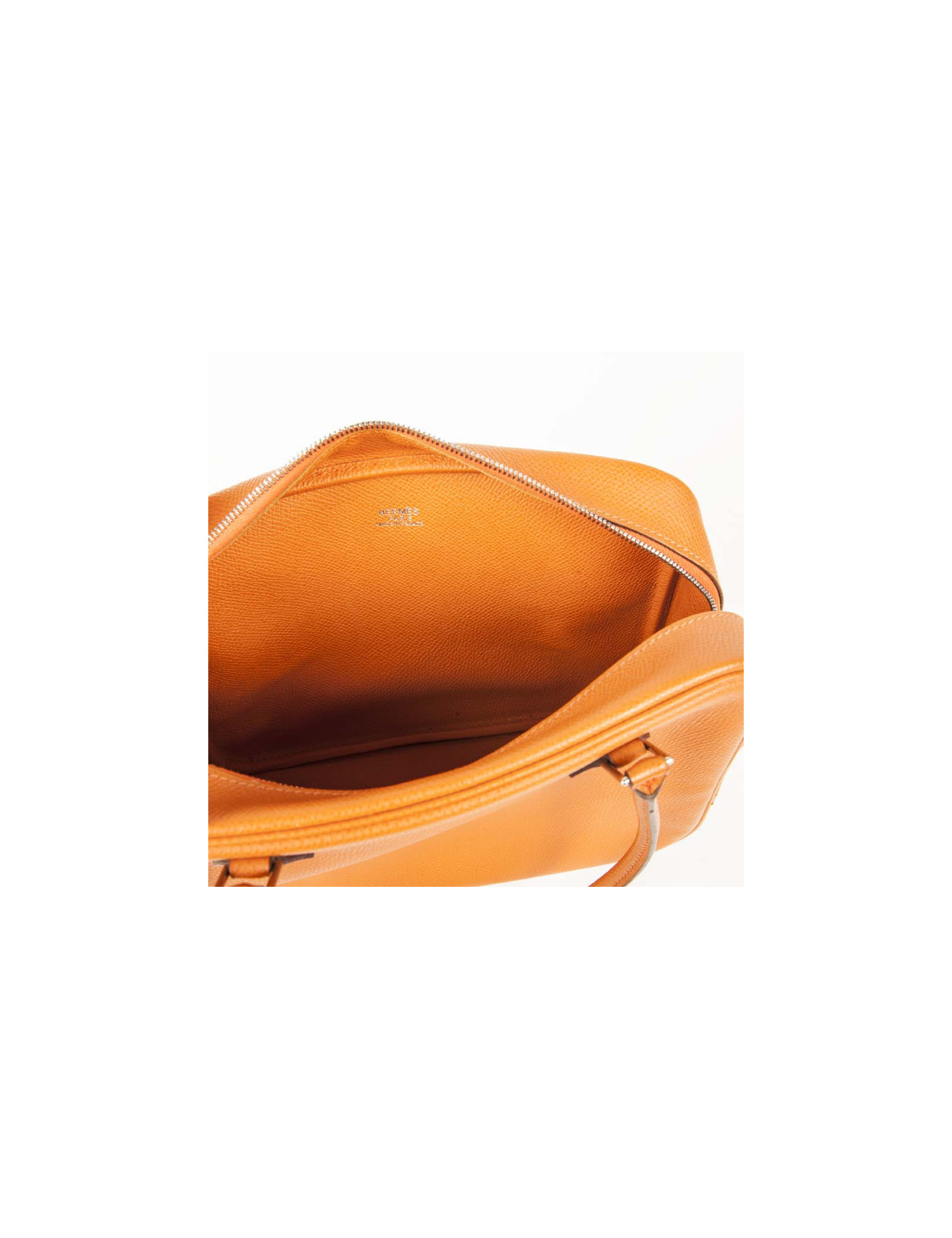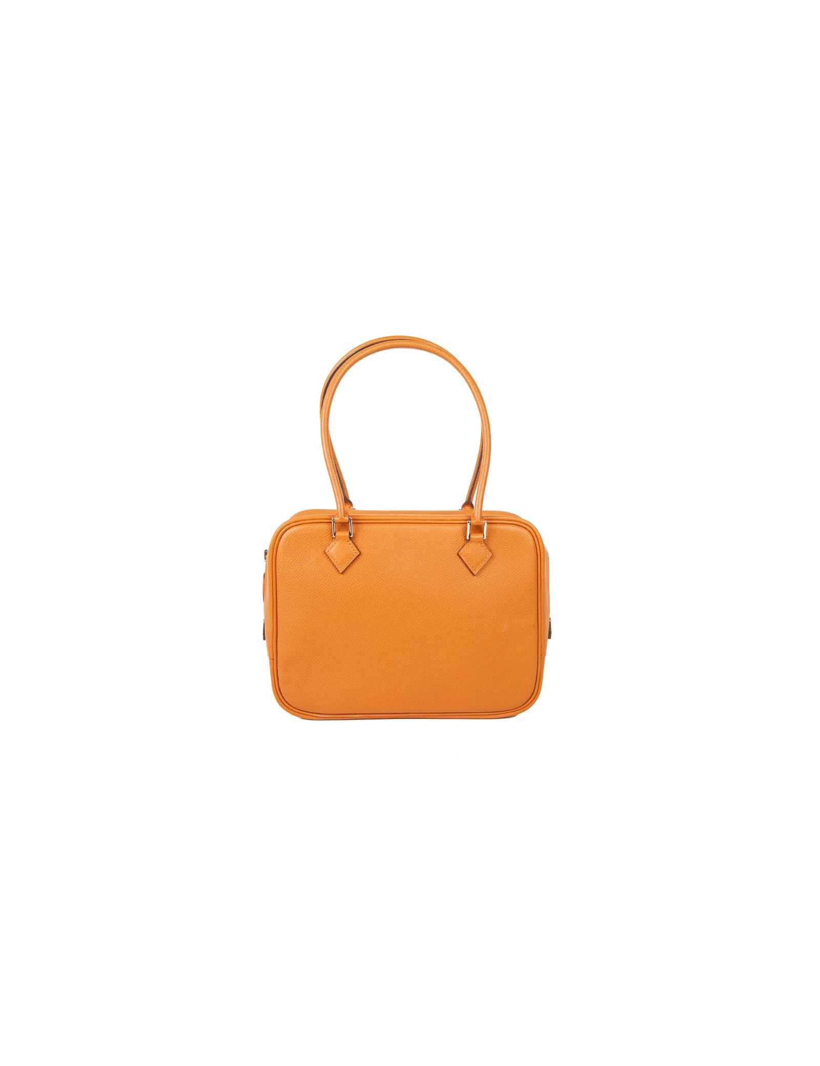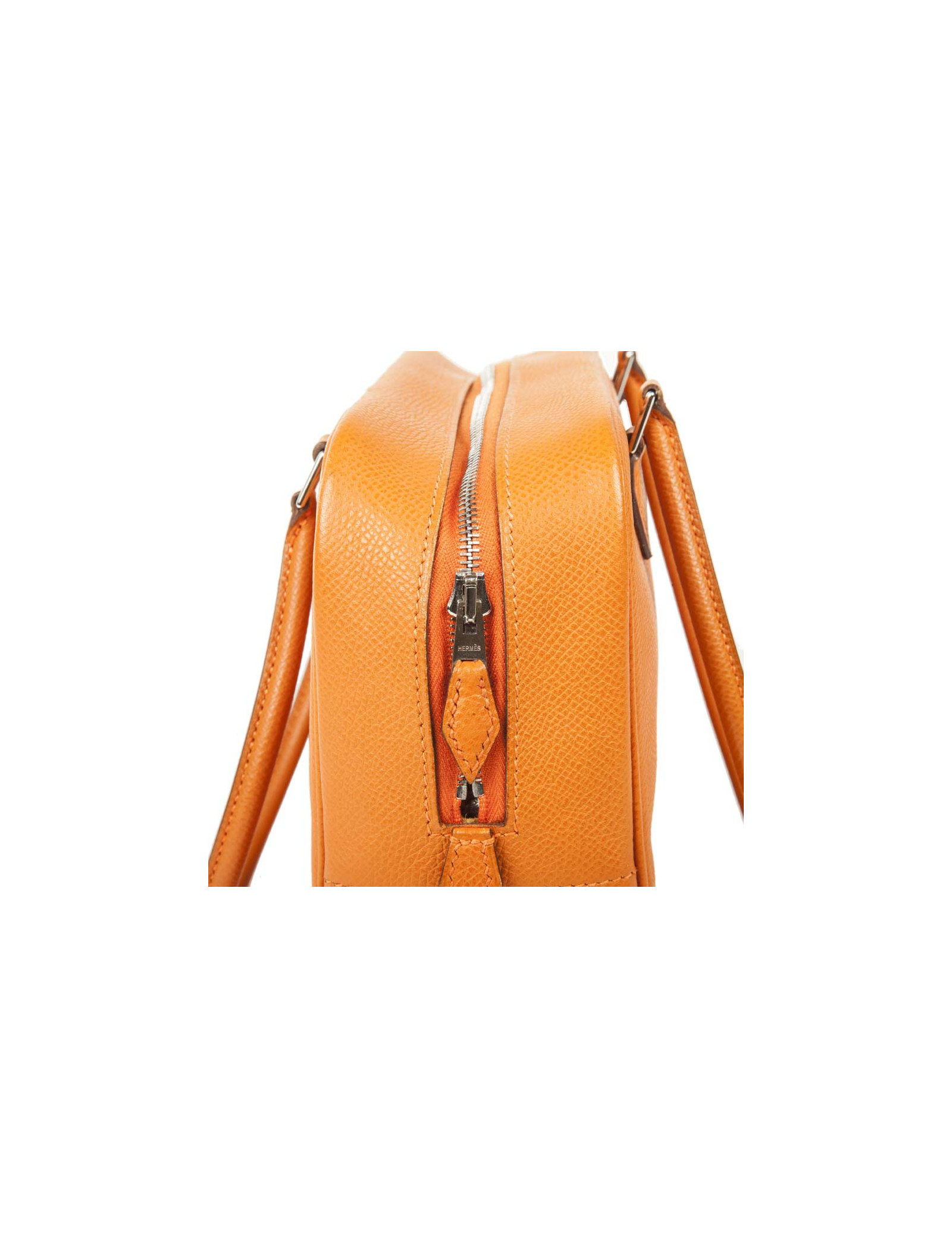 Mini sac 'Plume' de la Maison Hermès en cuir grainé orange. Bijouterie argentée. Fermeture zippée. Lettre H dans un carré (sous la languette droite extérieure). En très bon état. Très légère usure des coins sous le sac ainsi qu'une petite marque de stylo. Il se porte au bras.